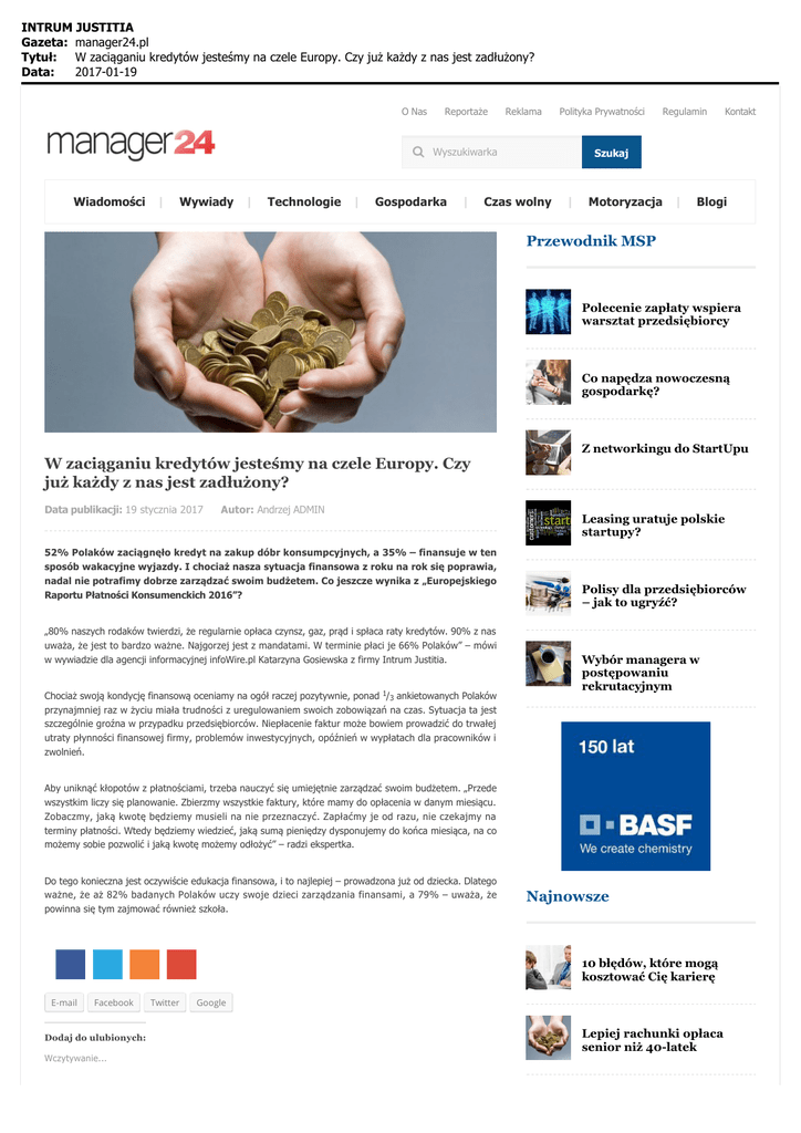 INTRUM JUSTITIA Gazeta: manager24.pl Tytuł: W zaciąganiu kredytów jesteśmy na czele Europy. Czy już każdy z nas jest zadłużony? Data: 2017-01-19 O Nas Reportaże Wyszukiwarka Wiadomości | Wywiady | Technologie Reklama Polityka Prywatności Regulamin Kontakt Szukaj | Gospodarka | Czas wolny | Motoryzacja | Blogi Przewodnik MSP Polecenie zapłaty wspiera warsztat przedsiębiorcy Co napędza nowoczesną gospodarkę? Z networkingu do StartUpu W zaciąganiu kredytów jesteśmy na czele Europy. Czy już każdy z nas jest zadłużony? Data publikacji: 19 stycznia 2017 Autor: Andrzej ADMIN 52% Polaków zaciągnęło kredyt na zakup dóbr konsumpcyjnych, a 35% – finansuje w ten sposób wakacyjne wyjazdy. I chociaż nasza sytuacja finansowa z roku na rok się poprawia, nadal nie potrafimy dobrze zarządzać swoim budżetem. Co jeszcze wynika z „Europejskiego Raportu Płatności Konsumenckich 2016”? „80% naszych rodaków twierdzi, że regularnie opłaca czynsz, gaz, prąd i spłaca raty kredytów. 90% z nas uważa, że jest to bardzo ważne. Najgorzej jest z mandatami. W terminie płaci je 66% Polaków” – mówi w wywiadzie dla agencji informacyjnej infoWire.pl Katarzyna Gosiewska z firmy Intrum Justitia. Chociaż swoją kondycję finansową oceniamy na ogół raczej pozytywnie, ponad 1/3 ankietowanych Polaków przynajmniej raz w życiu miała trudności z uregulowaniem swoich zobowiązań na czas. Sytuacja ta jest szczególnie groźna w przypadku przedsiębiorców. Niepłacenie faktur może bowiem prowadzić do trwałej utraty płynności finansowej firmy, problemów inwestycyjnych, opóźnień w wypłatach dla pracowników i zwolnień. Leasing uratuje polskie startupy? Polisy dla przedsiębiorców – jak to ugryźć? Wybór managera w postępowaniu rekrutacyjnym Aby uniknąć kłopotów z płatnościami, trzeba nauczyć się umiejętnie zarządzać swoim budżetem. „Przede wszystkim liczy się planowanie. Zbierzmy wszystkie faktury, które mamy do opłacenia w danym miesiącu. Zobaczmy, jaką kwotę będziemy musieli na nie przeznaczyć. Zapłaćmy je od razu, nie czekajmy na terminy płatności. Wtedy będziemy wiedzieć, jaką sumą pieniędzy dysponujemy do końca miesiąca, na co możemy sobie pozwolić i jaką kwotę możemy odłożyć” – radzi ekspertka. Do tego konieczna jest oczywiście edukacja finansowa, i to najlepiej – prowadzona już od dziecka. Dlatego ważne, że aż 82% badanych Polaków uczy swoje dzieci zarządzania finansami, a 79% – uważa, że powinna się tym zajmować również szkoła. Najnowsze 10 błędów, które mogą kosztować Cię karierę E-mail Facebook Dodaj do ulubionych: Wczytywanie... Twitter Google Lepiej rachunki opłaca senior niż 40-latek INTRUM JUSTITIA Gazeta: manager24.pl Tytuł: W zaciąganiu kredytów jesteśmy na czele Europy. Czy już każdy z nas jest zadłużony? Data: 2017-01-19 Niemiecki kryzys zagrozi polskim firmom Giełda GPW (2017-01-19 16:49) WIG 53545.61 +0,21% WIG20 2010.26 +0,23% mWIG40 4418.29 +0,36% sWIG80 14575.25 -0,35% Wspierane przez Money.pl Kursy walut NBP 2017-01-19 USD 4,1014 +0,35% EUR 4,3741 +0,08% CHF 4,0797 -0,00% GBP 5,0503 +0,30% Wspierane przez Money.pl Surowce - notowania online Nazwa Jednostka Wartość [USD] Zmiana Ostatnia zmiana Złoto uncja 1199,10 -0,38% [16:37] Ropa brent baryłka 54,52 +0,46% [16:37] Pallad uncja 749,67 +0,13% [16:37] Platyna uncja 954,90 -1,23% [16:37] Srebro uncja 16,84 -1,41% [16:37] Wspierane przez Money.pl INTRUM JUSTITIA Gazeta: manager24.pl Tytuł: W zaciąganiu kredytów jesteśmy na czele Europy. Czy już każdy z nas jest zadłużony? Data: 2017-01-19 Forex CHF / PLN 4,0732 +0,14% [16:58] EUR / JPY 122,3010 +0,41% [16:58] EUR / PLN 4,3682 +0,26% [16:58] USD / JPY 115,3220 +0,68% [16:58] USD / PLN 4,1187 +0,59% [16:58] Wspierane przez Money.pl Raporty Kooperatywy spożywcze staną się alternatywą dla marketów? Coraz więcej Polaków tak kupuje Tylko w Europie współpraca drobnych gospodarstw rolnych bezpośrednio z konsumentami obejmuje ponad 500 tys. odbiorców. Dzień Nauczyciela. ZNP chce zaostrzenia protestów, Solidarność walczy o nowe przywileje Budowa dróg w Polsce zahamowała. Jeśli przetargi nie ruszą, możemy stracić część unijnych miliardów Największe kary KNF. Te firmy musiały zapłacić miliony złotych Lokaty bankowe: czym są, jak różni się ich oprocentowanie, jak na nich oszczędzać? Rząd mógłby zlikwidować bukmacherskie podziemie i zyskać 1,4 mld zł Wspierane przez Money.pl Wiadomości z kraju GUS poda ważne dane. Będzie zaskoczenie? Główny Urząd Statystyczny poda w czwartek dane o produkcji przemysłowej i sprzedaży detalicznej w grudniu. Kopalnie do zamknięcia. Długi zjadają pensje Ekonomiści prognozują: w 2017 r. wzrost gospodarczy przyspieszy, spadnie bezrobocie Innowacyjność w Polsce. Awansowaliśmy w ważnym rankingu Sąd po stronie frankowych kredytobiorców Zamiast wyrzucić, naprawią. Szwedzki sposób na środowisko i gospodarkę Wspierane przez Money.pl Wiadomości ze świata 47. Światowe Forum Ekonomiczne w Davos. Dominować będą Chiny W Davos w Szwajcarii rozpoczyna się we wtorek 47. Światowe Forum Ekonomiczne. Tegoroczne hasło forum to "Odpowiedzialne przywództwo". Po raz pierwszy w historii przyjedzie tu prezydent Chin Xi Jinping. Nie będzie natomiast reprezentantów nowej administracji Stanów Zjednoczonych, niemieckiej kanclerz Angeli Merkel i prezydenta Francji Francois Hollande'a. Nowe zasady segregowania śmieci. Zobacz, co się zmieni od lipca Wielka Brytania nie może negocjować umowy handlowej z USA Ośmiu najbogatszych ludzi ma tyle, co połowa świata Prof. Kleiber: ludzie, którzy nie opanują nowych technologii, są jak bomba z tykającym zapłonem Nowy raj podatkowy? Brexit może doprowadzić do zmiany w Królestwie Wspierane przez Money.pl Ostatnie Komentarze Silver Silver: Jako szef zgadzam się;) inaczej moi współpracownicy by uciekli;)... INTRUM JUSTITIA Gaz