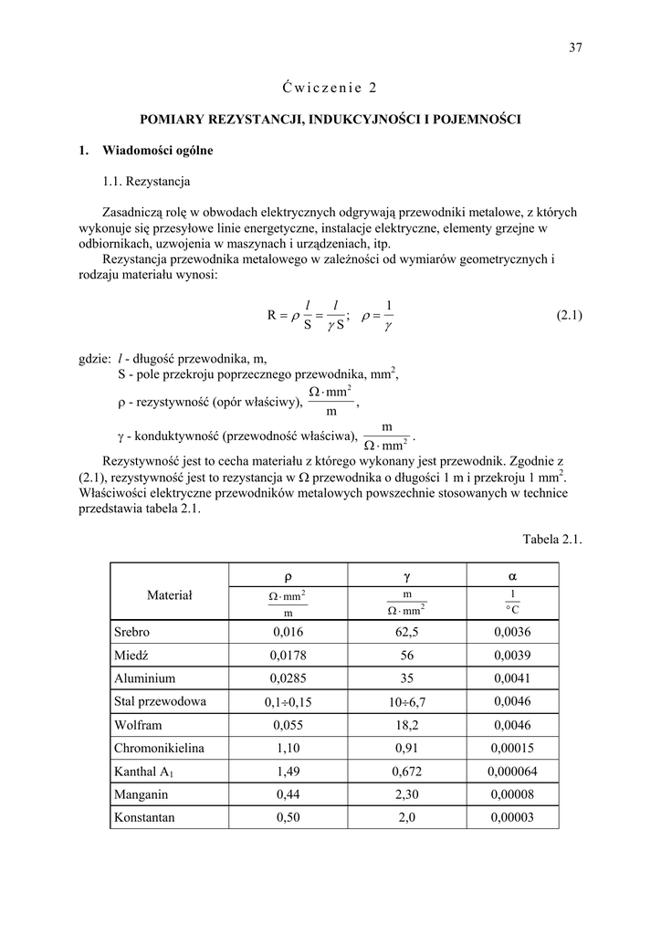 37 Ćwiczenie 2 POMIARY REZYSTANCJI, INDUKCYJNOŚCI I POJEMNOŚCI 1. Wiadomości ogólne 1.1. Rezystancja Zasadniczą rolę w obwodach elektrycznych odgrywają przewodniki metalowe, z których wykonuje się przesyłowe linie energetyczne, instalacje elektryczne, elementy grzejne w odbiornikach, uzwojenia w maszynach i urządzeniach, itp. Rezystancja przewodnika metalowego w zależności od wymiarów geometrycznych i rodzaju materiału wynosi: R=ρ l l 1 = ; ρ= S γS γ (2.1) gdzie: l - długość przewodnika, m, S - pole przekroju poprzecznego przewodnika, mm2, Ω ⋅ mm 2 ρ - rezystywność (opór właściwy), , m m γ - konduktywność (przewodność właściwa), . Ω ⋅ mm 2 Rezystywność jest to cecha materiału z którego wykonany jest przewodnik. Zgodnie z (2.1), rezystywność jest to rezystancja w Ω przewodnika o długości 1 m i przekroju 1 mm2. Właściwości elektryczne przewodników metalowych powszechnie stosowanych w technice przedstawia tabela 2.1. Tabela 2.1. ρ γ Ω ⋅ mm 2 m m Ω ⋅ mm Srebro 0,016 62,5 0,0036 Miedź 0,0178 56 0,0039 Aluminium 0,0285 35 0,0041 0,1÷0,15 10÷6,7 0,0046 Wolfram 0,055 18,2 0,0046 Chromonikielina 1,10 0,91 0,00015 Kanthal A1 1,49 0,672 0,000064 Manganin 0,44 2,30 0,00008 Konstantan 0,50 2,0 0,00003 Materiał Stal przewodowa α 2 1 °C 38 Rezystancja przewodników metalowych wraz ze wzrostem temperatury rośnie; [ ] R t = R 0 1 + α( t − t 0 ) (2.2) gdzie: Rt - rezystancja przewodnika w temperaturze t, R0 - rezystancja przewodnika w temperaturze początkowej t0, α - temperaturowy współczynnik rezystancji (tab. 2.1). Temperaturowy współczynnik rezystancji określa względną zmianę rezystancji przewodnika przy zmianie temperatury o 1°C. Zależność (2.2) pozwala określić temperaturę na przykład nagrzanego uzwojenia w maszynie, z przyrostu rezystancji: t= Rt − R0 + t0 . α R0 (2.3) W obwodach elektrycznych można wyróżnić trzy poziomy rezystancji: − rezystancja mała, R < 1Ω, (przewody), − rezystancja duża, R > 1Ω, (odbiorniki, − rezystancja bardzo duża (izolacja przewodów). Izolacja przewodów stanowi podstawową ochronę od porażeń elektrycznych. Ogólne kryterium dobroci izolacji; R i ≥ 1000 Ω . V (2.4) Oznacza to, że w instalacji o napięciu 220 V, rezystancja izolacji powinna wynosić co najmniej 220 kΩ. Do pomiarów poszczególnych rezystancji stosuje się: − rezystancje małe: metoda techniczna z poprawnie mierzonym napięciem, techniczny mostek Thomsona, miernik RLC z odczytem cyfrowym, − rezystancje duże: metoda techniczna z poprawnie mierzonym prądem, techniczny mostek Wheatstone’a, omomierz, miernik RLC, − rezystancje bardzo duże: mierniki izolacji. 1.2. Indukcyjność Indukcyjność własną cewki określa zależność; z2 L= Rµ gdzie: L - indukcyjność własna cewki, H (1H = 1Ω ⋅ 1s), z - liczba zwojów cewki, 1 Rµ - reluktancja obwodu magnetycznego, . H (2.5) 39 Reluktancja obwodu magnetycznego jednorodnego: Rµ = lśr µ ⋅ S′ (2.6) gdzie: lśr - średnia długość rdzenia magnetycznego, m, S ′ - powierzchnia przekroju rdzenia, m2, H . m Przenikalność magnetyczna próżni (powietrza) wynosi: H µ 0 = 4 π ⋅ 10 − 7 m Indukcyjność własna cewki decyduje: − o energii gromadzonej w cewce, µ - przenikalność magnetyczna materiału rdzenia, Wm = 1 L I2 , 2 (2.7) gdzie: Wm - energia gromadzona w cewce, J, I - natężenie prądu, A, L - indukcyjność własna cewki, H, − o wartości siły elektromotorycznej samoindukcji, di , dt (2.8) XL = 2 π f L , (2.9) es = −L di - szybkość zmian prądu w czasie, dt − o reaktancji cewki, gdzie: gdzie: XL - reaktancja cewki, Ω, f - częstotliwość prądu płynącego przez cewkę, Hz, − o stanach nieustalonych, t U − T i = 1 − e , R gdzie: i - prąd narastający w cewce włączonej do źródła prądu stałego o napięciu U, R - rezystancja cewki, L T= - stała czasowa cewki, sek, R − o częstotliwości rezonansowej fr w połączeniu szeregowym z kondensatorem o pojemności C, (2.10) 40 fr = 1 2 π LC . (2.11) Dla cewki bez rdzenia ferromagnetycznego (cewka powietrzna) jej indukcyjność jest stała. Dla cewki z rdzeniem ferromagnetycznym, indukcyjność jej jest zmienna i zależy: od rodzaju ferromagnetyka, indukcji magnetycznej w rdzeniu jak też od wykonania obwodu magnetycznego (rdzeń ze szczeliną powietrzną). Indukcyjność własna cewki może być zmierzona bezpośrednio lub wyznaczona metodami pośrednimi. Do pomiaru bezpośredniego stosuje się miernik RLC z odczytem cyfrowym. Z metod pośrednich najczęściej stosuje się metodę techniczną pozwalającą określić reaktancję cewki XL a tym samym i jej indukcyjność własną L (2.9). W tym celu cewkę zasila się ze źródła prądu przemiennego o znanej częstotliwości f i mierzy się napięcie U na cewce, prąd I płynący przez cewkę oraz moc czynną P pobieraną przez cewkę. Z= U ; I cos ϕ = P ; U⋅I X L = Z ⋅ sin ϕ ; L= XL 2πf (2.12) Dla cewki powietrznej, rezystancja wynikająca z zależności: R = Z cosϕ = P I2 (2.13) jest praktycznie rezystancją przewodu uzwojenia cewki. Dla cewki z rdzeniem ferromagnetycznym, rezystancja wyznaczona z zależności (2.13) charakteryzuje straty mocy czynnej w uzwojeniu cewki jak też w rdzeniu. 1.3. Pojemność Kondensator jest to urządzenie elektryczne składające się z dwóch przewodników metalowych (najczęściej folia aluminiowa) odizolowanych dielektrykiem. Kondensator ma zdolność gromadzenia ładunków elektrycznych. Napięcie zasilające U, ładunek Q i pojemność kondensatora C powiązane są zależnością: C= Q . U (2.14) Podstawowa jednostka pojemności elektrycznej: 1F = 1 C A⋅s =1 . V V Mniejsze jednostki: 1µF = 10 −6 F ; 1 nF = 10 −9 F ; 1 pF = 10 −12 F . 41 Pojemność kondensatora płaskiego: C= ε ⋅ S′ , d (2.15) gdzie: S ′ - powierzchnia jednej okładziny, m2, d - grubość dielektryka, m, F ε - stała elektryczna dielektryka, . m Przenikalność ele