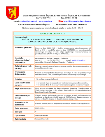 Urząd Miejski w Stroniu Śląskim, 57-550 Stronie Śląskie, ul. Kościuszki 55 tel. 74/ 811-77-11 fax. 74/ 811-77-32 e-mail: [email protected] www.stronie.pl GBS w Strzelinie o/Stronie Śląskie http://bip.stronie.dolnyslask.pl 86 9588 0004 0000 1850 2000 0010 Godziny pracy urzędu: od poniedziałku do piątku w godz. 7.30 – 15.30 KARTA USŁUGI NR F.12 Nazwa usługi: DECYZJA W SPRAWIE ZWROTU PODATKU AKCYZOWEGO ZAWARTEGO W CENIE OLEJU NAPĘDOWEGO. Podstawa prawna: Ustawa z dnia 14.06.1960 r. Kodeks postępowania administracyjnego (t.j. Dz.U. z 2013 r. poz. 267), ustawy z dnia 10.03.2006 r. o zwrocie podatku akcyzowego zawartego w cenie oleju napędowego wykorzystywanego do produkcji rolnej (Dz. U. Nr 52, poz. 379 ze zm.). Komórka odpowiedzialna/ stanowisko: nazwa komórki: Referat Finansów i Podatków pok. nr 5 tel. 74/ 811-77-27 e-mail: [email protected] stanowisko: Kierownik Referatu Finansów i Podatków Załatwienie/wynik sprawy: Decyzja w sprawie zwrotu/odmowy zwrotu podatku akcyzowego zawartego w cenie oleju napędowego. Wymagane dokumenty: Wniosek o zwrot podatku akcyzowego zawartego w cenie oleju napędowego wraz z fakturami VAT, stanowiącymi dowód zakupu oleju napędowego. Opłaty: Nie podlega opłacie skarbowej. Czas załatwienia sprawy: • w terminie 1-go miesiąca od daty złoŜenia wymaganych dokumentów, • w terminie do 2-ch miesięcy w sprawach szczególnie skomplikowanych. Tryb odwoławczy: SłuŜy prawo odwołania do Samorządowego Kolegium Odwoławczego w Wałbrzychu w terminie 14 dni od daty doręczenia decyzji, za pośrednictwem Burmistrza Stronia Śląskiego. Inne informacje/ uwagi: Wnioski o zwrot podatku akcyzowego zawartego w cenie oleju napędowego składa się w okresie od dnia 01 lutego do 28(29) lutego danego roku oraz w okresie od dnia 01 sierpnia do dnia 31 sierpnia danego roku. Formularze do pobrania: Wniosek o zwrot podatku akcyzowego zawartego w cenie oleju napędowego. Data wydania: 11.09.2013 r. Edycja: C Opracował: Andrzej Konarski Zatwierdził: Tomasz Olszewski 6-3' 3+)8./!&) T);)T)) U%-7)>P? !"# !"#$%& '()*+',(-'./,01(/023)'*45'()/*/+,45'(*(24674('8491( 6/-:.'*45'(*30'+)3;,3*/645'(.'(-+'.10297(+'8649 6/(+'0 81,3 $ ;74+-74< %&'()*+,-*.)*/0+-1234)5/(.)&678/0+-*-/8+-9,/:;).1/<8=/;)56'5/ >0)*4-3?@ AAAAAAAAAAAABB C5'5/0+-1234)5/)/0&,0)6 $$ %&,6'5(5/0+5(.5D/////////////////////86'5(5/-/,.)5/EF/;5+45/GFFH/+B/&/-(+&4)*/0&,5'78/5741-&(*:&/-5(5+'*:&/(/4*.)*/&<*28//.503,&(*:&/(17&+-16'1(5.*:&/ //////////////////////////////////////////////////,&//0+&,8742)//+&<.*2//>C-B/IB//J+/KGL/0&-B/MNOL//-/0PQ.B/-;B@B/ R*+;)./67S5,5.)5/(.)&678D///////&,/,.)5/E/<8'*:&/,&/&6'5'.)*:&/,.)5/<8'*:&T/&,/,.)5/E/6)*+0.)5/,&/,.)5/ME/6)*+0.)5B U)*264*/67S5,5.)5/(.)&678D//////(P2'L/=8+;)6'+-/>0+*-1,*.'/;)56'5@/(S5V4)(1/-*/(-:<3,8/.5/;)*264*/0&S&W*.)5/:+8.'P(/=3,9414X/(/0&6)5,5.)8/<8=/ ///////////////////////////////////////////////////(60PS0&6)5,5.)8/0+&,84*.'5/+&<.*:&B "=(>"%?$@%($&ABCB!"B( !"#$&D !"##$%&'(#)*+,-.'+/#01+2/3425'#,-6.'67(#48#9'%+2:8#&2.'#.9;64653#<5-8.29 ""=((CB!%("C%!EFG"&B@F?!%( !"#$&#CB @F F"#>GAHHH ="#>6/<-.98?>6/<6#12;56 I"#AJKJLHHHH M"#>*,2+#48<84*#8.8)-.'2:8HHHH M6"#$34653#1+/2/ @"#A-2+<./2#-,-B?### ######>6/<6#.9+%C856 D"#E+*:-2#-,-B N"#G553#489*,25'#18'<-2+4/6&OC3#'8P.6,8QR#0+84/6&(#5*,2+#489*,25'*7HHHH N6"#$34653#1+/2/ S"#>*,2+#<#T+6&8<3,#U2&2.'+/2#KO48<3,#0<#1+/31649*#:43#1+84*C25'#+8V53# 184V2:6#<1-.8<-#48#'2:8#+2&2.'+*7 """=((>"%?$@%(HB>"%$H&B!"B("(BCI%$(J($"%CH"KB("(BCI%$(LI#CD@%!EB(I#M!%N# ! "#A6_.'<8 !!"#$8&2<%4/'<8 !="#A8<-6' !@"#`,-56 !D"#[V-C6 !F"#>+#48,* !M"#a-2&.C8<8QR !N"#T84#18C/'8<3 !S"#A8C/'6 "O=(#P "BC@H%!"%(#(L# "%IH@Q!"(DRFE&S (I#M!F@Q X5 YV()5,4-5;L/W*/2*6'*;/0&6)5,54-*;/8W1'7P(/+&<.14X/&/0&()*+-4X.) (60PS0&6)5,54-*;/8W1'7P(/+&<.14X/&/0&()*+-4X.) :+8.'P(/)/=8,1.7P(/(:/6'5.8/.5/,-)*Z/E/<8'*:& !I"#>+#V896V* X5 5 5L &7+*V<&.*2/(/*(),*.42) +&78L/(17&+-16'1(5.14X/,&/0+&,8742)/+&<.*2L 0&S&W&.14X/.5/&=6-5+-*/:;).1 O=("!G#I>B@?B(#(HBAT@H!"&B@Q = "#L-C/)6#/6;OC/5-9%<HHHHH H## W6/56C/3R#<#1+/31649*#<5-8.9*#8#/<+8'#1846'9*#/6#89+2.#84#45-6#!#.-2+15-6#48#45-6#@!#.'3C/5-6"# HH#########W6/56C/3R#<#1+/31649*#<5-8.9*#8#/<+8'#1846'9*#/6#89+2.#84#45-6#!#V*'2:8#48#45-6#@!#V-1C6" HHH A846&O#'2#184,-8'3(#9'%+2#.O#8)8<-O/652#18.-646R#>GA#56#184.'6<-2#1+/21-.%<#*.'6<3#/#45-6#!@#16X4/-2+5-96#!SSF#+"# ##########8#/6.646CY#2<-425C&-#-#-425'3Z-96C&-#1846'5-9%<#-#1;6'5-9%<#0E/"#["#/#= !=#+"#18/"#!@!D#8+6/#/#= !@#+"#18/"#=7" HHHH####A846R#5*,2+#AJKJL#6V)8#5*,2+#48<84*#8.8)-.'2:8#6V)8#+84/6&#-#5*,2+#-552:8#489*,25'*#18'<-2+4/6&OC2:8#'8P.6,8QR" HHHHH##A846R#V-C/)B#Z69'*+#\]^#6V)8#-CY#981--"# UJV 6-3' 3+)8./!&) T)=)T)) ?@>!A-&7;,'(/( U%-7)>P? !"#!$"!%&'"()*+# ,)'"-!$"!%&'"()*+# "#$%&'()*+%(%,-./012342%*,'(56%.(70586%,%9(5:,12 &'()*+%(%.'*280*0342%*,'(56%.(70586%30%'01;6328%<038(,"##$%=>?@A%ABCD>=E>%FB=EGH@IG%J,%.'*-.0786%.'*2K2,6%*,'(56%.(70586%30%'01;6328%<038(,-L ??>!B-,*(5/4!(!(8(CD'-,*-!4+-,!-.+%5!$45(-.-;,-!+-;E0'/0 ?I>!B-,*-!$%&'-!H-'/0 ?F>!G%&'#!'08%+!+-;E0'/0!H-'/4*%24 "###$%MIGNB%HO&PQ&GO#BNBCMR%=B%HR&QBST%MHAGS>%&GNBSE> ./ 5)6)7$)$(!"#)8*9/ 5:!;!$)$<9:<)8/ 5)6)7$)$(!"#)8*9/ 5:!;!$)$<9:<)8/ 5)6)7$)$(!"#)8*9/ 5:!;!$)$<9:<)8/ 5)6)7$)$(!"#)8*9/ 5:!;!$)$<9:<)8/ 5)6)7$)$(!"#)8*9/ 5:!;!$)$<9:<)8/ 5)6)7$)$(!"#)8*9/ 5:!;!$)$<9:<)8/ 2/ 1/ 0/ 4/ 3/ !"#$%&'!()*+,-!( !"#$%&'$()*+,./*'0$0,*(#*12*13453#*136$%$0#$*7$61'8"8&9*:!"#$%&',;*"80#3$<2&,*'*$=5>*?@A*B*.*C:%,314*3$=0,D:E ?/*'0$0,*(#*12*'$1$%8*F='8'0$"$0#$*'"=:54*F:%$534*$3&8':",D:*'$"$=5,D:*"*&,0#,*:G,<4*0$FH%:",D:*"83:='8158"$0,D:*%:* ****F=:%43&<#*=:G0,<> !"#$%&%#'#()*('+#,-')+.)*%,/0 %$5$*"8F,60#,0#$*"0#:134 I%'#,;*J (#,1#2&*J =:3/ &'85,G08*F:%F#1*"0#:13:%$"&8 "#$()-%.(*/,$01+2)0$34!-564!(7.( 1"#2,%3' !"#$%&'()!*!$+,#$-./01!2.#!2+0'3#!245$4.-+53*-!+46'%24!53-'4*(7!$+,%.8(43!*5$9&$45(-.-'(-!:'(%!.43#;,#!*5$9&8-&<4'/9*=> !