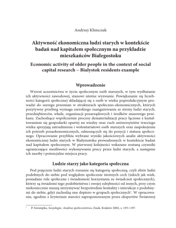 Andrzej Klimczuk Aktywność ekonomiczna ludzi starych w kontekście badań nad kapitałem społecznym na przykładzie mieszkańców Białegostoku Economic activity of older people in the context of social capital research – Bialystok residents example Wprowadzenie Wzrost uczestnictwa w życiu społecznym osób starszych, w tym wydłużanie ich aktywności zawodowej, stanowi istotne wyzwanie. Powiększanie się liczebności kategorii społecznej składającej się z osób w wieku poprodukcyjnym prowadzi do szeregu przemian w strukturach społeczno-ekonomicznych, których pozytywny przebieg wymaga szerokiego zaangażowania ze strony ludzi starych, przedsiębiorców, władz, organizacji pozarządowych i środków masowego przekazu. Zachodzące współcześnie procesy dematerializacji pracy łączone z kształtowaniem się gospodarki opartej na wiedzy oraz ruch uniwersytetów trzeciego wieku sprzyjają zatrudnieniu i wolontariatowi osób starszych oraz zaspokojeniu ich potrzeb pozaekonomicznych, odnoszących się do pozycji i statusu społecznego. Opracowanie przybliża wybrane wyniki jakościowych analiz aktywności ekonomicznej ludzi starych w Białymstoku prowadzonych w kontekście badań nad kapitałem społecznym. W pierwszej kolejności wskazane zostaną czynniki ograniczające możliwości wykonywania pracy przez ludzi starych, a następnie ich zasoby i potencjalne miejsca pracy. Ludzie starzy jako kategoria społeczna Pod pojęciem ludzi starych rozumie się kategorię społeczną, czyli zbiór ludzi podobnych do siebie pod względem społecznie istotnych cech (takich jak wiek, posiadane role społeczne i świadomość korzystania ze świadczeń społecznych), którzy są świadomi tego podobieństwa i swojej odrębności od innych, przy czym niekoniecznie muszą utrzymywać bezpośrednie kontakty i interakcje z podobnymi do siebie, gdyż zachodzą one dopiero w grupach społecznych1. W opracowaniu, zgodnie z kryterium starości zaproponowanym przez ekspertów Światowej 1 P. Sztompka, Socjologia. Analiza społeczeństwa, Znak, Kraków 2002, s. 193 i 197. 290 Andrzej Klimczuk Organizacji Zdrowia2 przyjmuje się, iż ludzie starzy to osoby, które przekroczyły 60. rok życia. Założenie to stanowi uproszczenie przyjęte na potrzeby dalszych analiz. Uznaje się bowiem, iż istnieje wiele „progów starości” – wydarzeń rozpoczynających ostatni etap życia człowieka3. Poza wiekiem ekonomicznym odnoszącym się do miejsca jednostki w podziale pracy i wiekiem socjalnym określanym terminem otrzymania przez obywatela prawa do świadczeń socjalnych takich, jak renty i emerytury, wskazuje się też na wiek biologiczny (sprawność organizmu), demograficzny (liczba przeżytych lat), psychiczny (sprawność funkcji intelektualnych, zmysłów i zdolności przystosowawczych) oraz społeczny (wypełnianie ról oczekiwanych od osób starszych). Przykładem rozbieżności między „progami” są różnorodne postawy poszczególnych osób wobec odejścia od pracy zawodowej i rezygnacji z pełnionych wcześniej ról społecznych, które oddziałują na ich jakość życia w okresie starości4. Należy przy tym wspomnieć, iż jednym z następstw industrializacji w XIX wieku było wyparcie pracy starszych rzemieślników przez produkcję przemysłową, a pierwsze renty i emerytury miały służyć ich łagodnemu odsunięciu z rynku pracy5. Z czasem przywilej stał się rozwiązaniem powszechnym wprowadzanym też w innych krajach, przy czym w kolejnych latach progi wieku emerytalnego rzadko były zmieniane, choć wzrastała długość życia. W drugiej połowie XX wieku dostrzeżono, że przejście na emeryturę jest nie tylko równoznaczne z zakończeniem pracy zawodowej, ale przy niskiej wartości świadczeń pociąga za sobą też obniżenie poziomu życia („bankructwo emerytalne”), a w skrajnych przypadkach staje się przyczyną popełniania samobójstw („śmierć emerytalna”). W okresie tym wprowadzono pierwsze wskaźniki statystyczne do analizy procesu starzenia się społeczeństw i pojęcie starości demograficznej. E. Rosset zakłada, że starość demograficzna to zjawisko społeczne występujące, gdy ponad 12% członków populacji przekroczy wiek 60 lat6. Ludność Polski poziom ten osiągnęła w 1967 roku. Rozwój zjawiska ilustruje się wskaźnikiem „obciążenia” ludności w wieku produkcyjnym (18-59 lat dla kobiet/64 lat dla mężczyzn) ludnością w wieku poprodukcyjnym (60 lat i więcej/65 lat i więcej), przy czym zakłada się, iż ze wzrostem wartości wskaźnika dostrzega się negatywne zmiany w relacjach społecznych. 2 3 4 5 6 Raport o Rozwoju Społecznym. Polska 1999. Ku godnej aktywnej starości, UNDP, Warszawa 1999, s. 7. B. Szatur-Jaworska, Ludzie starzy i starość w polityce społecznej, ASPRA-JR, Warszawa 2000, s. 34-37. E. Trafiałek, Życie na emeryturze w warunkach polskich przemian systemowych, WSP, Kielce 1998, s. 29. E. Rosset, Miejsce człowieka starego w społeczeństwie, [w:] Encyklopedia seniora, Wiedza Powszechna, Warszawa 1986, s. 20-34. M. Okólski, Demografia, Scholar, Warszawa 2004, s. 154-155. Aktywność ekonomiczna ludzi starych w kontekście... 291 W przypadku Białegostoku – największego miasta północno-wschodniej Polski, stanowiącego stolicę województwa podlaskiego – próg starości demograficznej został przekroczony w 1989 roku. Od tamtej pory udział ludzi starych w populacji mieszkańców rośnie przy jednoczesnym zmniejszaniu się liczby osób w wieku przedprodukcyjnym. W 1988 roku osoby po 60. roku życia stanowiły blisko 12% mieszkańców miasta, w 2008 zaś już 17,8%7. W 2030 roku ludzie starzy mogą stanowić już 31% tej populacji, a co za tym idzie, obciążenie ekonomiczne osobami w wieku nieprodukcyjnym wzrośnie o jedną piątą8. Poza wzrostem wydatków publicznych na utrzymanie ludzi starych skutkami tego procesu będą m.in. feminizacja populacji, wzrost zapotrzebowania na usługi opieki społe