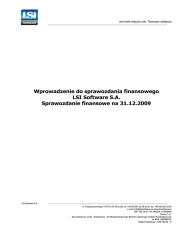 Jest wiele dróg do celu. Tworzymy najlepszą Wprowadzenie do sprawozdania finansowego LSI Software S.A. Sprawozdanie finansowe na 31.12.2009 LSI Software S.A. ul. Przybyszewskiego 176/178, 93-120 Łódź, tel. +48 042 663 22 90 do 98, fax. +48 042 663 22 99 e-mail: [email protected], www.lsisoftware.pl NIP: 725-16-97-775, REGON: 472048449 Strona 1 z 7 Sąd rejestrowy: Łódź - Śródmieście - XX Wydział Krajowego Rejestru Sądowego, Rejestr Przedsiębiorców Nr KRS: 0000059150 Kapitał zakładowy: 3 260 762,00 zł Jest wiele dróg do celu. Tworzymy najlepszą 1. Dane podstawowe LSI SOFTWARE SPÓŁKA AKCYJNA z siedzibą w Łodzi ul. Przybyszewskiego 176/178 Spółka Akcyjna LSI Software S.A. z siedzibą w Łodzi przy ul. Przybyszewskiego 176/178 jest zarejestrowana w Krajowym Rejestrze Sądowym w rejestrze przedsiębiorców pod nr KRS 0000059150 prowadzonym przez Sąd Rejonowy dla Łodzi - Śródmieścia w Łodzi XX Wydział Krajowego Rejestru Sądowego. Podstawowym przedmiotem działalności przedsiębiorstwa jest: Działalność w zakresie oprogramowania pozostała 72.22 Z LSISOFT / LSI / PLLSSFT00016 Informatyka Rynek Podstawowy 5 MINUS Czas trwania działalności przedsiębiorstwa jest nieoznaczony. Sprawozdanie finansowe LSI Software S.A. sporządzone zostało za okres od 01.01.2009 do 31.12.2009r. Okres porównywalny od 01.01.2008 do 31.12.2008r. 2. Zasady wyceny Sprawozdanie finansowe Spółki LSI Software S.A. z siedzibą w Łodzi ul. Przybyszewskiego 176/178 jest sprawozdaniem jednostkowym. Sprawozdanie zostało sporządzone przy założeniu kontynuacji działalności gospodarczej w dającej się przewidzieć przyszłości i nie istnieją okoliczności wskazujące na zagrożenie kontynuowania przez nie działalności. Grupę kapitałową LSI Software stanowi: Jednostka dominująca LSI Software S.A, Jednostka zależna Softech Sp. z o.o., Horeca Online Sp. z o.o. Jednostki powiązane to te, w odniesieniu, do których Grupa ma zdolność kierowania ich polityką finansową i operacyjną poprzez powiązania kapitałowe i osobowe. Jednostki zależne Softech Sp. z o.o. i Horeca Online Sp. z o.o. podlegają konsolidacji metodą pełną od dnia przejęcia nad nimi kontroli przez Grupę. Zaprzestanie konsolidowania następuje z dniem ustania kontroli. Koszt przejęcia ustala się, jako wartość godziwą przekazanych aktywów, wyemitowanych instrumentów kapitałowych oraz zobowiązań zaciągniętych lub przejętych na dzień wymiany, powiększoną o koszty bezpośrednio związane z przejęciem. Nadwyżkę kosztu przejęcia nad wartością godziwą udziału w możliwych do zidentyfikowania przejętych aktywach netto ujmuje się, jako wartość firmy. Utratę wartości firmy dokonuje się w ciężar kosztów Grupy. Jeżeli koszt przejęcia jest niższy od wartości godziwej aktywów netto przejętej jednostki (goodwill), różnice ujmuje się bezpośrednio w rachunku zysków i strat. Transakcje, rozrachunki i niezrealizowane zyski/straty na transakcjach pomiędzy jednostkami grupy są eliminowane, z zachowaniem zasady istotności. Zasady rachunkowości stosowane przez jednostki Grupy są ujednolicone w zakresie pokrywających się działalności. Przypadki występowania różnic stosowanych zasad LSI Software S.A. ul. Przybyszewskiego 176/178, 93-120 Łódź, tel. +48 042 663 22 90 do 98, fax. +48 042 663 22 99 e-mail: [email protected], www.lsisoftware.pl NIP: 725-16-97-775, REGON: 472048449 Strona 2 z 7 Sąd rejestrowy: Łódź - Śródmieście - XX Wydział Krajowego Rejestru Sądowego, Rejestr Przedsiębiorców Nr KRS: 0000059150 Kapitał zakładowy: 3 260 762,00 zł Jest wiele dróg do celu. Tworzymy najlepszą rachunkowości w poszczególnych jednostkach objętych konsolidacją eliminowane są poprzez korekty konsolidacyjne doprowadzające do ujednolicenia zasad wyceny aktywów i pasywów oraz ustalenia wyniku finansowego. Rzeczowe aktywa trwałe Rzeczowe aktywa trwałe obejmują budynki i budowle, w tym inwestycje w obcych obiektach, maszyny i urządzenia, sprzęt komputerowy, środki transportu i inne środki trwałe. Budynki i budowle (za wyjątkiem nakładów w obcych obiektach), po początkowym ujęciu w wartości godziwej, wykazuje się w cenie nabycia stanowiącej równowartość zakładanego kosztu, pomniejszonego o umorzenie. Rzeczowe aktywa trwałe wykazano według historycznej ceny nabycia lub kosztu wytworzenia po pomniejszeniu o umorzenie. Zdaniem Emitenta wartość bilansowa rzeczowych składników majątku trwałego nie odbiega zasadniczo od wartości godziwej. Późniejsze nakłady uwzględnia się w wartości bilansowej danego środka trwałego lub ujmuje, jako odrębny środek trwały, w przypadku znaczących różnic w okresach ekonomicznej użyteczności wyodrębnionych części środka trwałego. Wszelkie pozostałe wydatki na naprawę i konserwację odnoszone są do rachunku zysków i strat. Środki trwałe umarzane są metodą liniową począwszy od miesiąca ich gotowości do eksploatacji, w okresie odpowiadającym szacowanemu okresowi ich ekonomicznej użyteczności z wyłączeniem wartości rezydualnej. Wartości niematerialne Wartości niematerialne obejmują nabyte prawa majątkowe oraz koszty zakończonych prac rozwojowych, użytkowane przez jednostkę. Pozostałe wartości niematerialne wyceniane są według historycznej ceny nabycia po pomniejszeniu o umorzenie, ponieważ zdaniem Spółki ich wartość bilansowa nie odbiega zasadniczo od wartości godziwej. Wartości niematerialne amortyzowane są metodą liniową w okresie przewidywanej ekonomicznej użyteczności, wartość rezydualna ma charakter pomijalny. Leasing Umowy leasingu finansowego są aktywowane na dzień rozpoczęcia leasingu w wartości godziwej przedmiotu leasingu lub w kwocie równej wartości bieżącej minimalnych opłat leasingowych, jeżeli jest ona niższa od wartości godziwej. Późniejsza wycena następuje według wartości bieżącej przyszłych minimalnych opłat leasing