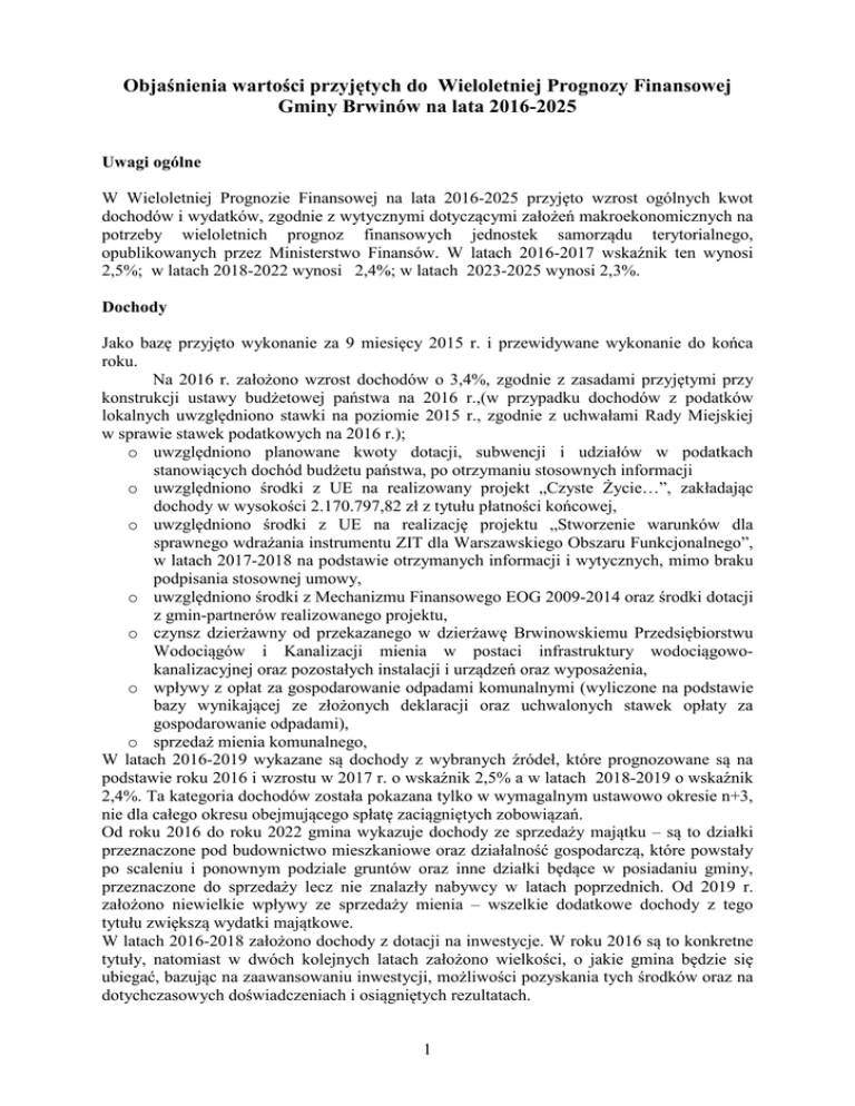 Objaśnienia wartości przyjętych do Wieloletniej Prognozy Finansowej Gminy Brwinów na lata 2016-2025 Uwagi ogólne W Wieloletniej Prognozie Finansowej na lata 2016-2025 przyjęto wzrost ogólnych kwot dochodów i wydatków, zgodnie z wytycznymi dotyczącymi założeń makroekonomicznych na potrzeby wieloletnich prognoz finansowych jednostek samorządu terytorialnego, opublikowanych przez Ministerstwo Finansów. W latach 2016-2017 wskaźnik ten wynosi 2,5%; w latach 2018-2022 wynosi 2,4%; w latach 2023-2025 wynosi 2,3%. Dochody Jako bazę przyjęto wykonanie za 9 miesięcy 2015 r. i przewidywane wykonanie do końca roku. Na 2016 r. założono wzrost dochodów o 3,4%, zgodnie z zasadami przyjętymi przy konstrukcji ustawy budżetowej państwa na 2016 r.,(w przypadku dochodów z podatków lokalnych uwzględniono stawki na poziomie 2015 r., zgodnie z uchwałami Rady Miejskiej w sprawie stawek podatkowych na 2016 r.); o uwzględniono planowane kwoty dotacji, subwencji i udziałów w podatkach stanowiących dochód budżetu państwa, po otrzymaniu stosownych informacji o uwzględniono środki z UE na realizowany projekt „Czyste Życie…”, zakładając dochody w wysokości 2.170.797,82 zł z tytułu płatności końcowej, o uwzględniono środki z UE na realizację projektu „Stworzenie warunków dla sprawnego wdrażania instrumentu ZIT dla Warszawskiego Obszaru Funkcjonalnego”, w latach 2017-2018 na podstawie otrzymanych informacji i wytycznych, mimo braku podpisania stosownej umowy, o uwzględniono środki z Mechanizmu Finansowego EOG 2009-2014 oraz środki dotacji z gmin-partnerów realizowanego projektu, o czynsz dzierżawny od przekazanego w dzierżawę Brwinowskiemu Przedsiębiorstwu Wodociągów i Kanalizacji mienia w postaci infrastruktury wodociągowokanalizacyjnej oraz pozostałych instalacji i urządzeń oraz wyposażenia, o wpływy z opłat za gospodarowanie odpadami komunalnymi (wyliczone na podstawie bazy wynikającej ze złożonych deklaracji oraz uchwalonych stawek opłaty za gospodarowanie odpadami), o sprzedaż mienia komunalnego, W latach 2016-2019 wykazane są dochody z wybranych źródeł, które prognozowane są na podstawie roku 2016 i wzrostu w 2017 r. o wskaźnik 2,5% a w latach 2018-2019 o wskaźnik 2,4%. Ta kategoria dochodów została pokazana tylko w wymagalnym ustawowo okresie n+3, nie dla całego okresu obejmującego spłatę zaciągniętych zobowiązań. Od roku 2016 do roku 2022 gmina wykazuje dochody ze sprzedaży majątku – są to działki przeznaczone pod budownictwo mieszkaniowe oraz działalność gospodarczą, które powstały po scaleniu i ponownym podziale gruntów oraz inne działki będące w posiadaniu gminy, przeznaczone do sprzedaży lecz nie znalazły nabywcy w latach poprzednich. Od 2019 r. założono niewielkie wpływy ze sprzedaży mienia – wszelkie dodatkowe dochody z tego tytułu zwiększą wydatki majątkowe. W latach 2016-2018 założono dochody z dotacji na inwestycje. W roku 2016 są to konkretne tytuły, natomiast w dwóch kolejnych latach założono wielkości, o jakie gmina będzie się ubiegać, bazując na zaawansowaniu inwestycji, możliwości pozyskania tych środków oraz na dotychczasowych doświadczeniach i osiągniętych rezultatach. 1 Wydatki Jako bazę przyjęto wykonanie za 9 miesięcy 2015 r. i przewidywane wykonanie do końca roku. Na 2016 r. założono wzrost wydatków o 1,7%, zgodnie z zasadami przyjętymi przy konstrukcji ustawy budżetowej państwa na 2016 r.. W wydatkach bieżących założono maksymalne oszczędności przy jednoczesnym uwzględnieniu wzrostu wydatków bieżących, spowodowanych kosztami utrzymania oddawanych do użytku inwestycji kubaturowych. Przewidziano wzrost wynagrodzeń na poziomie ok. 3,5% w stosunku do 2015 r. (nie uwzględnione zostały podwyżki dla nauczycieli). Wydatki majątkowe stanowią, w przeważającej wielkości, zapisane w dotychczasowym załączniku limitów na wieloletnie zadania inwestycyjne oraz w uchwalonym w 2014 r. Wieloletnim Planie Inwestycyjnym. Wśród wydatków bieżących jak i inwestycyjnych zabezpieczono środki na zadania realizowane w ramach Funduszu sołeckiego. Ponadto zabezpieczono wkład własny na realizację projektu „Umiem pływać”, na który złożony został wniosek i który jest realizowany w gminie od kilku lat. W 2015 r. oddana została inwestycja rozbudowy Zespołu Szkół w Otrębusach – budynku gimnazjum, co powoduje wzrost kosztów utrzymania tego obiektu. Wydatki na obsługę długu zaplanowano na podstawie harmonogramów spłat kredytów i pożyczek już zaciągniętych oraz planowanych do zaciągnięcia. Wprowadzono wydatki w 2016 r. na projekt realizowany od 2015 r. wspólnie z dwiema sąsiednimi gminami ze środków Mechanizmu Finansowego EOG 2009-2014. Wprowadzono zmiany klasyfikacji budżetowej, zgodnie z Rozporządzeniem Ministra Finansów z dnia 24.06.2015 r. (Dz. U. z 2015 r. poz. 931). W 2017 r. wydatki bieżące są zwiększane o wskaźnik 2,5%, w latach 2018-2022 o wskaźnik 2,4%, a w latach 2023-2025 o wskaźnik 2,3%, zgodnie z wytycznymi Ministerstwa Finansów. W okresie 2017-2023 środki pozostałe po odliczeniu wydatków bieżących (w tym odsetek od zaciągniętych kredytów i pożyczek) i po spłatach rat kapitałowych zaciągniętych kredytów i pożyczek przeznaczane są na wydatki majątkowe. W 2016 r. zaplanowano deficyt budżetowy w wysokości 2.844.955,80 zł na realizację wydatków majątkowych. Planuje się go pokryć wolnymi środkami w wysokości 1.197.000 zł, zaciągniętą pożyczką w wysokości 429.647,20 oraz częściowo z planowanego do zaciągnięcia kredytu w wysokości 8.000.000 zł. Pozostałość kredytu w wysokości 6.781.691,40 zł zostanie przeznaczona na spłatę wcześniej zaciągniętych zobowiązań. Od 2017 r. nie planuje się zaciągania nowych zobowiązań, pozostając przy spłacie dotychczas zaciągniętych a inwestycje realizując w ramach środków własnych. Roczna nadwy