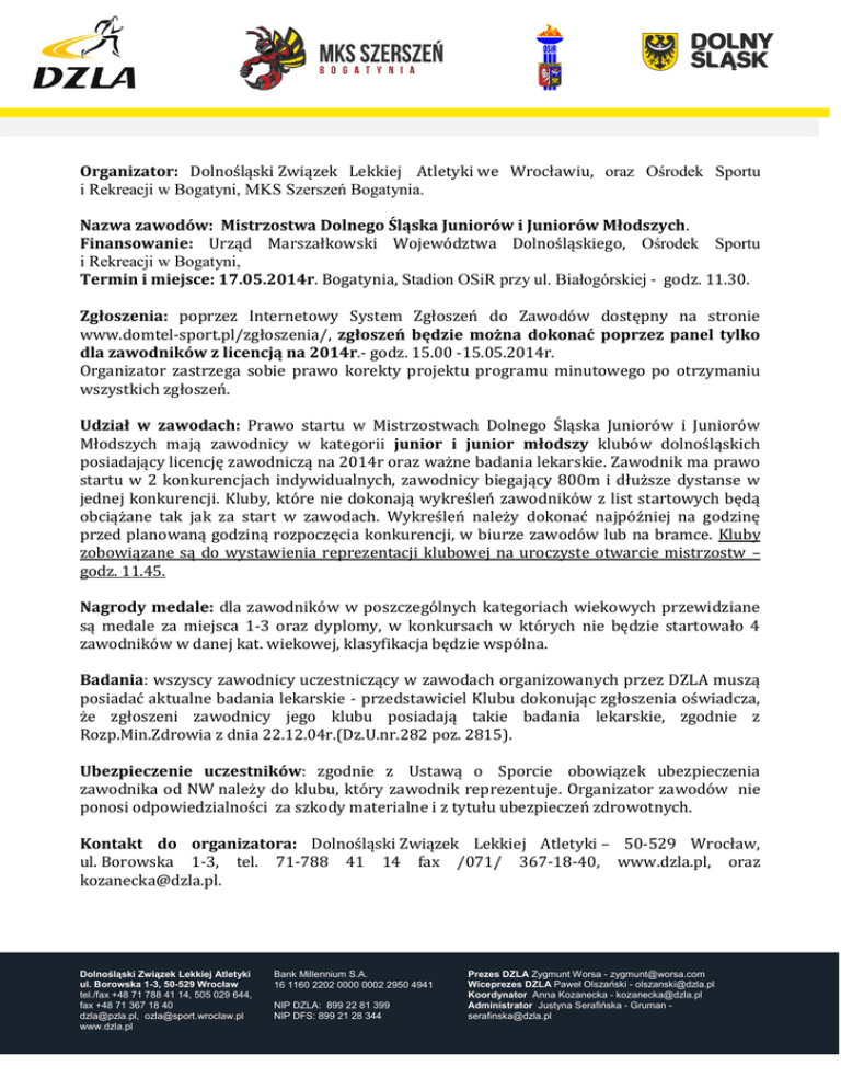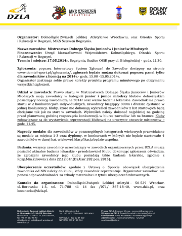 Organizator: Dolnośląski Związek Lekkiej Atletyki we Wrocławiu, oraz Ośrodek Sportu i Rekreacji w Bogatyni, MKS Szerszeń Bogatynia. Nazwa zawodów: Mistrzostwa Dolnego Śląska Juniorów i Juniorów Młodszych. Finansowanie: Urząd Marszałkowski Województwa Dolnośląskiego, Ośrodek Sportu i Rekreacji w Bogatyni, Termin i miejsce: 17.05.2014r. Bogatynia, Stadion OSiR przy ul. Białogórskiej - godz. 11.30. Zgłoszenia: poprzez Internetowy System Zgłoszeń do Zawodów dostępny na stronie www.domtel-sport.pl/zgłoszenia/, zgłoszeń będzie można dokonać poprzez panel tylko dla zawodników z licencją na 2014r.- godz. 15.00 -15.05.2014r. Organizator zastrzega sobie prawo korekty projektu programu minutowego po otrzymaniu wszystkich zgłoszeń. Udział w zawodach: Prawo startu w Mistrzostwach Dolnego Śląska Juniorów i Juniorów Młodszych mają zawodnicy w kategorii junior i junior młodszy klubów dolnośląskich posiadający licencję zawodniczą na 2014r oraz ważne badania lekarskie. Zawodnik ma prawo startu w 2 konkurencjach indywidualnych, zawodnicy biegający 800m i dłuższe dystanse w jednej konkurencji. Kluby, które nie dokonają wykreśleń zawodników z list startowych będą obciążane tak jak za start w zawodach. Wykreśleń należy dokonać najpóźniej na godzinę przed planowaną godziną rozpoczęcia konkurencji, w biurze zawodów lub na bramce. Kluby zobowiązane są do wystawienia reprezentacji klubowej na uroczyste otwarcie mistrzostw – godz. 11.45. Nagrody medale: dla zawodników w poszczególnych kategoriach wiekowych przewidziane są medale za miejsca 1-3 oraz dyplomy, w konkursach w których nie będzie startowało 4 zawodników w danej kat. wiekowej, klasyfikacja będzie wspólna. Badania: wszyscy zawodnicy uczestniczący w zawodach organizowanych przez DZLA muszą posiadać aktualne badania lekarskie - przedstawiciel Klubu dokonując zgłoszenia oświadcza, że zgłoszeni zawodnicy jego klubu posiadają takie badania lekarskie, zgodnie z Rozp.Min.Zdrowia z dnia 22.12.04r.(Dz.U.nr.282 poz. 2815). Ubezpieczenie uczestników: zgodnie z Ustawą o Sporcie obowiązek ubezpieczenia zawodnika od NW należy do klubu, który zawodnik reprezentuje. Organizator zawodów nie ponosi odpowiedzialności za szkody materialne i z tytułu ubezpieczeń zdrowotnych. Kontakt do organizatora: Dolnośląski Związek Lekkiej Atletyki – 50-529 Wrocław, ul. Borowska 1-3, tel. 71-788 41 14 fax /071/ 367-18-40, www.dzla.pl, oraz [email protected]. Dolnośląski Związek Lekkiej Atletyki ul. Borowska 1-3, 50-529 Wrocław tel./fax +48 71 788 41 14, 505 029 644, fax +48 71 367 18 40 [email protected], [email protected] www.dzla.pl Bank Millennium S.A. 16 1160 2202 0000 0002 2950 4941 NIP DZLA: 899 22 81 399 NIP DFS: 899 21 28 344 Prezes DZLA Zygmunt Worsa - [email protected] Wiceprezes DZLA Paweł Olszański - [email protected] Koordynator Anna Kozanecka - [email protected] Administrator Justyna Serafińska - Gruman [email protected] PROJEKT PROGRAMU MINUTOWEGO 17.05.2014 r. (sobota) Młot M /5,6/ 11.30 11.50 UROCZYSTE OTWARCIE MISTRZOSTW DOLNEGO ŚLĄSKA JUNIORÓW 12.00 110ppł jun. J.mł 12.20 12.45 100ppł jun, j.mł 100 M jun, j.mł s.c. 13.10 100 K jun, j.mł s.c. 13.30 13.40 400 K jun, j.mł s.c. 400 M jun, j.mł s.c. 14.00 800 K jun, j.mł s.c. 14.10 800 M jun, j.mł s.c. 14.30 14.45 15.00 15.20 15.40 15.50 16.00 400ppł K s.c. 400ppł M jun, j.mł 200 K jun, j.mł s.c. 200 M jun, j.mł s.c. 1500 K jun, j.mł s.c. 1500 M jun, j.mł s.c. 3000M K i M Dolnośląski Związek Lekkiej Atletyki ul. Borowska 1-3, 50-529 Wrocław tel./fax +48 71 788 41 14, 505 029 644, fax +48 71 367 18 40 [email protected], [email protected] www.dzla.pl W dal K jun. J.mł Młot K /3,4/ Tyczka K i M Kula M 5 Oszczep K 600,500 W dal M jun.mł Kula M 6 Oszczep M 800,700 W dal M jun. Wzwyż K -130 Kula K 3 Kula K 4 3-skok K Wzwyż M-150 3-skok M Bank Millennium S.A. 16 1160 2202 0000 0002 2950 4941 NIP DZLA: 899 22 81 399 NIP DFS: 899 21 28 344 Dysk M 1.5, 1.75 Dysk K 1, 0.75 Prezes DZLA Zygmunt Worsa - [email protected] Wiceprezes DZLA Paweł Olszański - [email protected] Koordynator Anna Kozanecka - [email protected] Administrator Justyna Serafińska - Gruman [email protected]