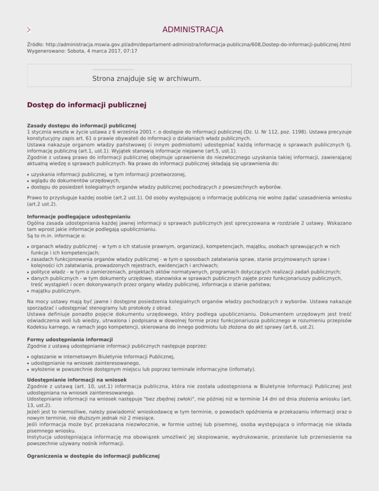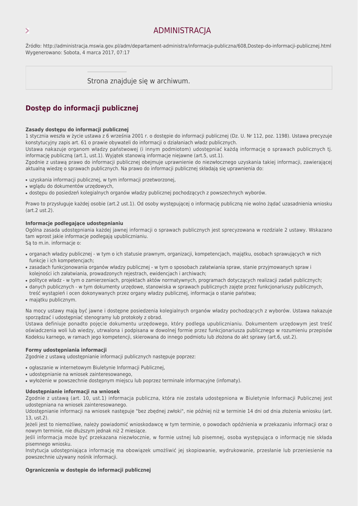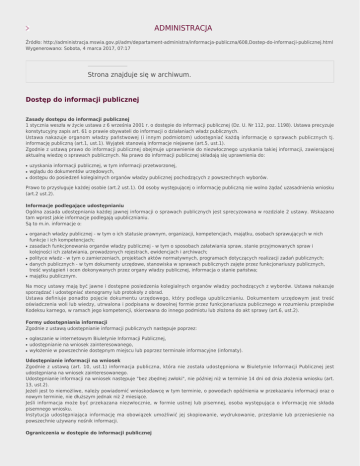 ADMINISTRACJA Źródło: http://administracja.mswia.gov.pl/adm/departament-administra/informacja-publiczna/608,Dostep-do-informacji-publicznej.html Wygenerowano: Sobota, 4 marca 2017, 07:17 Strona znajduje się w archiwum. Dostęp do informacji publicznej Zasady dostępu do informacji publicznej 1 stycznia weszła w życie ustawa z 6 września 2001 r. o dostępie do informacji publicznej (Dz. U. Nr 112, poz. 1198). Ustawa precyzuje konstytucyjny zapis art. 61 o prawie obywateli do informacji o działaniach władz publicznych. Ustawa nakazuje organom władzy państwowej (i innym podmiotom) udostępniać każdą informację o sprawach publicznych tj. informację publiczną (art.1, ust.1). Wyjątek stanowią informacje niejawne (art.5, ust.1). Zgodnie z ustawą prawo do informacji publicznej obejmuje uprawnienie do niezwłocznego uzyskania takiej informacji, zawierającej aktualną wiedzę o sprawach publicznych. Na prawo do informacji publicznej składają się uprawnienia do: ● ● ● uzyskania informacji publicznej, w tym informacji przetworzonej, wglądu do dokumentów urzędowych, dostępu do posiedzeń kolegialnych organów władzy publicznej pochodzących z powszechnych wyborów. Prawo to przysługuje każdej osobie (art.2 ust.1). Od osoby występującej o informację publiczną nie wolno żądać uzasadnienia wniosku (art.2 ust.2). Informacje podlegające udostępnianiu Ogólna zasada udostępniania każdej jawnej informacji o sprawach publicznych jest sprecyzowana w rozdziale 2 ustawy. Wskazano tam wprost jakie informacje podlegają upublicznianiu. Są to m.in. informacje o: ● ● ● ● ● organach władzy publicznej - w tym o ich statusie prawnym, organizacji, kompetencjach, majątku, osobach sprawujących w nich funkcje i ich kompetencjach; zasadach funkcjonowania organów władzy publicznej - w tym o sposobach załatwiania spraw, stanie przyjmowanych spraw i kolejności ich załatwiania, prowadzonych rejestrach, ewidencjach i archiwach; polityce władz - w tym o zamierzeniach, projektach aktów normatywnych, programach dotyczących realizacji zadań publicznych; danych publicznych - w tym dokumenty urzędowe, stanowiska w sprawach publicznych zajęte przez funkcjonariuszy publicznych, treść wystąpień i ocen dokonywanych przez organy władzy publicznej, informacja o stanie państwa; majątku publicznym. Na mocy ustawy mają być jawne i dostępne posiedzenia kolegialnych organów władzy pochodzących z wyborów. Ustawa nakazuje sporządzać i udostępniać stenogramy lub protokoły z obrad. Ustawa definiuje ponadto pojęcie dokumentu urzędowego, który podlega upublicznianiu. Dokumentem urzędowym jest treść oświadczenia woli lub wiedzy, utrwalona i podpisana w dowolnej formie przez funkcjonariusza publicznego w rozumieniu przepisów Kodeksu karnego, w ramach jego kompetencji, skierowana do innego podmiotu lub złożona do akt sprawy (art.6, ust.2). Formy udostępniania informacji Zgodnie z ustawą udostępnianie informacji publicznych następuje poprzez: ● ● ● ogłaszanie w internetowym Biuletynie Informacji Publicznej, udostępnianie na wniosek zainteresowanego, wyłożenie w powszechnie dostępnym miejscu lub poprzez terminale informacyjne (infomaty). Udostępnianie informacji na wniosek Zgodnie z ustawą (art. 10, ust.1) informacja publiczna, która nie została udostępniona w Biuletynie Informacji Publicznej jest udostępniana na wniosek zainteresowanego. Udostępnianie informacji na wniosek następuje "bez zbędnej zwłoki", nie później niż w terminie 14 dni od dnia złożenia wniosku (art. 13, ust.2). Jeżeli jest to niemożliwe, należy powiadomić wnioskodawcę w tym terminie, o powodach opóźnienia w przekazaniu informacji oraz o nowym terminie, nie dłuższym jednak niż 2 miesiące. Jeśli informacja może być przekazana niezwłocznie, w formie ustnej lub pisemnej, osoba występująca o informację nie składa pisemnego wniosku. Instytucja udostępniająca informację ma obowiązek umożliwić jej skopiowanie, wydrukowanie, przesłanie lub przeniesienie na powszechnie używany nośnik informacji. Ograniczenia w dostępie do informacji publicznej Odmowa udzielenia informacji może nastąpić jedynie ze względu na jej niejawność (ochrona danych osobowych, prawo do prywatności, tajemnica państwowa, służbowa, skarbowa, statystyczna). Odmowa następuje w formie decyzji administracyjnej. Odwołanie od decyzji rozpoznaje się w terminie 14 dni (art. 16, ust.2, pkt 1). Odpowiedzialność karna Przepis art. 23 przewiduje grzywnę, karę ograniczenia lub pozbawienia wolności do roku, dla tego kto, wbrew ciążącemu na nim obowiązkowi, nie udostępnia informacji publicznej. Wstecz Drukuj PDF Powiadom znajomego