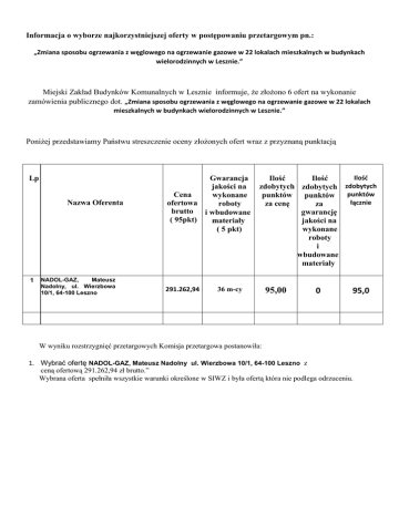 Informacja o wyborze najkorzystniejszej oferty w postępowaniu przetargowym pn.: „Zmiana sposobu ogrzewania z węglowego na ogrzewanie gazowe w 22 lokalach mieszkalnych w budynkach wielorodzinnych w Lesznie.” Miejski Zakład Budynków Komunalnych w Lesznie informuje, że złożono 6 ofert na wykonanie zamówienia publicznego dot. „Zmiana sposobu ogrzewania z węglowego na ogrzewanie gazowe w 22 lokalach mieszkalnych w budynkach wielorodzinnych w Lesznie.” Poniżej przedstawiamy Państwu streszczenie oceny złożonych ofert wraz z przyznaną punktacją Lp Nazwa Oferenta 1 NADOL-GAZ, Mateusz Nadolny, ul. Wierzbowa 10/1, 64-100 Leszno Gwarancja jakości na Cena wykonane ofertowa roboty brutto i wbudowane ( 95pkt) materiały ( 5 pkt) 291.262,94 Ilość Ilość Ilość zdobytych zdobytych zdobytych punktów punktów punktów łącznie za cenę za gwarancję jakości na wykonane roboty i wbudowane materiały 36 m-cy 95,00 0 95,0 W wyniku rozstrzygnięć przetargowych Komisja przetargowa postanowiła: 1. Wybrać ofertę NADOL-GAZ, Mateusz Nadolny ul. Wierzbowa 10/1, 64-100 Leszno z ceną ofertową 291.262,94 zł brutto.” Wybrana oferta spełniła wszystkie warunki określone w SIWZ i była ofertą która nie podlega odrzuceniu.