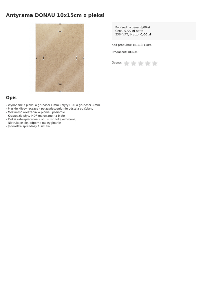 Antyrama DONAU 10x15cm z pleksi Poprzednia cena: 0,00 zł Cena: 0,00 zł netto 23% VAT, brutto: 0,00 zł Kod produktu: TB.113.110/4 Producent: DONAU Ocena: Opis - Powered by TCPDF (www.tcpdf.org) Wykonane z pleksi o grubości 1 mm i płyty HDF o grubości 3 mm Płaskie klipsy łączące - po zawieszeniu nie odstają od ściany Możliwość wieszania w pionie i poziomie Krawędzie płyty HDF malowane na biało Pleksi zabezpieczona z obu stron folią ochronną Nietłukące się, odporne na wyginanie Jednostka sprzedaży 1 sztuka