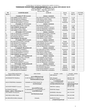KOMUNIKAT WYDZIAŁU SZKOLENIA MZPN 5/O/2013 r. TERMINARZ ROZGRYWEK SZKOLENIOWYCH stan na dzień 2013-08-26 10:15 GRUPA ORLIKI „ 5” (POJEDYNCZA) Sezon 2013/2014 – I RUNDA jesień 2013 r Rocznik 2003 - 2004 NR Spraw. 1. 2. 3. 4. 5. 6. 7. 8. 9. 10. 11. 12. 13. 14. 15. 16. 17. 18. 19. 20. 21. 22. 23. 24. 25. 26. 27. 28. GOŚCIE GOSPODARZE I kolejka 07/ 08 wrzesień LKS BIBICZANKA Bibice LKS BŁĘKITNI Modlnica LKS JUTRZENKA Giebułtów LKS KOSYNIERZY Łuczyce II kolejka 14 /15 wrzesień KS ZIELEŃCZANKA Zielonki LKS SOKÓŁ Kocmyrzów UKS SKALANKA Skała LKS BIBICZANKA Bibice III kolejka 21/22 wrzesień LKS JUTRZENKA Giebułtów LKS KOSYNIERZY Łuczyce KS POGOŃ Miechów LKS SOKÓŁ Kocmyrzów IV kolejka 28/29 wrzesień KS ZIELEŃCZANKA Zielonki LKS BŁĘKITNI Modlnica UKS SKALANKA Skała LKS BIBICZANKA Bibice V kolejka05 /06 październik LKS BŁĘKITNI Modlnica LKS JUTRZENKA Giebułtów LKS KOSYNIERZY Łuczyce LKS SOKÓŁ Kocmyrzów VI kolejka 12/13 październik KS ZIELEŃCZANKA Zielonki UKS SKALANKA Skała KS POGOŃ Miechów LKS KOSYNIERZY Łuczyce VII kolejka 19/20 październik UKS SKALANKA Skała LKS SOKÓŁ Kocmyrzów LKS BIBICZANKA Bibice LKS BŁĘKITNI Modlnica Nazwa klubu sportowego LKS BIBICZANKA Bibice LKS BŁĘKITNI Modlnica Sobota / niedziela KS ZIELEŃCZANKA Zielonki UKS SKALANKA Skała LKS SOKÓŁ Kocmyrzów KS POGOŃ Miechów Sobota / niedziela KS POGOŃ Miechów LKS KOSYNIERZY Łuczyce LKS JUTRZENKA Giebułtów LKS BŁĘKITNI Modlnica Sobota / niedziela KS ZIELEŃCZANKA Zielonki LKS BŁĘKITNI Modlnica LKS BIBICZANKA Bibice UKS SKALANKA Skała Sobota / niedziela LKS KOSYNIERZY Łuczyce LKS SOKÓŁ Kocmyrzów KS POGOŃ Miechów LKS JUTRZENKA Giebułtów Sobota / niedziela KS ZIELEŃCZANKA Zielonki KS POGOŃ Miechów UKS SKALANKA Skała LKS BIBICZANKA Bibice Sobota / niedziela LKS SOKÓŁ Kocmyrzów LKS BIBICZANKA Bibice LKS BŁĘKITNI Modlnica LKS JUTRZENKA Giebułtów Sobota / niedziela KS ZIELEŃCZANKA Zielonki KS POGOŃ Miechów LKS KOSYNIERZY Łuczyce LKS JUTRZENKA Giebułtów Adres boiska Bibice, [email protected] 32-085 Modlnica, ul. Sportowa 19 [email protected] Dzień Tyg. Godz. Meczu Niedziela Sobota Piątek Niedziela 11.30 9.00 17.30 16.30 Piątek Sobota Sobota Niedziela 17.30 9,00 11.00 11.30 Piątek Sobota Sobota Niedziela 17.30 11.00 11.00 10,00 Piątek Niedziela Sobota Niedziela 17.30 9.30 11.00 11.30 Niedziela Piątek Sobota Sobota 12.30 17.30 12.00 10,00 Piątek Sobota Sobota Sobota 17.00 11.00 11.00 13.00 Sobota Sobota Niedziela Niedziela 11.00 10,00 11.30 9.00 Kontakt – osoba MIŚ Mateusz Kontakt - telefon 502-178-957 606-957-720 793-038-375 LKS JUTRZENKA Giebułtów Giebułtów ul. Orlich Gniazd 10 [email protected] GIL Grzegorz RUMIAN Wojciech [email protected] Tadeusz GĄTKIEWICZ [email protected] LKS KOSYNIERZY Łuczyce Łuczyce, MIZURA Andrzej 604-142-891 [email protected] 692-723-789 607-057-760 KS POGOŃ Miechów boisko –orlik os. Sikorskiego 15 LKS SOKÓŁ Kocmyrzów [email protected] 32-200 Miechów, ul. Konopnickiej 19 [email protected] Kocmyrzów, [email protected] PODYMA Marek 660-452-024 KISZKIEL Mirosław 601-735-939 DOMAGALSKI Stanisław 602-432-980 KAPUSTA Paweł [email protected] 791-063-033 UKS SKALANKA Skała KS ZIELEŃCZANKA Zielonki Zielonki, 1 WYNIK Meczu REGULAMIN ROZGRYWEK SZKOLENIOWYCH ORLIKÓW ; ŻAKÓW I SKRZATÓW NA SEZON 2013/2014 1.Zespół liczy 7 zawodników w tym bramkarz oraz do 5 zawodników rezerwowych wpisanych do sprawozdania. * Orliki rocznik od 01.01.2003 - 31.12.2004 * Żaki rocznik od 01.01.2005 - 31.12.2006 * Skrzaty rocznik od 01.01.2007 i młodsi. 2.Każdy zawodnik powinien posiadać : * Dla Orlików i dla Żaków - legitymację szkolną i deklaracja przynależności do klubu oraz aktualną kartę zdrowia. * Dla Skrzatów- Aktualną kartę zdrowia. 3.Wymiary boisk dla Orlików 50 x 33-35 m. dla Żaków i Skrzatów 40 x 30 m. 4.Czas gry 2x25 minut – min 5 zawodników. (Skrzaty - 2x20 min) 5.Rozmiar piłki do gry: Orliki piłka nr 4 , Żaki piłka nr 3 lub siatkowa, Skrzaty piłka siatkowa. 6.Zmiany zawodników systemem „hokejowym”. 7.Gra odbywa się bez spalonego. 8.Za niesportowe zachowanie kary czasowe 1- 2 minuty. 9.Rzut karny dla Orlików i Żaków 9 m, dla Skrzatów 7 m. 10.Pole karne na całej szerokości boiska, 9 m dla Orlików i żaków, 7,0 m dla skrzatów. 11.Rozgrywki odbywają się bez awansów i spadków. 12.Bramkarz wyprowadza piłkę: Orliki – ręką, Żaki nogą lub ręką, Skrzaty nogą. 12a. Rzut z autu wykonywany jest z nad głowy rękami. 12b. Zakaz gry w obuwiu z metalowymi wkrętami. 13.Zawody powinni prowadzić sędziowie związkowi, nieobecność sędziów powoduje odbycie losowania między zainteresowanymi stronami, przedstawiciel sędziujący uczy przepisów gry, a nie tylko egzekwuje. 14.Sprawy wychowawcze: * Wyprowadzenie i przywitanie zespołów. * Ogłoszenie wyników po zawodach. * Zawodnicy dziękują przeciwnikom za rozegranie meczu. 15.Drużyny rozgrywają mecze pod warunkiem posiadania potwierdzonej przez MZPN podstawowej listy zgłoszeń w systemie ekstranet począwszy od ukończenia 7 roku życia. 16.Pomiędzy dwoma kolejnymi meczami danej drużyny wymagana jest przerwa 48 godzin od zakończenia ostatniego meczu. 17.W celu poprawienia przejrzystości na boisku należy usytuować zawodników rezerwowych, kierowników drużyn i trenerów za jedną linią autową a rodziców i kibiców za drugą linią autową. 18. Po rozegranym spotkaniu sprawozdanie należy dostarczyć W CIĄGU 72 GODZIN do Podokręgu Piłki Nożnej Kraków przy MZPN, ul. Krowoderska 74 Organizatorzy rozgrywek Komisja Młodzieżowa MZPN: Jan Burmer – 889-109-389, Andrzej Garley – 501-799-213, Jerzy Gospodarczyk – 661-517-847, Aleksander Hradecki – 882-450-190, Marian Jarek – 797-837-302. Zgłoszenia potwierdzone wpłatą 300 zł na drużynę (trampkarzy, młodzików, orlików, żaków i skrzatów) do rozgrywek LIII(53) Halowych Mistrzostw Krakowa w sezonie 2013 – 2014 należy przesł