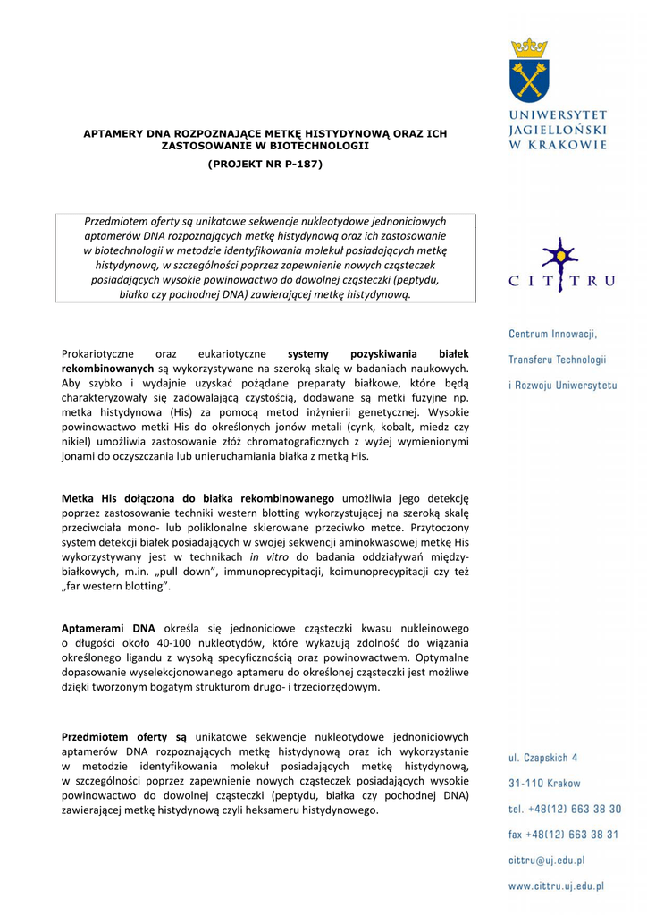APTAMERY DNA ROZPOZNAJĄCE METKĘ HISTYDYNOWĄ ORAZ ICH ZASTOSOWANIE W BIOTECHNOLOGII (PROJEKT NR P-187) Przedmiotem oferty są unikatowe sekwencje nukleotydowe jednoniciowych aptamerów DNA rozpoznających metkę histydynową oraz ich zastosowanie w biotechnologii w metodzie identyfikowania molekuł posiadających metkę histydynową, w szczególności poprzez zapewnienie nowych cząsteczek posiadających wysokie powinowactwo do dowolnej cząsteczki (peptydu, białka czy pochodnej DNA) zawierającej metkę histydynową. Prokariotyczne oraz eukariotyczne systemy pozyskiwania białek rekombinowanych są wykorzystywane na szeroką skalę w badaniach naukowych. Aby szybko i wydajnie uzyskać pożądane preparaty białkowe, które będą charakteryzowały się zadowalającą czystością, dodawane są metki fuzyjne np. metka histydynowa (His) za pomocą metod inżynierii genetycznej. Wysokie powinowactwo metki His do określonych jonów metali (cynk, kobalt, miedz czy nikiel) umożliwia zastosowanie złóż chromatograficznych z wyżej wymienionymi jonami do oczyszczania lub unieruchamiania białka z metką His. Metka His dołączona do białka rekombinowanego umożliwia jego detekcję poprzez zastosowanie techniki western blotting wykorzystującej na szeroką skalę przeciwciała mono‐ lub poliklonalne skierowane przeciwko metce. Przytoczony system detekcji białek posiadających w swojej sekwencji aminokwasowej metkę His wykorzystywany jest w technikach in vitro do badania oddziaływań między‐ białkowych, m.in. „pull down”, immunoprecypitacji, koimunoprecypitacji czy też „far western blotting”. Aptamerami DNA określa się jednoniciowe cząsteczki kwasu nukleinowego o długości około 40‐100 nukleotydów, które wykazują zdolność do wiązania określonego ligandu z wysoką specyficznością oraz powinowactwem. Optymalne dopasowanie wyselekcjonowanego aptameru do określonej cząsteczki jest możliwe dzięki tworzonym bogatym strukturom drugo‐ i trzeciorzędowym. Przedmiotem oferty są unikatowe sekwencje nukleotydowe jednoniciowych aptamerów DNA rozpoznających metkę histydynową oraz ich wykorzystanie w metodzie identyfikowania molekuł posiadających metkę histydynową, w szczególności poprzez zapewnienie nowych cząsteczek posiadających wysokie powinowactwo do dowolnej cząsteczki (peptydu, białka czy pochodnej DNA) zawierającej metkę histydynową czyli heksameru histydynowego. Aptamery DNA będące przedmiotem wynalazku mogą znaleźć zastosowanie w rozpoznawaniu cząsteczek posiadających powinowactwo do celów molekularnych zawierających metkę His, a w szczególności do: stosowania jako agonista dla przeciwciał skierowanych przeciwko metce His; detekcji, oczyszczania i oznaczania stężenia celów molekularnych zawierających metkę His. Oprócz przedstawionych powyżej zastosowań aptamery DNA mogą być stosowane w postaci cząsteczek z przyłączonymi znacznikami, zwłaszcza fluorescencyjnymi, i służyć w szczególności do znakowania celów molekularnych posiadających metkę His. Tego typu cząsteczki mogą być z powodzeniem wykorzystane np. do badania oddziaływań pomiędzy białkami stosując techniki spektroskopowe, m.in. FRET (Forsterowskie rezonansowe przeniesienie energii). Oferowane aptamery DNA i ich zastosowanie stanowią przedmiot zgłoszenia patentowego. Dalsze prace nad jej rozwojem są prowadzone na Wydziale Biochemii, Biofizyki i Biotechnologii UJ, a Centrum Innowacji, Transferu Technologii i Rozwoju Uniwersytetu poszukuje podmiotów zainteresowanych komercyjnym wykorzystaniem wynalazku. Dalsze informacje: dr Klaudia Polakowska Specjalista ds. Transferu Technologii CITTRU, Uniwersytet Jagielloński www.cittru.uj.edu.pl tel. 12 663 3832, fax: 12 663 3831 e-mail: [email protected]