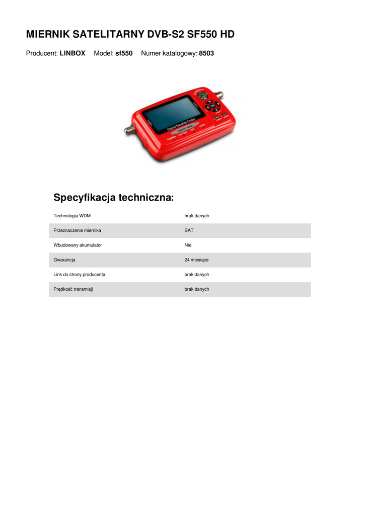 MIERNIK SATELITARNY DVB-S2 SF550 HD Specyfikacja