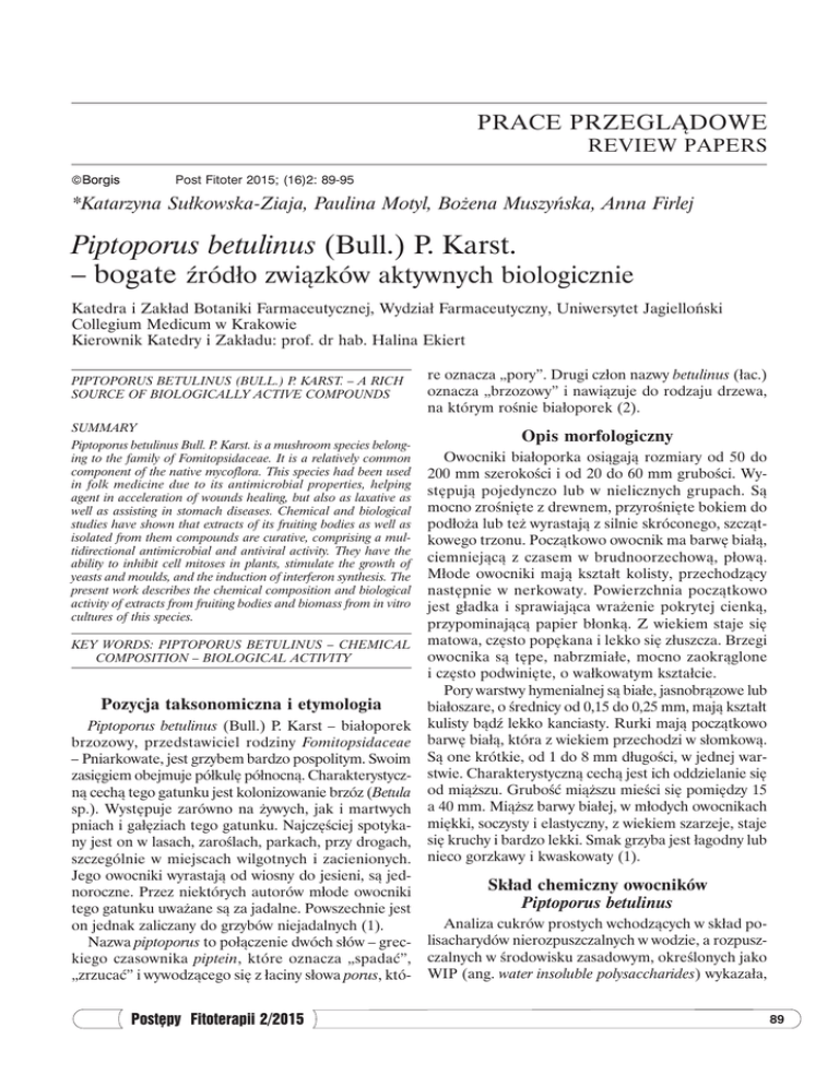 Prace przeglądowe review papers Borgis Post Fitoter 2015; (16)2: 89-95 *Katarzyna Sułkowska-Ziaja, Paulina Motyl, Bożena Muszyńska, Anna Firlej Piptoporus betulinus (Bull.) P. Karst. – bogate źródło związków aktywnych biologicznie Katedra i Zakład Botaniki Farmaceutycznej, Wydział Farmaceutyczny, Uniwersytet Jagielloński Collegium Medicum w Krakowie Kierownik Katedry i Zakładu: prof. dr hab. Halina Ekiert PIPTOPORUS BETULINUS (BULL.) P. KARST. – A RICH SOURCE OF BIOLOGICALLY ACTIVE COMPOUNDS Summary Piptoporus betulinus Bull. P. Karst. is a mushroom species belonging to the family of Fomitopsidaceae. It is a relatively common component of the native mycoflora. This species had been used in folk medicine due to its antimicrobial properties, helping agent in acceleration of wounds healing, but also as laxative as well as assisting in stomach diseases. Chemical and biological studies have shown that extracts of its fruiting bodies as well as isolated from them compounds are curative, comprising a multidirectional antimicrobial and antiviral activity. They have the ability to inhibit cell mitoses in plants, stimulate the growth of yeasts and moulds, and the induction of interferon synthesis. The present work describes the chemical composition and biological activity of extracts from fruiting bodies and biomass from in vitro cultures of this species. KEY WORDS: PIPTOPORUS BETULINUS – CHEMICAL COMPOSITION – BIOLOGICAL ACTIVITY Pozycja taksonomiczna i etymologia Piptoporus betulinus (Bull.) P. Karst – białoporek brzozowy, przedstawiciel rodziny Fomitopsidaceae – Pniarkowate, jest grzybem bardzo pospolitym. Swoim zasięgiem obejmuje półkulę północną. Charakterystyczną cechą tego gatunku jest kolonizowanie brzóz (Betula sp.). Występuje zarówno na żywych, jak i martwych pniach i gałęziach tego gatunku. Najczęściej spotykany jest on w lasach, zaroślach, parkach, przy drogach, szczególnie w miejscach wilgotnych i zacienionych. Jego owocniki wyrastają od wiosny do jesieni, są jednoroczne. Przez niektórych autorów młode owocniki tego gatunku uważane są za jadalne. Powszechnie jest on jednak zaliczany do grzybów niejadalnych (1). Nazwa piptoporus to połączenie dwóch słów – greckiego czasownika piptein, które oznacza „spadać”, „zrzucać” i wywodzącego się z łaciny słowa porus, któ- Postępy Fitoterapii 2/2015 re oznacza „pory”. Drugi człon nazwy betulinus (łac.) oznacza „brzozowy” i nawiązuje do rodzaju drzewa, na którym rośnie białoporek (2). Opis morfologiczny Owocniki białoporka osiągają rozmiary od 50 do 200 mm szerokości i od 20 do 60 mm grubości. Występują pojedynczo lub w nielicznych grupach. Są mocno zrośnięte z drewnem, przyrośnięte bokiem do podłoża lub też wyrastają z silnie skróconego, szczątkowego trzonu. Początkowo owocnik ma barwę białą, ciemniejącą z czasem w brudnoorzechową, płową. Młode owocniki mają kształt kolisty, przechodzący następnie w nerkowaty. Powierzchnia początkowo jest gładka i sprawiająca wrażenie pokrytej cienką, przypominającą papier błonką. Z wiekiem staje się matowa, często popękana i lekko się złuszcza. Brzegi owocnika są tępe, nabrzmiałe, mocno zaokrąglone i często podwinięte, o wałkowatym kształcie. Pory warstwy hymenialnej są białe, jasnobrązowe lub białoszare, o średnicy od 0,15 do 0,25 mm, mają kształt kulisty bądź lekko kanciasty. Rurki mają początkowo barwę białą, która z wiekiem przechodzi w słomkową. Są one krótkie, od 1 do 8 mm długości, w jednej warstwie. Charakterystyczną cechą jest ich oddzielanie się od miąższu. Grubość miąższu mieści się pomiędzy 15 a 40 mm. Miąższ barwy białej, w młodych owocnikach miękki, soczysty i elastyczny, z wiekiem szarzeje, staje się kruchy i bardzo lekki. Smak grzyba jest łagodny lub nieco gorzkawy i kwaskowaty (1). Skład chemiczny owocników Piptoporus betulinus Analiza cukrów prostych wchodzących w skład polisacharydów nierozpuszczalnych w wodzie, a rozpuszczalnych w środowisku zasadowym, określonych jako WIP (ang. water insoluble polysaccharides) wykazała, 89 Katarzyna Sułkowska-Ziaja i wsp. że w przeważającej ilości składają się one z glukozy (94,3%), w niewielkiej ilości z mannozy (4,1%) i ksylozy (1,5%), zaś galaktoza występowała tylko w ilościach śladowych. Wiązaniem przeważającym w polisacharydach jest połączenie α-(1→3) (3). Całkowitą zawartość węglowodanów w owocnikach określono na poziomie 12,51 g/100g s.m., w tym ok. 0,36 g/100 g s.m. stanowi mannitol i ok. 12,15 g/100 g s.m. trehaloza. Analiza profilu kwasów tłuszczowych dowiodła, że ilościowo dominują nienasycone kwasy tłuszczowe: PUFA (61,98%) i MUFA (8,92%). Owocniki zawierają również witaminy, m.in. α-, β-, γ- i δ-tokoferol (577,62 µg/100 g s.m.) oraz witaminę C (87,9 mg/100 g s.m.). Ponadto stwierdzono obecność β-karotenu (0,09 mg/100 g s.m.) i likopenu (0,23 mg/g s.m.), a także oznaczono całkowitą zawartość flawonoidów (6,79 mg/g ekstraktu) i związków fenolowych (34,94 mg/g ekstraktu) (4). Szeroko reprezentowane są związki o strukturze terpenów, takie jak neosterol czy fitosterol. W owocnikach zidentyfikowano również ergosta-7,22-dien-3-β-ol, fungisterol, ergosterol oraz kwas tumulozowy (ryc. 1) (5, 6). Badania produktów hydrodestylacji owocników pozwoliły na identyfikację związków reprezentujących różne grupy chemiczne. Stwierdzono obecność mono- i seskwiterpenów, alkoholi alifatycznych, aldehydów, ketonów, a także związków aromatycznych. Po raz pierwszy w historii wyizolowano (S)-(-)-daucen, izobazzanen oraz (-)-β-barbaten (ryc. 2) – związki terpenowe o uznanej aktywności biologicznej (6). Podczas analizy GC/MS lotnych związków występujących w ekstrakcie dichlorometanowym z owocników Ryc. 1. Budowa chemiczna kwasu tumulozowego. stwierdzono, że dominującymi ilościowo składnikami 