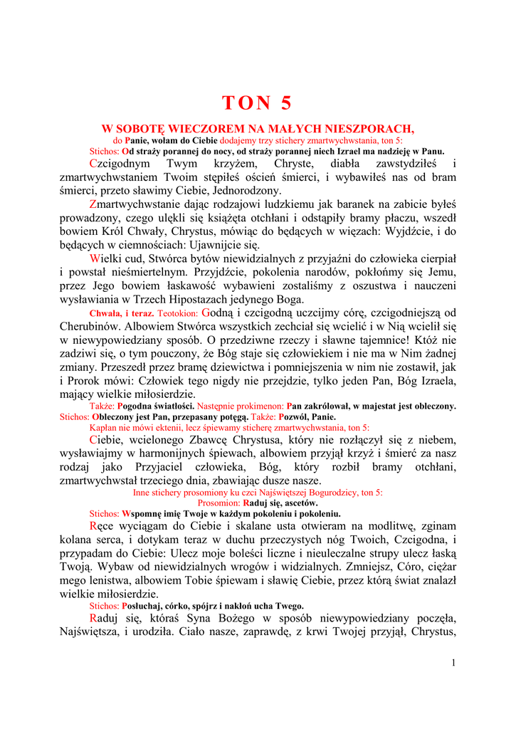TON 5 W SOBOTĘ WIECZOREM NA MAŁYCH NIESZPORACH, do Panie, wołam do Ciebie dodajemy trzy stichery zmartwychwstania, ton 5: Stichos: Od straŜy porannej do nocy, od straŜy porannej niech Izrael ma nadzieję w Panu. Czcigodnym Twym krzyŜem, Chryste, diabła zawstydziłeś i zmartwychwstaniem Twoim stępiłeś oścień śmierci, i wybawiłeś nas od bram śmierci, przeto sławimy Ciebie, Jednorodzony. Zmartwychwstanie dając rodzajowi ludzkiemu jak baranek na zabicie byłeś prowadzony, czego ulękli się ksiąŜęta otchłani i odstąpiły bramy płaczu, wszedł bowiem Król Chwały, Chrystus, mówiąc do będących w więzach: Wyjdźcie, i do będących w ciemnościach: Ujawnijcie się. Wielki cud, Stwórca bytów niewidzialnych z przyjaźni do człowieka cierpiał i powstał nieśmiertelnym. Przyjdźcie, pokolenia narodów, pokłońmy się Jemu, przez Jego bowiem łaskawość wybawieni zostaliśmy z oszustwa i nauczeni wysławiania w Trzech Hipostazach jedynego Boga. Chwała, i teraz. Teotokion: Godną i czcigodną uczcijmy córę, czcigodniejszą od Cherubinów. Albowiem Stwórca wszystkich zechciał się wcielić i w Nią wcielił się w niewypowiedziany sposób. O przedziwne rzeczy i sławne tajemnice! KtóŜ nie zadziwi się, o tym pouczony, Ŝe Bóg staje się człowiekiem i nie ma w Nim Ŝadnej zmiany. Przeszedł przez bramę dziewictwa i pomniejszenia w nim nie zostawił, jak i Prorok mówi: Człowiek tego nigdy nie przejdzie, tylko jeden Pan, Bóg Izraela, mający wielkie miłosierdzie. TakŜe: Pogodna światłości. Następnie prokimenon: Pan zakrólował, w majestat jest obleczony. Stichos: Obleczony jest Pan, przepasany potęgą. TakŜe: Pozwól, Panie. Kapłan nie mówi ektenii, lecz śpiewamy sticherę zmartwychwstania, ton 5: Ciebie, wcielonego Zbawcę Chrystusa, który nie rozłączył się z niebem, wysławiajmy w harmonijnych śpiewach, albowiem przyjął krzyŜ i śmierć za nasz rodzaj jako Przyjaciel człowieka, Bóg, który rozbił bramy otchłani, zmartwychwstał trzeciego dnia, zbawiając dusze nasze. Inne stichery prosomiony ku czci Najświętszej Bogurodzicy, ton 5: Prosomion: Raduj się, ascetów. Stichos: Wspomnę imię Twoje w kaŜdym pokoleniu i pokoleniu. Ręce wyciągam do Ciebie i skalane usta otwieram na modlitwę, zginam kolana serca, i dotykam teraz w duchu przeczystych nóg Twoich, Czcigodna, i przypadam do Ciebie: Ulecz moje boleści liczne i nieuleczalne strupy ulecz łaską Twoją. Wybaw od niewidzialnych wrogów i widzialnych. Zmniejsz, Córo, cięŜar mego lenistwa, albowiem Tobie śpiewam i sławię Ciebie, przez którą świat znalazł wielkie miłosierdzie. Stichos: Posłuchaj, córko, spójrz i nakłoń ucha Twego. Raduj się, któraś Syna BoŜego w sposób niewypowiedziany poczęła, Najświętsza, i urodziła. Ciało nasze, zaprawdę, z krwi Twojej przyjął, Chrystus, 1 mając duszę rozumną i obdarzoną wolną wolą, obficie bowiem przyoblekł się w Adama ze względu na niewypowiedziane miłosierdzie i łaskawość, przychodząc w dwóch naturach jest nam ogłoszony, obu ukazując w sobie działanie. Módl się do Niego, aby dał duszom naszym wielkie miłosierdzie. Stichos: MoŜni narodu będą błagać przed obliczem Twoim. Raduj się, dobroci Jakuba, którą wybrał Bóg, którą ukochał, bramo zbawianych, kleszcze niosące ogień, klątwy odpuszczenie, Błogosławiono, łono, które zmieściło Boga, upadłych podniesienie, świętsza od Cherubinów i od stworzeń wspanialsza, przewyŜszająca wszelki widok, najnowsze słyszenie, niewypowiedziane słowo, rydwanie Słowa, obłoku, z którego zajaśniało Słońce i mnie oświeciło, i będącym w ciemnościach dało wielkie miłosierdzie. Chwała, i teraz. Teotokion: Oto proroctwa o Tobie spełniły się, Dziewico czysta, jeden bowiem z proroków nazwał Ciebie bramą w Edenie, zwróconą ku Wschodowi, której nikt nie przejdzie, a jedynie Stwórca Twój i całego świata. Inny zaś nazwał krzewem ogniem palonym, w Tobie bowiem zamieszkał ogień Bóstwa, a Ty pozostałaś nietkniętą. Inny jeszcze nazwał Górą Świętą, od której odsiecze się kamień węgielny bez pomocy ludzkiej ręki i porazi postać duchowego Nabuchodonozora. Zaprawdę wielkie i wspaniałe są Twoje tajemnice, Matko Boga, przeto Ciebie sławimy, przez Ciebie bowiem stało się zbawienie dusz naszych. TakŜe: Teraz pozwalasz odejść. Trisagion. Po: Ojcze nasz, troparion: Słowu współwiecznemu. Teotokion: Raduj się, bramo Pańska nieprzebyta. Ektenia i rozesłanie. W SOBOTĘ NA WIELKICH NIESZPORACH, do Panie, wołam do Ciebie dodajemy dziesięć stichosów i śpiewamy stichery ku czci zmartwychwstania, ton 5: Stichos: Wyprowadź z ciemnicy duszę moją, abym wysławiał imię Twoje. Czcigodnym Twym krzyŜem, Chryste, diabła zawstydziłeś i zmartwychwstaniem Twoim stępiłeś oścień śmierci, i wybawiłeś nas od bram śmierci, przeto sławimy Ciebie, Jednorodzony. Stichos: Sprawiedliwi oczekują mnie, aŜ Ty dasz mi odpłatę. Zmartwychwstanie dając rodzajowi ludzkiemu jak baranek na zabicie byłeś prowadzony, czego ulękli się ksiąŜęta otchłani i odstąpiły bramy płaczu, wszedł bowiem Król Chwały, Chrystus, mówiąc do będących w więzach: Wyjdźcie, i do będących w ciemnościach: Ujawnijcie się. Stichos: Z głębokości wołam do Ciebie, Panie, Panie, usłysz głos mój. Wielki cud, Stwórca bytów niewidzialnych z przyjaźni do człowieka cierpiał i powstał nieśmiertelnym. Przyjdźcie, pokolenia narodów, pokłońmy się Jemu, przez Jego bowiem łaskawość wybawieni zostaliśmy z oszustwa i nauczeni wysławiania w Trzech Hipostazach jedynego Boga. Inne stichery Anatoliosa, ton 5: Stichos: Niech uszy Twoje będą uwaŜne na głos modlitwy mojej. 2 Wieczorny pokłon składamy Tobie, niezachodzącej Światłości, przy końcu wieków, albowiem w zwierciadle ciała zajaśniałeś światu i zstąpiłeś aŜ do otchłani, i tam będącą ciemność zniszczyłeś, i światłoś