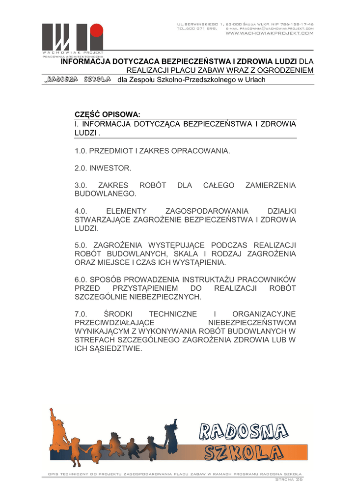 INFORMACJA DOTYCZACA BEZPIECZEŃSTWA I ZDROWIA LUDZI DLA REALIZACJI PLACU ZABAW WRAZ Z OGRODZENIEM „RADOSNA SZKOLA” dla Zespołu Szkolno-Przedszkolnego w Urlach CZĘŚĆ OPISOWA: I. INFORMACJA DOTYCZĄCA BEZPIECZEŃSTWA I ZDROWIA LUDZI . 1.0. PRZEDMIOT I ZAKRES OPRACOWANIA. 2.0. INWESTOR. 3.0. ZAKRES ROBÓT BUDOWLANEGO. DLA CAŁEGO ZAMIERZENIA 4.0. ELEMENTY ZAGOSPODAROWANIA DZIAŁKI STWARZAJĄCE ZAGROŻENIE BEZPIECZEŃSTWA I ZDROWIA LUDZI. 5.0. ZAGROŻENIA WYSTĘPUJĄCE PODCZAS REALIZACJI ROBÓT BUDOWLANYCH, SKALA I RODZAJ ZAGROŻENIA ORAZ MIEJSCE I CZAS ICH WYSTĄPIENIA. 6.0. SPOSÓB PROWADZENIA INSTRUKTAŻU PRACOWNIKÓW PRZED PRZYSTĄPIENIEM DO REALIZACJI ROBÓT SZCZEGÓLNIE NIEBEZPIECZNYCH. 7.0. ŚRODKI TECHNICZNE I ORGANIZACYJNE PRZECIWDZIAŁAJĄCE NIEBEZPIECZEŃSTWOM WYNIKAJĄCYM Z WYKONYWANIA ROBÓT BUDOWLANYCH W STREFACH SZCZEGÓLNEGO ZAGROŻENIA ZDROWIA LUB W ICH SĄSIEDZTWIE. opis techniczny do projektu zagospodarowania placu zabaw w ramach programu radosna szkoła Strona 26 INFORMACJA DOTYCZACA BEZPIECZEŃSTWA I ZDROWIA LUDZI DLA REALIZACJI PLACU ZABAW WRAZ Z OGRODZENIEM „RADOSNA SZKOLA” dla Zespołu Szkolno-Przedszkolnego w Urlach 1.0. PRZEDMIOT I ZAKRES OPRACOWANIA. Niniejsze opracowanie obejmuje zestawienie informacji o wszelkich zagrożeniach dla zdrowia i życia ludzi mogących wystapic w trakcie realizacji inwestycji oraz ustalenie zasad ich minimalizowania. INWESTOR: Gmina Jadów, ul. Jana Pawła II 17, 05-280 Jadów. 3.0. ZAKRES ROBÓT DLA CAŁEGO ZAMIERZENIA BUDOWLANEGO ORAZ KOLEJNOŚĆ REALIZACJI POSZCZEGÓLNYCH OBIEKTÓW: 3.1. Zagospodarowanie placu budowy. 3.1.1. Transport i lokalizacja kontenerów zaplecza administracyjnosocjalnego budowy. 3.1.2. Uzbrojenie terenu budowy. Podłączenie energii elektrycznej, wody i kanalizacji na czas budowy. 3.1.3. Tymczasowe wydzielenie placu budowy. 3.2. Roboty ziemne 3.2.1. Niwelacja terenu a. Usunięcie warstwy humusu ze złożeniem go na działce oraz częściowym wywozem. b. Korytowanie terenu z wywozem gruntu. c. Zasypki. 3.3 Prace pozostałe 3.3.1. Prace terenowe związane z wykonaniem podbudowy dla nawierzchni syntetycznych. 3.3.2. Zamontowanie urządzeń placu zabaw. 3.3.3. Wykonanie ciągów komunikacyjnych. 3.3.4. Ułożenie nawierzchni syntetycznej. opis techniczny do projektu zagospodarowania placu zabaw w ramach programu radosna szkoła Strona 27 3.3.5. Montaż docelowego ogrodzenia. 3.3.6. Zagospodarowanie terenów zielonych oraz montaż elementów małej architektury. 4.0. ELEMENTY ZAGOSPODAROWANIA DZIAŁKI ZAGROŻENIE BEZPIECZENSTWA I ZDROWIA LUDZI: Nie występują. STWARZAJACE 5.0. ZAGROŻENIA WYSTĘPUJĄCE PODCZAS REALIZACJI ROBÓT BUDOWLANYCH, SKALA I RODZAJ ZAGROŻENIA ORAZ MIEJSCE I CZAS ICH WYSTAPIENIA: 5.1. Roboty ziemne: usunięcie humusu, korytowanie terenu, wykopy fundamentowe, zasypywanie wykopów, niwelacja terenu. Zagrożenia: potrącenie (przejechanie) pracownika przez wywrotkę, koparkę lub spycharkę. 5.2. Montaż urządzeń i ogrodzenia. Zagrożenia: upadek z wysokości, uderzenie i przygniecenie montowanym elementem. 5.3. Eksploatacja urządzeń, maszyn i narzędzi. Zagrożenia: porażenie prądem, uszkodzenia ciała. 5.4. Komunikacja na placu budowy: ciągi piesze i drogi kołowe. Zagrożenia: a. potrącenie pracownika przez pojazd na placu budowy; b. zagrożeniem wynikającym z realizacji robót budowlanych związanych z inwestycją, jest ich prowadzenie w warunkach funkcjonowania istniejącej w pobliżu szkoły i wynikającej z tego faktu możliwości przebywania na terenie budowy osób postronnych. 6.0. SPOSÓB PROWADZENIA INSTRUKTAŻU PRACOWNIKÓW PRZED PRZYSTAPIENIEM DO REALIZACJI ROBÓT SZCZEGÓLNIE NIEBEZPIECZNYCH. opis techniczny do projektu zagospodarowania placu zabaw w ramach programu radosna szkoła Strona 28 Pracowników przystępujących do robót na terenie budowy należy przeszkolić na stanowisku pracy, zwracając ich uwagę na istotne zagrożenia wynikające z charakteru robót. W przypadku zatrudniania firm podwykonawczych, kierownik budowy zobowiązany jest do sprawdzenia czy ich pracownicy posiadają odpowiednie przeszkolenie. Fakt przeprowadzenia instruktażu z zakresu bhp oraz sprawdzenia pod tym kątem firm podwykonawczych odnotować należy w dzienniku budowy. 7.0. ŚRODKI TECHNICZNE I ORGANIZACYJNE PRZECIWDZIAŁAJACE NIEBEZPIECZEŃSTWOM WYNIKAJACYM Z WYKONYWANIA ROBÓT BUDOWLANYCH W STREFACH SZCZEGÓLNEGO ZAGROŻENIA ZDROWIA LUB W ICH SĄSIEDZTWIE: 7.1. Organizacja bezpieczenstwa pracy na placu budowy. 7.1.1 Kierownictwo budowy Za bezpieczeństwo pracy na placu budowy odpowiada kierownik budowy. 7.1.2. Podwykonawca Każdy podwykonawca jest odpowiedzialny za to, aby jego pracownicy przestrzegali wszelkich zasad obowiązujących na terenie placu budowy, jak również szczególnych zarządzeń, które mogą być wydawane w trakcie realizacji projektu. Jego pracownicy zostają poinformowani o wszelkich obowiązujacych zasadach i postanowieniach dotyczących bezpieczeństwa pracy. Wykonawca ma obowiazek zadbać o to, aby jego podwykonawcy stosowali sie do wszelkich obowiazujących zasad bezpieczeństwa. 7.1.3. Zachowanie zasad bezpieczenstwa Stosowanie sie do zasad bezpieczenstwa podczas prac prowadzonych na budowie posiada najwyższy priorytet. W przypadku wykroczeń względem zasad bezpieczeństwa inwestor zastrzega sobie prawo do przerywania prac podwykonawcy, a w przypadku powtórzenia się sytuacji również do wypowiedzenia umowy. 7.2 Bezpieczeństwo i porządek na placu budowy. 7.2.1. Wyposażenie placu budowy w środki bezpieczeństwa, ochrony zdrowia ludzi i sprzęt przeciwpożarowy oraz środki do udzielania pierwszej pomocy. a. Sprzęt ochrony osobistej • wymagane jest obuwie robocze; opis techniczny do projektu zagospodarowania placu zabaw w ramach programu radosna szkoła Strona 29 • okulary ochronne do prac z zagrożeniem przez odłamki; • rekawice ochronne do prac z materiałami , narzędziami lub maszynami w przypadku których ręce mogą być 