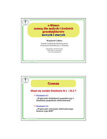 e-Biznes szansą dla małych i średnich przedsiębiorstw nowych i starych Wojciech Cellary Katedra Technologii Informacyjnych Uniwersytet Ekonomiczny w Poznaniu Mansfelda 4, 60-854 Poznań [email protected] www.kti.ue.poznan.pl (c) W. Cellary 2009, slajd 1 Geneza Skąd się wzięły Działania 8.1 i 8.2 ? Ö Działanie 8.1 „Wspieranie działalności gospodarczej w dziedzinie gospodarki elektronicznej” Ö Działanie 8.2 „Wspieranie wdrażania elektronicznego biznesu typu B2B” (c) W. Cellary 2009, slajd 2 Działanie 8.1 Wspieranie działalności gospodarczej w dziedzinie gospodarki elektronicznej Pytanie o przyszłość młodego pokolenia Polaków (c) W. Cellary 2009, slajd 3 Zmiana pokoleniowa Wykształcenie Pokolenie rządzących „Przyszłość narodu” Osoby w wieku 45-60 Osoby w wieku 19-24 11% ma wyższe wykształcenie 49% studiuje na uczelniach (c) W. Cellary 2009, slajd 4 Spójność społeczna w Polsce Wykształ Wykształceni ludzie potrzebują potrzebują pracy opartej na wiedzy Niewykształ Niewykształceni ludzie potrzebują potrzebują usł ł ug opartych na wiedzy us (c) W. Cellary 2009, slajd 5 Strategiczne zadanie rządu Utworzenie elektronicznej gospodarki opartej na wiedzy Ö miejsca pracy opartej na wiedzy dla wykształconej polskiej młodzieży Ö usługi oparte na wiedzy dla całego społeczeństwa i biznesu e-Gospodarka oparta na wiedzy jest też też jedyną jedyną szansą szansą na uzyskanie dł długoterminowych korzyś korzyści z integracji z UE (c) W. Cellary 2009, slajd 6 Działanie 8.1 (c) W. Cellary 2009, slajd 7 2 mln. studentów w Polsce Technika, przemysł, budownictwo 13% Informatyka 5% Matematyka i statystyka 1% Pedagogika 12% Nauki humanistyczne i sztuka 10% Fizyka 2% Rolnictwo 2% Biologia 2% Zdrowie i opieka społeczna 5% Nauki społeczne 15% Usługi 6% Prawo 3% Ekonomia 24% (c) W. Cellary 2009, slajd 8 Cyfrowa Polska dla Każdego Działanie 8.1 ÖPraca dla ludzi z wszystkich zawodów i dyscyplin: humanistycz h społec nych przyrodniczych icznyc znych m o n o ek medycznych ch artystycz techniczny ny c h ÖUsługi cyfrowe z wszystkich dziedzin: szko lnict wo rozrywka zdrowie finanse napraw y a prawo w r a u administracja k t acje y kul zakup (c) W. Cellary 2009, slajd 9 Plan Program Cyfrowa Polska dla Każdego Tworzenie i uaktualnianie treści cyfrowych dla różnych społeczności Świadczenie usług cyfrowych dla różnych społeczności Elektroniczna gospodarka oparta na wiedzy Treści i usługi cyfrowe dla przedsiębiorstw Treści i usługi cyfrowe na eksport (c) W. Cellary 2009, slajd 10 Odpłatność e-Usługi muszą być płatne e-Usługi muszą być tak użyteczne, czyli tak potrzebne i tak atrakcyjne dla klienta, aby był gotów za nie zapłacić Dlaczego ? (c) W. Cellary 2009, slajd 11 Po co młodzi ludzie studiują ? Ludzie po to studiują studiują, aby pracować pracować w ee-gospodarce opartej na wiedzy Świadczenie usług opartych na wiedzy Ö odkrywanie wiedzy • badania Ö wykorzystywanie wiedzy • konstruowanie (produktów, usług, procesów) • wdrażanie • reorganizacja Ö przekazywanie wiedzy • uczenie • konsultowanie • doradzanie (c) W. Cellary 2009, slajd 12 Usługi oparte na wiedzy Ö Jeśli po naturalnej wymianie pokoleń, połowa społeczeństwa będzie chciała utrzymywać się ze świadczenia usług opartych na wiedzy to: świadczenie usług opartych na wiedzy musi być działalnością gospodarczą (c) W. Cellary 2009, slajd 13 Ostrzeżenie niewykształcona połowa społeczeństwa zarabia na pracy fizycznej w sektorze prywatnym i płaci podatki na utrzymanie sektora publicznego Społeczeństwo wykształcona połowa społeczeństwa utrzymuje się z podatków świadcząc „za darmo” usługi oparte na wiedzy Taki model gospodarczy jest całkowicie nierealistyczny (c) W. Cellary 2009, slajd 14 Specyfika wiedzy Im większa wiedza w społeczeństwie, tym większe zapotrzebowanie na wiedzę (c) W. Cellary 2009, slajd 15 Niestabilność Ö Im więcej wiedzy damy społeczeństwu za darmo, tym więcej będzie jej żądać wykształcona połowa społeczeństwa Ö Zatem tym większe będą musiały być obciążenia podatkowe niewykształconej połowy społeczeństwa Dodatnie sprzężenie zwrotne zawsze prowadzi do niestabilności Taki system musi upaść ! (c) W. Cellary 2009, slajd 16 Sektor wiedzy Dlatego Sektor wiedzy musi być przede wszystkim sektorem gospodarczym Ö Kupno – sprzedaż produktów i usług opartych na wiedzy Ö Generowanie przychodów dla budżetu państwa ze sprzedaży wiedzy Ö Generowanie zysku dla przedsiębiorstw wiedzy e-Gospodarka oparta na wiedzy Racja bytu młodego pokolenia (c) W. Cellary 2009, slajd 17 Działanie 8.2 Wspieranie wdrażania elektronicznego biznesu typu B2B (c) W. Cellary 2009, slajd 18 Główne zalety elektronicznej gospodarki Ö skrócenie czasu realizacji procesów biznesowych Ö zmniejszenie kosztów realizacji procesów biznesowych Ö uniezależnienie procesów biznesowych od odległości geograficznych Ö możliwość automatycznej reakcji na sygnał inicjujący proces biznesowy „Papierowa” gospodarka nie jest w stanie konkurować z elektroniczną (c) W. Cellary 2009, slajd 19 Transformacja biznesu Cechy elektronicznej informacji i komunikacji powodują powodują bycie „on-line” w przestrzeni bez geografii pozyskiwanie informacji zewsząd w czasie rzeczywistym ª możliwość skontaktowania się z każdym w każdej chwili Dynamizm i różnorodność (c) W. Cellary 2009, slajd 20 Dynamizm Ciągła zmienność: Ö rynków Ö klientów, dostawców, partnerów biznesowych Ö technologii i metod pracy, w tym oprogramowania Ö organizacji pracy, w tym telepracy Ö ram prawnych (c) W. Cellary 2009, slajd 21 Różnorodność Zróżnicowanie Skala makro (Unia Europejska +) Ö geograficzne Ö prawne Ö kulturowe Ö produktowe Ö usługowe Skala mikro Ö dążenie do realizacji całościowych potrzeb klientów (c) W. Cellary 2009, slajd 22 Właściwa organiza