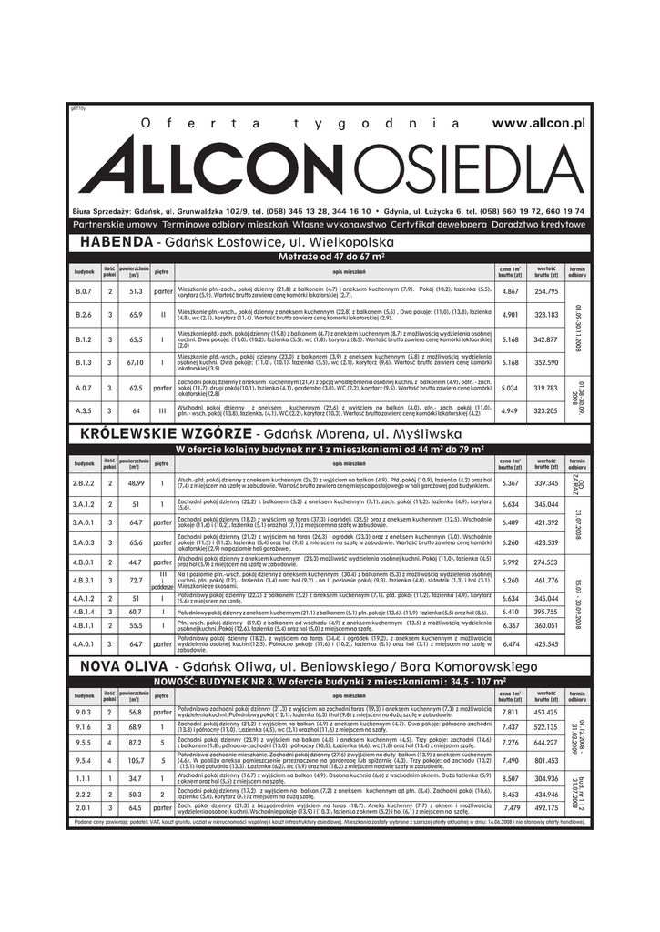 g6715y Partnerskie umowy Terminowe odbiory mieszkań Własne wykonawstwo Certyfikat dewelopera Doradztwo kredytowe HABENDA - Gdańsk Łostowice, ul. Wielkopolska Metraże od 47 do 67 m2 budynek ilość powierzchnia pokoi [m2] cena 1m2 brutto [zł] wartość brutto [zł] Mieszkanie płn.-zach., pokój dzienny (21,8) z balkonem (4,7) i aneksem kuchennym (7,9). Pokój (10,2), łazienka (5,5), parter korytarz (5,9). Wartość brutto zawiera cenę komórki lokatorskiej (2,7). 4.867 254.795 piętro opis mieszkań termin odbioru 2 51,3 B.2.6 3 65,9 II Mieszkanie płn.-wsch., pokój dzienny z aneksem kuchennym (22,8) z balkonem (5,5) . Dwa pokoje: (11,0), (13,8), łazienka (4,8), wc (2,1), korytarz (11,4). Wartość brutto zawiera cenę komórki lokatorskiej (2,9). 4.901 328.183 B.1.2 3 65,5 I Mieszkanie płd.-zach. pokój dzienny (19,8) z balkonem (4,7) z aneksem kuchennym (8,7) z możliwością wydzielenia osobnej kuchni. Dwa pokoje: (11,0), (10,2), łazienka (5,5), wc (1,8), korytarz (8,5). Wartość brutto zawiera cenę komórki loktaorskiej (2,0) 5.168 342.877 B.1.3 3 67,10 I Mieszkanie płd.-wsch., pokój dzienny (23,0) z balkonem (3,9) z aneksem kuchennym (5,8) z możliwością wydzielenia osobnej kuchni. Dwa pokoje: (11,0), (10,1), łazienka (5,5), wc (2,1), korytarz (9,6). Wartość brutto zawiera cenę komórki lokatorskiej (3,5) 5.168 352.590 A.0.7 3 62,5 parter pokój (11,7), drugi pokój (10,1), łazienka (4,1), garderoba (3,0), WC (2,2), korytarz (9,5). Wartość brutto zawiera cenę komórki 5.034 319.783 A.3.5 3 64 Wschodni pokój dzienny z aneksem kuchennym (22,6) z wyjściem na balkon (4,0), płn.- zach. pokój (11,0), płn. - wsch. pokój (13,8), łazienka, (4,1), WC (2,2), korytarz (10,3). Wartość brutto zawiera cenę komórki lokatorskiej (4,2) 4.949 323.205 01.08-30.09. 2008 cena 1m2 brutto [zł] wartość brutto [zł] termin odbioru Zachodni pokój dzienny z aneksem kuchennym (21,9) z opcją wyodrębnienia osobnej kuchni, z balkonem (4,9), półn. - zach. lokatorskiej (2,8) III 01.09-30.11.2008 B.0.7 KRÓLEWSKIE WZGÓRZE - Gdańsk Morena, ul. Myśliwska W ofercie kolejny budynek nr 4 z mieszkaniami od 44 m2 do 79 m2 budynek ilość powierzchnia pokoi [m2] piętro opis mieszkań 1 Wsch.-płd. pokój dzienny z aneksem kuchennym (26,2) z wyjściem na balkon (4,9). Płd. pokój (10,9), łazienka (4,2) oraz hol (7,4) z miejscem na szafę w zabudowie. Wartość brutto zawiera cenę miejsca postojowego w hali garażowej pod budynkiem. 6.367 339.345 3.A.1.2 2 51 1 Zachodni pokój dzienny (22,2) z balkonem (5,2) z aneksem kuchennym (7,1), zach. pokój (11,2), łazienka (4,9), korytarz (5,6). 6.634 345.044 parter Zachodni pokój dzienny (18,2) z wyjściem na taras (37,3) i ogródek (32,5) oraz z aneksem kuchennym (12,5). Wschodnie pokoje (11,6) i (10,2), łazienka (5,1) oraz hol (7,1) z miejscem na szafę w zabudowie. 6.409 421.392 parter Zachodni pokój dzienny (21,2) z wyjściem na taras (26,3) i ogródek (23,3) oraz z aneksem kuchennym (7,0). Wschodnie pokoje (11,5) i (11,2), łazienka (5,4) oraz hol (9,3) z miejscem na szafę w zabudowie. Wartość brutto zawiera cenę komórki lokatorskiej (2,9) na poziomie hali garażowej. 6.260 423.539 parter Wschodni pokój dzienny z aneksem kuchennym (23,3) możliwość wydzielenia osobnej kuchni. Pokój (11,0), łazienka (4,5) oraz hol (5,9) z miejscem na szafę w zabudowie. 5.992 274.553 6.260 461.776 3.A.0.1 3.A.0.3 4.B.0.1 3 3 2 64,7 65,6 44,7 Na I poziomie płn.-wsch. pokój dzienny z aneksem kuchennym (30,4) z balkonem (5,3) z możliwością wydzielenia osobnej kuchni, płn. pokój (12), łazienka (3,4) oraz hol (9,2) , na II poziomie pokój (9,3), łazienka (4,0), składzik (1,3) i hol (3,1). i poddasze Mieszkanie ze skosami. Południowy pokój dzienny (22,2) z balkonem (5,2) z aneksem kuchennym (7,1), płd. pokój (11,2), łazienka (4,9), korytarz I (5,6) z miejscem na szafę. 4.B.3.1 3 4.A.1.2 2 51 6.634 345.044 4.B.1.4 3 60,7 I Południowy pokój dzienny z aneksem kuchennym (21,1) z balkonem (5,1) płn. pokoje (13,6), (11,9) łazienka (5,5) oraz hol (8,6). 6.410 395.755 4.B.1.1 2 55,5 I Płn.-wsch. pokój dzienny (19,0) z balkonem od wschodu (4,9) z aneksem kuchennym (13,5) z możliwością wydzielenia osobnej kuchni. Pokój (12,6), łazienka (5,4) oraz hol (5,0) z miejscem na szafę. 6.367 360.051 parter Południowy pokój dzienny (18,2), z wyjściem na taras (34,4) i ogródek (19,2), z aneksem kuchennym z możliwością wydzielenia osobnej kuchni(12,5). Północne pokoje (11,6) i (10,2), łazienka (5,1) oraz hol (7,1) z miejscem na szafę w zabudowie. 6.474 425.545 4.A.0.1 3 72,7 III 64,7 15.07 - 30.09.2008 48,99 31.07.2008 2 OD ZARAZ 2.B.2.2 NOVA OLIVA - Gdańsk Oliwa, ul. Beniowskiego / Bora Komorowskiego NOWOŚĆ: BUDYNEK NR 8. W ofercie budynki z mieszkaniami: 34,5 - 107 m2 budynek ilość powierzchnia pokoi [m2] piętro opis mieszkań cena 1m2 brutto [zł] wartość brutto [zł] 56,8 parter 7.811 453.425 3 68,9 1 Zachodni pokój dzienny (21,2) z wyjściem na balkon (4,9) z aneksem kuchennym (4,7). Dwa pokoje: północno-zachodni (13,8) i północny (11,0). Łazienka (4,5), wc (2,1) oraz hol (11,6) z miejscem na szafy. 7.437 522.135 5 Zachodni pokój dzienny (23,9) z wyjściem na balkon (4,8) i aneksem kuchennym (4,5). Trzy pokoje: zachodni (14,6) z balkonem (1,8), północno-zachodni (13,0) i północny (10,5). Łazienka (4,6), wc (1,8) oraz hol (13,4) z miejscem szafę. 7.276 644.227 5 Południowo-zachodnie mieszkanie. Zachodni pokój dzienny (27,6) z wyjściem na duży balkon (13,9) z aneksem kuchennym (4,6). W pobliżu aneksu pomieszczenie przeznaczone na garderobę lub spiżarnię (4,3). Trzy pokoje: od zachodu (10,2) i (15,1) i od południa (13,3). Łazienka (6,2), wc (1,9) oraz hol (18,2) z miejscem na dwie szafy w zabudowie. 7.490 801.453 1 Wschodni pokój dzienny (16,7) z wyjściem na balkon (4,9). Osobna kuchnia (6,6) z wschodnim oknem. Duża łazienka (5,9) z oknem oraz hol (5,5) z miejscem na szafę. 8.507 304.