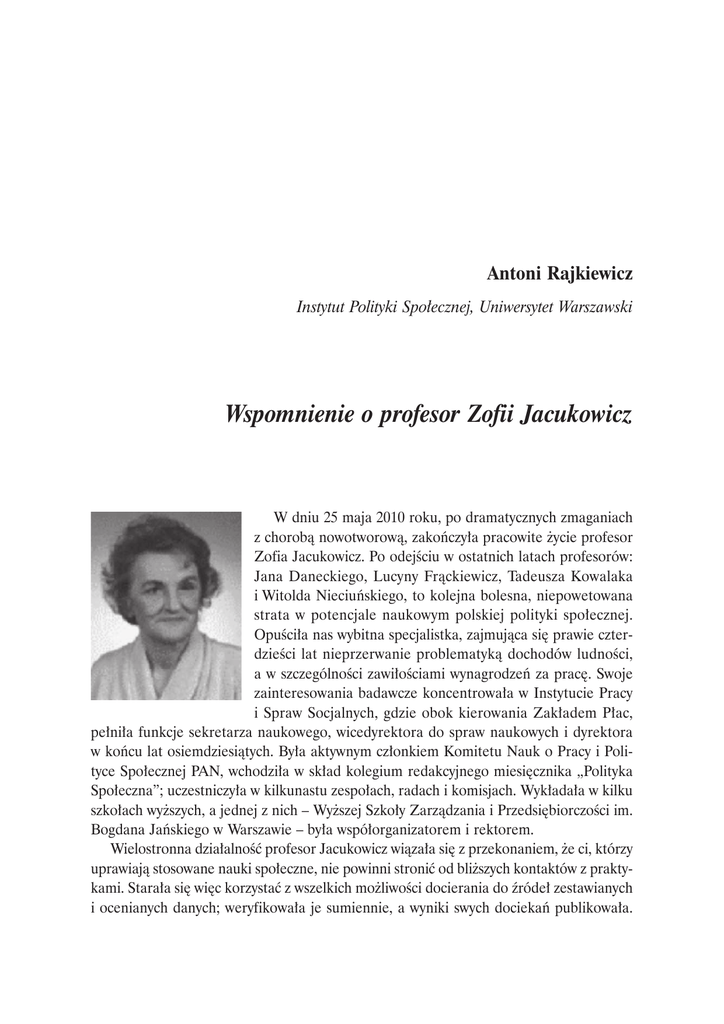 Antoni Rajkiewicz Instytut Polityki Spoïecznej, Uniwersytet Warszawski Wspomnienie o profesor Zofii Jacukowicz W dniu 25 maja 2010 roku, po dramatycznych zmaganiach z chorobą nowotworową, zakończyła pracowite życie profesor Zofia Jacukowicz. Po odejściu w ostatnich latach profesorów: Jana Daneckiego, Lucyny Frąckiewicz, Tadeusza Kowalaka i Witolda Nieciuńskiego, to kolejna bolesna, niepowetowana strata w potencjale naukowym polskiej polityki społecznej. Opuściła nas wybitna specjalistka, zajmująca się prawie czterdzieści lat nieprzerwanie problematyką dochodów ludności, a w szczególności zawiłościami wynagrodzeń za pracę. Swoje zainteresowania badawcze koncentrowała w Instytucie Pracy i Spraw Socjalnych, gdzie obok kierowania Zakładem Płac, pełniła funkcje sekretarza naukowego, wicedyrektora do spraw naukowych i dyrektora w końcu lat osiemdziesiątych. Była aktywnym członkiem Komitetu Nauk o Pracy i Polityce Społecznej PAN, wchodziła w skład kolegium redakcyjnego miesięcznika „Polityka Społeczna”; uczestniczyła w kilkunastu zespołach, radach i komisjach. Wykładała w kilku szkołach wyższych, a jednej z nich – Wyższej Szkoły Zarządzania i Przedsiębiorczości im. Bogdana Jańskiego w Warszawie – była współorganizatorem i rektorem. Wielostronna działalność profesor Jacukowicz wiązała się z przekonaniem, że ci, którzy uprawiają stosowane nauki społeczne, nie powinni stronić od bliższych kontaktów z praktykami. Starała się więc korzystać z wszelkich możliwości docierania do źródeł zestawianych i ocenianych danych; weryfikowała je sumiennie, a wyniki swych dociekań publikowała. 12 Antoni Rajkiewicz Publikowała je z reguły z myślą, by spełniały rolę edukacyjną i kreatywną w kształtowaniu polityki płac, a szerzej rzecz ujmując – ochronie ludności. Badania dotyczące zróżnicowania wynagrodzeń na tle ich dynamiki i struktury zatrudnienia, wartościowanie pracy oraz opracowania porządkujące sferę zarobków i towarzyszących im świadczeń stanowią trwały wkład do wiedzy o ekwiwalentnej roli płac i ich miejscu oraz znaczeniu w kategorii kosztów pracy. Profesor Jacukowicz kilkakrotnie zabierała głos na łamach „Problemów Polityki Społecznej”. W numerze 12. w obszernym artykule noszącym tytuł Pytania o teoriÚ pïac w sposób jednoznaczny wypowiedziała się za rolą płacy jako ekwiwalentu za pracę, przy czym „wysokość wynagrodzenia powinna być różnicowana proporcjonalnie do wartości pracy” (s. 107). Równocześnie przeciwstawiła się przekonaniu, że „płace kształtowane są na rynku” (s. 119). Dodała przy tym, że „przeświadczenie, że to rynek kształtuje wysokość płac, zwalnia pracodawców z dbałości o jej związek z pracą, o sprawiedliwe i terminowe wypłacanie wynagrodzenia” (tamże). Z przytoczonym poglądem komunikuje ostra uwaga zamieszczona w tym samym numerze „Problemów” w dziale „Forum o partycypacji pracowniczej”. Jest to uwaga o „ogromnej pazerności większości pracodawców” (s. 213). Powyżej przytoczone poglądy, które można uzupełnić zdecydowanymi zmaganiami o wynagrodzenie minimalne i o uwzględnienie minimum socjalnego w praktyce dochodów ludności, pozwalają zaliczyć profesor Jacukowicz do nielicznego dzisiaj grona badaczy odważnych, jawnie wypowiadających się przeciwko neoliberalnej polityce gospodarczej, błogosławiącej i wspierającej pochód nierówności społecznych. Z profesor Zofią Jacukowicz współpracowałem w przyjaźni prawie czterdzieści lat w różnych konstelacjach instytucjonalnych. W zajęciach dydaktycznych i w działaniach publicznych korzystałem z jej bogatego dorobku naukowego, podziwiałem pracowitość, sumienność i inwencję twórczą. Była osobą życzliwą, pogodną i niezawodną w realizacji podejmowanych zobowiązań i w uzgodnieniach. W czasie odwiedzin domowych poznałem małżonka pani profesor – pana Kazimierza, mgr. inż. komunikacji; pełnił on nieprzerwanie od 1969 roku do 1983 roku funkcję podsekretarza stanu w Ministerstwie Komunikacji; gdzie odpowiadał za rozwój sieci i ważnych obiektów kolejowych. Małżeństwo świetnie się uzupełniało, było małżeństwem twórczym. Pozostawiło po sobie trwałe ślady pracowitego życia. W różnych dziedzinach: ona – w infrastrukturze stosowanych nauk społecznych, on – w infrastrukturze polskiego transportu. Zmarł w dniu 26 października 2010 roku. Warto na zakończenie przytoczyć fragment wspomnienia pióra profesor Bożeny Balcerzak-Paradowskiej, dyrektor Instytutu Pracy i Spraw Socjalnych: „Pasja badawcza pozostała przy Niej do końca. Walcząc z nieuleczalną chorobą, świadoma konsekwencji tych zmagań, nie zaprzestała pracy nad ostatnim opracowaniem – książką poświęconą wynagrodzeniom za pracę we współczesnej gospodarce. Jak mówiła – »będzie to zwieńczenie całego mojego dorobku«. I jest. Na kilka tygodni przed śmiercią przekazała opracowanie do Instytutu”. Z zainteresowaniem czekamy na publikację, a również na pełną bibliografię, jaką zapewne przygotuje Główna Biblioteka Pracy i Zabezpieczenia Społecznego. Ukaże ona skalę i zakres dorobku naukowego, który nie sposób pomijać przy omawianiu różnych segmentów polityki społecznej. Wspomnienie o profesor Zofii Jacukowicz 13 Odnotujmy na zakończenie, że profesor Zofia Jacukowicz urodziła się 3 lipca 1930 roku w Gutowie, w rodzinie nauczycielskiej. Ojciec zginął w obozie koncentracyjnym w 1942 roku. Studia wyższe ukończyła w Szkole Głównej Planowania i Statystyki w 1955 r. i w tej uczelni obroniła pracę doktorską w 1971 roku, habilitowała się w 1976 r. Tematem rozprawy habilitacyjnej były proporcje płac w Polsce. Nominację profesorską otrzymała w 1986 r. Od roku 1972 pracowała nieprzerwanie w Instytucie Pracy i Spraw Socjalnych. Pogrzeb odbył się 2 czerwca 2010 roku na Powązkach Wojskow