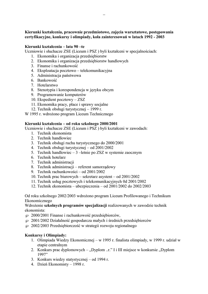 -- Kierunki kształcenia, pracownie przedmiotowe, zajęcia warsztatowe, postępowania certyfikacyjne, konkursy i olimpiady, koła zainteresowań w latach 1992 - 2003 Kierunki kształcenia – lata 90 –te Uczniowie i słuchacze ZSE (Liceum i PSZ ) byli kształceni w specjalnościach: 1. Ekonomika i organizacja przedsiębiorstw 2. Ekonomika i organizacja przedsiębiorstw handlowych 3. Finanse i rachunkowość 4. Eksploatacja pocztowo – telekomunikacyjna 5. Administracja państwowa 6. Bankowość 7. Hotelarstwo 8. Stenotypia i korespondencja w języku obcym 9. Programowanie komputerów 10. Ekspedient pocztowy – ZSZ 11. Ekonomika pracy, płace i sprawy socjalne 12. Technik obsługi turystycznej – 1999 r. W 1995 r. wdrożono program Liceum Technicznego Kierunki kształcenia – od roku szkolnego 2000/2001 Uczniowie i słuchacze ZSE (Liceum i PSZ ) byli kształceni w zawodach: 1. Technik ekonomista 2. Technik handlowiec 3. Technik obsługi ruchu turystycznego do 2000/2001 4. Technik obsługi turystycznej – od 2001/2002 5. Technik handlowiec – 3 –letnie po ZSZ w systemie zaocznym 6. Technik hotelarz 7. Technik administracji 8. Technik administracji – referent samorządowy 9. Technik rachunkowości – od 2001/2002 10. Technik prac biurowych – sekretarz asystent – od 2001/2002 11. Technik usług pocztowych i telekomunikacyjnych 0d 2001/2002 12. Technik ekonomista – ubezpieczenia – od 2001/2002 do 2002/2003 Od roku szkolnego 2002/2003 wdrożono program Liceum Profilowanego i Technikum Ekonomicznego Wdrożenie szkolnych programów specjalizacji realizowanych w zawodzie technik ekonomista: √ 2000/2001 Finanse i rachunkowość przedsiębiorców, √ 2001/2002 Działalność gospodarcza małych i średnich przedsiębiorców √ 2002/2003 Przedsiębiorczość w strategii rozwoju regionalnego Konkursy i Olimpiady: 1. Olimpiada Wiedzy Ekonomicznej – w 1995 r. finalista olimpiady, w 1999 r. udział w etapie centralnym 2. Konkurs prac dyplomowych – „Dyplom ..r.” I i III miejsce w konkursie „Dyplom 1997” 3. Konkurs wiedzy statystycznej – od 1994 r. 4. Dzień Ekonomisty – 1998 r. -- 5. 6. 7. 8. 9. Konkurs „Hotelarz roku” i organizacja „Dnia hotelarza” od 1998 r. Konkurs Wiedzy z rachunkowości i finansów jednostek gospodarczych – 2001/2002 Konkurs Specjalność mojego domu – zakąski zimne – 2001/2002 Konkurs Wiedzy o Unii Europejskiej – 2001/2002 Konkurs Sprawnego pisania na maszynie dla klas I Liceum Profilowanego od 2002/2003 10. Konkurs Wiedzy i Umiejętności Handlowo – Menadżerskich - od 2002/2003 ( finalista ) 11. Konkurs Wiedzy Hotelarskiej – finalista w roku szkolnym 2002/2003 Od 1999 r. organizacja „Dni otwartych szkoły” Postępowania certyfikacyjne: 1. Obsługi edytora tekstów WORD i sporządzania pism – 2000/2001 2. Mistrz klawiatury – 2001/2002 3. Prowadzenie książki przychodów i rozchodów za pomocą komputera – 2001/2002 4. Wykorzystanie arkuszy kalkulacyjnych w obliczeniach ekonomicznych – 2001/2002 5. Prawa i obowiązki sprzedawcy i konsumenta – od 2002/2003 Zajęcia warsztatowe: 1. Tworzenie biznes planu – 2000/2001 2. Rozliczenia roczne z tytułu podatku dochodowego osób fizycznych – 2001/2002 3. Rodzaje diet i ich charakterystyka – 2002/2003 Obsługa programów Word, Power Point i Excel – zajęcia prowadzone dla nauczycieli – 2001/2002 Pracownie przedmiotowe: 1. Stworzenie pracowni komputerowej multimedialnej i podłączenie trzech pracowni do internetu – 1996 r. 2. Pracownia przedmiotów ekonomicznych – 1997 r. 3. Pracownia hotelarstwa – 1996 r. 4. Pracownia rachunkowości – 1997 r. 5. Pracownia bankowości – 1997 r. 6. Pracownia przedsiębiorczości – 2000 r. Koła zainteresowań: Koło internetowe - 1999/2000 Koło ekonomiczne – 2001/2002
