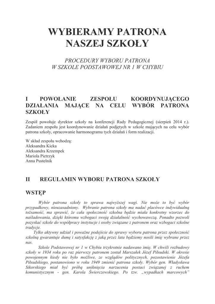 WYBIERAMY PATRONA NASZEJ SZKOŁY PROCEDURY WYBORU PATRONA W SZKOLE PODSTAWOWEJ NR 1 W CHYBIU I POWOŁANIE ZESPOŁU KOORDYNUJĄCEGO DZIAŁANIA MAJĄCE NA CELU WYBÓR PATRONA SZKOŁY Zespół powołuje dyrektor szkoły na konferencji Rady Pedagogicznej (sierpień 2014 r.). Zadaniem zespołu jest koordynowanie działań podjętych w szkole mających na celu wybór patrona szkoły, opracowanie harmonogramu tych działań i form realizacji. W skład zespołu wchodzą: Aleksandra Kicka Aleksandra Krzempek Mariola Pietrzyk Anna Pustelnik II REGULAMIN WYBORU PATRONA SZKOŁY WSTĘP Wybór patrona szkoły to sprawa najwyższej wagi. Nie może to być wybór przypadkowy, nieuzasadniony. Wybranie patrona szkoły ma nadać placówce indywidualną tożsamość, ma sprawić, że cała społeczność szkolna będzie miała konkretny wzorzec do naśladowania, dzięki któremu wzbogaci swoją działalność wychowawczą. Ponadto pozwoli pozyskać szkole do współpracy instytucje i osoby związane z patronem oraz wzbogaci szkolne tradycje. Tylko aktywny udział i poważne podejście do sprawy wyboru patrona przez społeczność szkolną gwarantuje dumę i satysfakcję z jaką przez lata będziemy nosili imię wybrane przez nas. Szkole Podstawowej nr 1 w Chybiu trzykrotnie nadawano imię. W chwili rozbudowy szkoły w 1934 roku po raz pierwszy patronem został Marszałek Józef Piłsudski. W okresie powojennym kiedy nie było możliwe, ze wzglądów politycznych, pozostawienie Józefa Piłsudskiego, postanowiono w roku 1949 zmienić patrona szkoły. Wybór gen. Władysława Sikorskiego miał być próbą uniknięcia narzucenia postaci związanej z ruchem komunistycznym - gen. Karola Świerczewskiego. Po tzw. „wypadkach marcowych” w 1968 roku przywódcy Polskiej Zjednoczonej Partii Robotniczej przystąpili do likwidacji w życiu publicznym wszelkich symboli niezwiązanych z ruchem komunistycznym. W państwie totalitarnym jakim była PRL, gen. Sikorski nie mógł patronować żadnej instytucji Na tej fali już pod koniec kwietnia tego roku nowym patronem szkoły został Feliks Dzierżyński, z pochodzenia Polak, przywódca CzeKa – służby bezpieczeństwa powstałej w trakcie Rewolucji Październikowej w Rosji, przeznaczonej do zwalczania działalności antyrewolucyjnej poprzez terror. Człowiek ten skazał na śmierć tysiące niewinnych ludzi, ale w tamtym czasie uznawany był za bohatera. Dziesięć lat później, by utrwalić jego postać w świadomości uczniów, na korytarzu pierwszego piętra szkoły umieszczono specjalną tablicę i portret Dzierżyńskiego. W wyniku przemian ustrojowych w Polsce w 1989 roku, podjęto decyzję o usunięciu dotychczasowego patrona szkoły. Nasza placówka jest jedyną szkołą podstawową w Gminie Chybie, która nie ma swojego patrona. Doskonałą okazją, aby zmienić tę sytuację jest rok jubileuszowy obchodów dwustulecia oświaty w Chybiu. Rada Pedagogiczna naszej szkoły pojęła inicjatywę powrotu do tradycji posiadania patrona. Trudna i skomplikowana historia naszego państwa nie zostawia żadnych wątpliwości, że może nim być tylko wielki patriota i człowiek zasłużony dla naszej Ojczyzny. III PROCEDURA WYBORU PATRONA PODSTAWOWEJ NR 1 W CHYBIU 1. W procesie wyboru patrona szkoły uczestniczą uczniowie, nauczyciele, pracownicy szkoły i rodzice. Za przebieg wyboru patrona przez uczniów i ich rodziców są odpowiedzialni wychowawcy klas. Za przebieg wyboru patrona przez nauczycieli i pracowników szkoły są odpowiedzialni członkowie zespołu koordynującego (A. Krzempek, A. Pustelnik). 2. 3. W SZKOLE Wybór kandydata na patrona przez uczniów: 4. Wychowawcy klas przeprowadzają lekcje wychowawcze związane z wyborem kandydata na patrona szkoły (od 7 – 16 stycznia 2015 r.). Prezentacja wyborcza kandydata polega na przedstawieniu charakterystyki, dorobku, osiągnięć; argumentów na rzecz danego kandydata jako autorytetu dla uczniów. Członek zespołu koordynującego (M. Pietrzyk) przygotowuje gazetkę ścienną prezentującą sylwetki kandydatów. W drodze głosowania każda klasa wybiera jednego kandydata w dniach 19-21 stycznia 2015 r. Wychowawcy klas przekazują karty do głosowania członkom zespołu koordynującego (A. Krzempek, A. Pustelnik). Wybór kandydata na patrona przez nauczycieli i pracowników szkoły 5. Spośród zgłoszonych propozycji nauczyciele i pracownicy szkoły, przez głosowanie, wybierają jednego kandydata w dniu 22 stycznia 2015 r. Członkowie zespołu koordynującego (A. Krzempek, A. Pustelnik) przeprowadzają głosowanie. Wybór kandydata na patrona przez rodziców 6. Dyrektor szkoły informuje rodziców na zebraniu o realizacji projektu. Wychowawcy klas przeprowadzają głosowanie podczas zebrania rodziców w dniu 29 stycznia 2015 r. Wychowawcy klas przekazują karty do głosowania członkom zespołu koordynującego (A. Krzempek, A. Pustelnik).