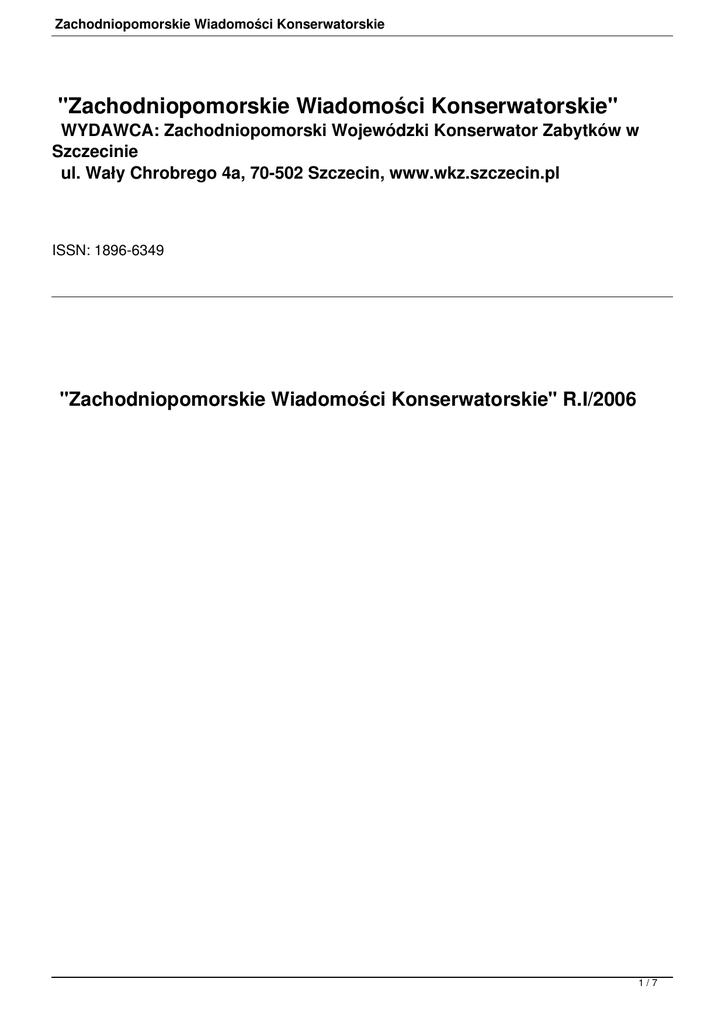 Zachodniopomorskie Wiadomości Konserwatorskie "Zachodniopomorskie Wiadomości Konserwatorskie" WYDAWCA: Zachodniopomorski Wojewódzki Konserwator Zabytków w Szczecinie ul. Wały Chrobrego 4a, 70-502 Szczecin, www.wkz.szczecin.pl ISSN: 1896-6349 "Zachodniopomorskie Wiadomości Konserwatorskie" R.I/2006 1/7 Zachodniopomorskie Wiadomości Konserwatorskie Pobierz spis treści "Zachodniopomorskie Wiadomości Konserwatorskie" R.II/2007 2/7 Zachodniopomorskie Wiadomości Konserwatorskie STUDIA zachodniopomorskiego XVI studium przestrzennego. przestrzennego, ?Dawne PRACE konserwacja województwa metalu, SPRAWOZDANIA Dokumentacji Szczecinie Zabytków RECENZJE 2006 SILVA - do Ewa Józefowska Kalita Wolender Kulesza-Szerniewicz Bartosz Mazurkiewicz Witek Koutny-Giedrys Makowska Nowakowski Jankowska Opęchowski Kołosowski Kowalska roku. XXI ceramiki KONSERWATORSKIE urbanistyczno-konserwatorskim konstrukcje I BADANIA w Stanecka za wieku. Maria, Skwirzyńska Szczecinie Iobiektu Dorota, OMÓWIENIA zachodniopomorskiego Zabytków 2006 Tomasz Ewa stan Beata iMałgorzata Przemysław Marlena malarstwa. Mirosław Historia Witek Cezary Krzysztof rok. --po obecny Mirosława, Słomiński Wstęp 50 nowe -(cz. za 1945 -w Sprawozdanie Waldemar Kazimiera, lat Osiedle --2006 iOlga Sprawozdanie -współczesne wschodnia). Przypadkowe marzenia? minęło -Omówienie i-roku. -Sprawozdanie Barokowa możliwości Baldwin Park Maciej -rok. Giedrys Kalisz Nowe ... -Stanecka Kulturowy Warsztaty na (O -SchulzezPomorski. Miasto Wierzbno do Procedura przykładach fontanna publikacji Feliksie działalności Ryszard przekształcenia rewaloryzacji. znaleziska zplanu działalności zEwa działalności Chwarszczany w konserwatorsko-budowlane witrażysta imiejscowego Szczecinie -przy Danucie ?zapomniane Etapy konserwatorskich -postępowania Konserwacja Kołbacz. Szczecinie przedmiotów wybranych Regionalnego pl.Biura formowania oraz Orła biura ze Ptaszyńskich) ?Zespół Szczecina Dokumentacji problemy problematyka Białego zagospodarowania za miasto obiektów Miejskiego zabytków zzabytkowych 2006 przypadkowymi Ośrodka ipoklasztorny historycznego pokrewnych wnad konserwatorskie. rok. Szczecinie rzeźby zw Konserwatora Miedwiem Zabytków terenu Badań konserwatorska Słowinie: z kamiennej, województwa w wydanych odkryciami. układ iokresie - w od w w "Zachodniopomorskie Wiadomości Konserwatorskie" R.III/2009 3/7 Zachodniopomorskie Wiadomości Konserwatorskie 4/7 Zachodniopomorskie Wiadomości Konserwatorskie Studia i badania - Tatiana Balcerzak - Zamek w Drawnie. Inwentaryzacja i badania architektoniczne reliktów zamku. - Radosław Walkiewicz - Dawna zajezdnia tramwajów konnych na rogu al. Wojska Polskiego i ul. Piotra Skargi w Szczecinie - Kamila Wójcik - Detal zabytkowy domów mieszkalnych gminy Nowe Warpno - Aleksandra Hamberg - Fedorowicz - Elewator zbożowy "Ewa" w szczecińskim porcie modernistyczny zabytek techniki - Dominika Szerniewicz - Zabytkowy zespół zieleni dawnego majątku w Chełmie Dolnym w gminie Trzcińsko Zdrój - Anna Małgorzata Walkiewicz - Ogrody zaginione. Działalność Petera Josepha Lenne na terenie Szczecina Działania konserwatorskie - Waldemar i Maria Witkowie - Lapidarium w Słowinie - Agnieszka Rychlicka - Karazej - Prawne możliwości egzekucji przez WKZ obowiązku utrzymania nieruchomości wpisanych do rejestru zabytków zgodnie z przepisami ustawy o ochronie zabytków i opiece nad zabytkami z dnia 23 lipca 2003 r. 5/7 Zachodniopomorskie Wiadomości Konserwatorskie Sprawozdania Recenzje Varia - Profesor Ewa iKowalska Beata Cezary Małgorzata Mirosław Stanecka omówienia Makowska Nowakowski Stanisław Opęchowski Gwiazdowska -- WUOZ Delegatura - Regionalny Latour. - BDZ - Omówienie Szczecin -Wspomnienie MKZ 2007-2008 Ośrodek 2007-2008 Biuro publikacji Miejskiego Badań - Beata konserwatorskich i Dokumentacji Makowska Konserwatora Zabytków i pokrewnych Zabytków "Zachodniopomorskie Wiadomości Konserwatorskie" R.IV/2010r." 6/7 Zachodniopomorskie Wiadomości Konserwatorskie Pobierz Wiadomości ze strony Konserwatorskie BIP tu: 2010r. 7/7