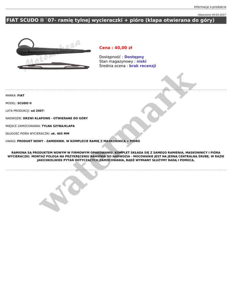 Informacje o produkcie Utworzono 04-03-2017 FIAT SCUDO II `07- ramię tylnej wycieraczki + pióro (klapa otwierana do góry) Cena : 40,00 zł MARKA: FIAT MODEL: SCUDO II LATA PRODUKCJI: od 2007- er m ar k Dostępność : Dostępny Stan magazynowy : niski Średnia ocena : brak recenzji NADWOZIE: DRZWI KLAPOWE - OTWIERANE DO GÓRY MIEJSCE ZAMOCOWANIA: TYLNA SZYBA/KLAPA DŁUGOŚĆ PIÓRA WYCIERACZKI: ok. 405 MM UWAGI: PRODUKT NOWY - ZAMIENNIK. W KOMPLECIE RAMIĘ Z MASKOWNICĄ + PIÓRO w at RAMIONA SĄ PRODUKTEM NOWYM W FIRMOWYM OPAKOWANIU. KOMPLET SKŁADA SIĘ Z SAMEGO RAMIENIA, MASKOWNICY I PIÓRA WYCIERACZKI. MONTAŻ POLEGA NA PRZYKRĘCENIU RAMIENIA DO NADWOZIA - MOCOWANIE JEST NA JEDNĄ CENTRALNĄ ŚRUBĘ. W RAZIE JAKICHKOLWIEK PYTAŃ DOTYCZĄCYCH ZAMOCOWANIA, BĄDŻ WYMIANY SŁUŻYMY RADĄ I POMOCĄ.