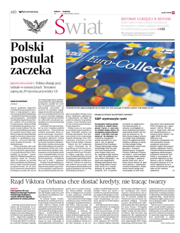 A10 Sobota – niedziela rp.pl/swiat ◊ 14 – 15 stycznia 2012 Świat REFORMY UGRZĘZŁY W BETONIE Raul Castro musi zmienić mentalność towarzyszy i zyskać zaufanie obywateli, by zreformować gospodarkę >A12 >O zmianach zachodzących na Kubie pisze Małgorzata Tryc-Ostrowska Polski postulat zaczeka KRYZYS FINANSOWY | Polska obstaje przy ANNA SŁOJEWSKA zBrukseli Trzecie spotkanie ekspertów w Brukseli nie przyniosło przełomu w negocjacjach w sprawie nowego traktatu fiskalnego. – Nadal wiele kwestii pozostaje nierozwiązanych – powiedział nieoficjalnie dyplomata jednego z państw UE uczestniczący w negocjacjach. Eksperci Rady Europejskiej przygotują czwartą już wersję traktatu. Nie będzie w niej polskiego postulatu, by państwa spoza strefy euro, które podpiszą traktat fiskalny, mogły uczestniczyć jako obserwatorzy w spotkaniach przywódców. – Na szczyt trafi większość drażliwych kwestii – dodał dyplomata. – Nasze postulaty, jako polityczne, będą dyskutowane dalej. Decyzja może zapaść dopiero na posiedzeniu Rady Europejskiej 29 stycznia – powiedział „Rz” Mikołaj Dowgielewicz, sekretarz stanu ds. europejskich. Co prawda 24 stycznia zbiorą się ministrowie finansów, którzy będą omawiali projekt przygotowywany do tej pory przez ekspertów i dyplomatów średniego szczebla, ale oni też nie będą mogli wpisać polskiego postulatu. Bo, jak podkreślają eksperci, projekt nie może stać w sprzeczności z tym, co postanowili przywódcy na szczycie UE 9 grudnia, uzgadniając stworzenie nowego traktatu. We wnioskach końcowych ze szczytu wyraźnie napisano, że właśnie w gronie euro będzie się odbywało zarządzanie gospodarcze w nowej zacieśnionej unii fiskalnej. „Jesteśmy zdecydowani działać na rzecz wspólnej polityki gospodarczej. Wprowadzona zostanie procedura, która zapewni omawianie i koordynowanie na szczeblu strefy euro wszystkich głównych reform polityki gospodarczej planowanych przez państwa członkowskie strefy, z myślą o stworzeniu hierarchii najlepszych praktyk. Zarządzanie strefą euro zostanie wzmocnione zgodnie z ustaleniami ze szczytu państw strefy euro z 26 października. Szczyty państw strefy euro będą się odbywać regularnie – co najmniej dwa razy w roku” – zapisano. Premier Donald Tusk tego zapisu nie kwestionował. Postulat doproszenia państw spoza strefy euro minister Jacek Rostowski przedstawił publicznie do- GIUSEPPE CACACE/AFP udziale w euroszczytach. Tematem zajmą się 29 stycznia przywódcy UE ≥Dziesięć lat temu euro posługiwało się 12 krajów Unii. Dziś używa go 17 państw unijnych. A jak będzie za rok? piero 20 grudnia. Od tego czasu polscy dyplomaci zgłaszali go w negocjacjach, ale nigdy nie został on wpisany do projektu. Uznano, że ma charakter polityczny i wykracza poza kompetencje ekspertów. Polska uważa, że ma szansę na uzyskanie poparcia politycznego. Pośrednio popiera nas Komisja Europejska. José Barroso mówił, że nie zaakceptuje traktatu dzielącego Unię. Zdecydowanie przeciwne są trzy kraje: Francja, Belgia i Estonia. Traktat ma być podpisany 1 marca. Proponuje się, by wszedł w życie 1 stycznia 2013 r., jeśli ratyfikuje go co najmniej 12 państw strefy euro. Poza strefą traktat negocjują wszyscy prócz Wielkiej Brytanii. Decyzję o podpisaniu uzależniają od treści. Podpis miałby wymiar symboliczny. Traktat nie zobowiązuje państw spoza strefy euro do przyjmowania dodatkowych rygorów fiskalnych, ale i nie daje im dodatkowych praw. ∑ > FRANCJA STRACI NAJWYŻSZY RATING? S&P wystraszyła rynki Europejskie indeksy giełdowe traciły w piątek nawet ponad 2 proc., a euro mocno osłabło wobec dolara. Za europejską walutę płacono nawet 1,26 USD, czyli najmniej od 16 miesięcy. Tak inwestorzy zareagowali przede wszystkim na przecieki o tym, że agencja Standard & Poor’s pozbawi Francję najwyższego ratingu kredytowego AAA oraz obetnie oceny kredytowe kilku innym krajom strefy euro. Do zamknięcia tego wydania „Rz” S&P nie wydała jeszcze komunikatu mówiącego o cięciach ocen kredytowych. Według nieoficjalnych informacji ratingi oprócz Francji miały stracić m.in. Austria i Słowacja. W grudniu S&P umieściła 15 z 17 państw eurolandu na negatywnej liście obserwacyjnej, co oznacza, że przegląda ich oceny kredytowe pod kątem ewentualnej obniżki. Nie znalazły się wówczas na tej liście Grecja (mająca śmieciowy rating) i Cypr (znajdujący się już na negatywnej liście). Analitycy wskazują, że obcięcie francuskiego ratingu zdemolowałoby unijną strategię walki z kryzysem zadłużeniowym. Europejski Fundusz Stabilności Finansowej zbiera z rynku pieniądze na ratowanie krajów eurolandu, korzystając z gwarancji państw strefy euro. Jest w dużej mierze zależny od gwarancji państw o najwyższych ocenach kredytowych. Pozbawienie Francji ratingu AAA oznaczałoby, że ilość środ- ków, jakimi może dysponować EFSF, zmniejszy się z planowanych 450 do 293 mld euro, z czego około 250 mld jest zarezerwowanych na wsparcie Grecji, Irlandii i Portugalii. EFSF straciłby faktycznie moc. Inwestorów zaniepokoiło również przerwanie rozmów prywatnych wierzycieli z greckim rządem dotyczących redukcji zadłużenia. Instytut Finansów Międzynarodowych, organizacja reprezentująca prywatnych wierzycieli, podkreśla w komunikacie, że przerwał negocjacje, by dać Atenom „czas na refleksję”. Wszystko wskazuje na to, że strony negocjacji nie są w stanie się porozumieć, jak głęboka ma być redukcja zadłużenia. —hk Rząd Viktora Orbana chce dostać kredyty, nie tracąc twarzy WĘGRY Pod naporem UE oraz Międzynarodowego Funduszu Walutowego Budapeszt wysyła nieśmiałe sygnały gotowości do zmiany polityki – Jesteśmy gotowi do pewnych zmian, ale oczekujemy, że zarówno Międzynarodowy Fundusz Walutowy, jak i Unia Europejska rozpoczną dialog na bazie faktów, a nie opinii politycznych – takiej treści 