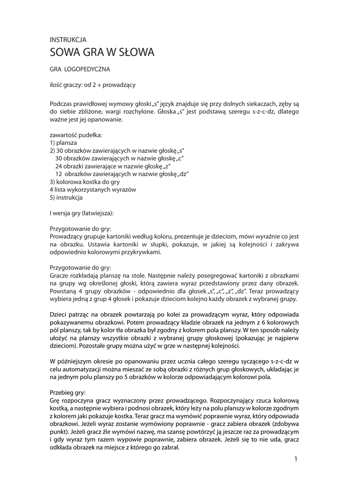 INSTRUKCJA SOWA GRA W SŁOWA GRA LOGOPEDYCZNA ilość graczy: od 2 + prowadzący Podczas prawidłowej wymowy głoski „s” język znajduje się przy dolnych siekaczach, zęby są do siebie zbliżone, wargi rozchylone. Głoska „s” jest podstawą szeregu s-z-c-dz, dlatego ważne jest jej opanowanie. zawartość pudełka: 1) plansza 2) 30 obrazków zawierających w nazwie głoskę „s” 30 obrazków zawierających w nazwie głoskę „c” 24 obrazki zawierające w nazwie głoskę „z” 12 obrazków zawierających w nazwie głoskę „dz” 3) kolorowa kostka do gry 4 lista wykorzystanych wyrazów 5) instrukcja I wersja gry (łatwiejsza): Przygotowanie do gry: Prowadzący grupuje kartoniki według koloru, prezentuje je dzieciom, mówi wyraźnie co jest na obrazku. Ustawia kartoniki w słupki, pokazuje, w jakiej są kolejności i zakrywa odpowiednio kolorowymi przykrywkami. Przygotowanie do gry: Gracze rozkładają planszę na stole. Następnie należy posegregować kartoniki z obrazkami na grupy wg określonej głoski, którą zawiera wyraz przedstawiony przez dany obrazek. Powstaną 4 grupy obrazków - odpowiednio dla głosek „s”, „c”, „z”, „dz”. Teraz prowadzący wybiera jedną z grup 4 głosek i pokazuje dzieciom kolejno każdy obrazek z wybranej grupy. Dzieci patrząc na obrazek powtarzają po kolei za prowadzącym wyraz, który odpowiada pokazywanemu obrazkowi. Potem prowadzący kładzie obrazek na jednym z 6 kolorowych pól planszy, tak by kolor tła obrazka był zgodny z kolorem pola planszy. W ten sposób należy ułożyć na planszy wszystkie obrazki z wybranej grupy głoskowej (pokazując je najpierw dzieciom). Pozostałe grupy można użyć w grze w następnej kolejności. W późniejszym okresie po opanowaniu przez ucznia całego szeregu syczącego s-z-c-dz w celu automatyzacji można mieszać ze sobą obrazki z różnych grup głoskowych, układając je na jednym polu planszy po 5 obrazków w kolorze odpowiadającym kolorowi pola. Przebieg gry: Grę rozpoczyna gracz wyznaczony przez prowadzącego. Rozpoczynający rzuca kolorową kostką, a następnie wybiera i podnosi obrazek, który leży na polu planszy w kolorze zgodnym z kolorem jaki pokazuje kostka. Teraz gracz ma wymówić poprawnie wyraz, który odpowiada obrazkowi. Jeżeli wyraz zostanie wymówiony poprawnie - gracz zabiera obrazek (zdobywa punkt). Jeżeli gracz źle wymówi nazwę, ma szansę powtórzyć ją jeszcze raz za prowadzącym i gdy wyraz tym razem wypowie poprawnie, zabiera obrazek. Jeżeli się to nie uda, gracz odkłada obrazek na miejsce z którego go zabrał. 1