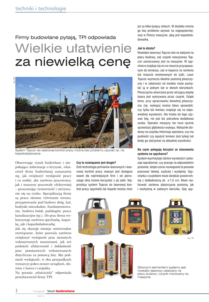 techniki i technologie już za kilka tysięcy złotych. W dodatku można go bez problemu używać na najpopularniej- Firmy budowlane pytają, TPI odpowiada Wielkie ułatwienie za niewielką cenę szej w Polsce maszynie, jaką jest koparkoładowarka. Jak to działa? Niwelator laserowy Topcon stoi na statywie na placu budowy, zaś czujnik maszynowy Topcon zamocowany jest na maszynie. W spycharce znajduje się on na maszcie przyspawanym do lemiesza, zaś w koparce na ramieniu lub maszcie montowanym do łyżki. Laser Fot. TPI Topcon wyznacza idealnie poziomą płaszczyznę i w zależności od modelu może pochylać ją w jednym lub w dwóch kierunkach. Płaszczyzna utworzona przez wirującą wiązkę lasera jest wykrywana przez czujnik. Dzięki temu, przy opracowaniu dowolnej płaszczyzny (np. wykopu) można łatwo sprawdzić, czy łyżka lub lemiesz znajduje się na odpowiedniej wysokości. Nie trzeba do tego używać łaty, nie jest też potrzebna dodatkowa osoba. Operator maszyny nie musi ręcznie sprawdzać głębokości wykopu. Wskaźnik diodowy na czujniku informuje operatora, czy ma podnieść czy opuścić lemiesz (lub łyżkę) lub kiedy go zatrzymać na aktualnej wysokości. System Topcon do laserowej kontroli pracy można bez problemu używać np. na koparkoładowarce Na czym polegają korzyści ze stosowania systemu na spycharce? System wychwytuje różnice wysokości i poka- Obserwując rynek budowlany i niepokojące informacje o kryzysie, właściciel firmy budowlanej zastanawia się, jak zwiększyć wydajność pracy i co zrobić, aby zarówno pracownicy, jak i maszyny pracowały efektywniej – gwarantując rentowność i utrzymanie się na rynku. Specjalizacją firmy są prace ziemne (równanie terenu, przygotowanie pod budowy dróg, hal, budynki mieszkalne, fundamentowanie, budowa boisk, parkingów, prace kanalizacyjne itp.). Do prac firma wykorzystuje zarówno spycharkę, koparkę, jak i koparkoładowarkę. Jak się okazuje istnieje uniwersalne rozwiązanie, które pozwala zarówno zwiększyć wydajność prac ziemnych wykonywanych maszynami, jak też podnieść efektywność i dokładność prac pomiarowych wykonywanych dotychczas za pomocą łaty. Aby podnieść wydajność, w obu przypadkach wystarczy jeden zestaw urządzeń, złożony z lasera i czujnika. Na pytania „właściciela” odpowiada przedstawiciel firmy TPI. listopad 2012 forum budowlane Czy to rozwiązanie jest drogie? zuje operatorowi, czy pracuje na odpowiednim Dziś technologia pomiarów laserowych i lase- poziomie, dzięki czemu rozwiązanie to pozwala rowej kontroli pracy maszyn jest dostępna pracować łatwiej, szybciej i wydajniej. Spy- nawet dla najmniejszych firm i od pierw- charka z czujnikiem może obrabiać powierzch- szego dnia można korzystać z jej zalet. Naj- nię z dokładnością ok. ±1,5 cm. Może rea- prostszy system Topcon do laserowej kon- lizować zarówno płaszczyznę poziomą, jak troli pracy spycharki lub koparki można mieć i nachyloną w zadanym kierunku. Gdy spy- Fot. TPI Głównymi elementami systemu jest niwelator laserowy ustawiany na placu budowy i czujnik mocowany na maszynie techniki i technologie Fot. TPI Czy w razie potrzeby system może być używany do niwelacji ręcznej, za pomocą łaty? Uniwersalne modele czujników mogą służyć także do pomiarów przy wykorzystaniu łaty laserowej, wtedy ten sam system może być używany do niwelacji ręcznej i maszynowej. Nie trzeba zatem mieć dwóch oddzielnych zestawów. Czy rozwiązanie jest trwałe i godne zaufania? Lasery Topcon należą do najbardziej wydajnych rozwiązań tego typu, a ich jakość i niezawodność mogą potwierdzić profesjonalni użytkownicy w Polsce i na świecie. Topcon to japońska firma, która specjalizuje się wyłącznie w produkcji precyzyjnego sprzętu pomiarowego. Żadna inna firma nie daje na swoje Spycharka z czujnikiem może obrabiać dowolnie nachyloną powierzchnię z dokładnością ok. ±1,5 cm profesjonalne lasery tak długiej gwarancji jak Topcon – 5 lat gwarancji na bezawa- charka przygotowuje np. powierzchnię dla ludzi do pomiarów, mniej paliwa, zaś możli- ryjną pracę w najtrudniejszych warunkach równiarki, potrzebuje do tego mniej przejaz- wość wywiązania się z terminu to korzyść może oznaczać tylko, że jest to najsolidniej- dów. Powierzchnię można obrabiać bez cza- bezcenna. szy sprzęt na rynku. ków) i często bez pomocy ekipy geodezyjnej. Jakie korzyści ma operator koparki? Czujnik pozwala operatorowi w każdej chwili Koparka może wykonywać dowolne wykopy sprawdzić, czy pracuje na właściwej wysoko- szybciej – dzięki kontroli głębokości unika się ści, czy już nie. Systemy wskaźnikowe Topcon przekopań. Wystarczy ustawić ramię pionowo idealnie nadają się do wszelkich prac ziem- i sprawdzić sygnał na czujniku, który infor- nych (np. do budowy placów, boisk, parkin- muje o głębokości w danym punkcie. To duże gów, układania rurociągów czy do szybkiego ułatwienie, zwłaszcza przy pracach kanaliza- zgrubnego równania terenu). cyjnych czy kopaniu fundamentów – pozwala Fot. TPI sochłonnych prac (takich jak np. wbijanie pali- zaoszczędzić dużo czasu. Jakie korzyści z tego rozwiązania odnosi firma? Czy montaż urządzenia jest trudny? Pracę wykonuje szybciej i taniej – potrze- Jedynym elementem wymagającym mon- buje na jej wykonanie mniej dniówek, mniej tażu jest czujnik, który musi zostać zamo- Fot. TPI cowany na maszynie. Montaż czujników Topcon nie sprawia kłopotu nawet początkującym użytkownikom. Typowym rozwiązaniem jest mocowanie magnetyczne. Jest proste i pewne, oraz sprawia, że po skończonej pracy czujnik można łatwo zdjąć i schować lub przełożyć na inną maszynę. Czujniki systemów wskaźnikowych Topcon są wodoszczelne i pyłoszczelne, współpra- rze o średnicy do 800 m. Jakość i trwałość urządzeń Topcon została potwierdzona przez wielu profesjonalnych użytkowników w 
