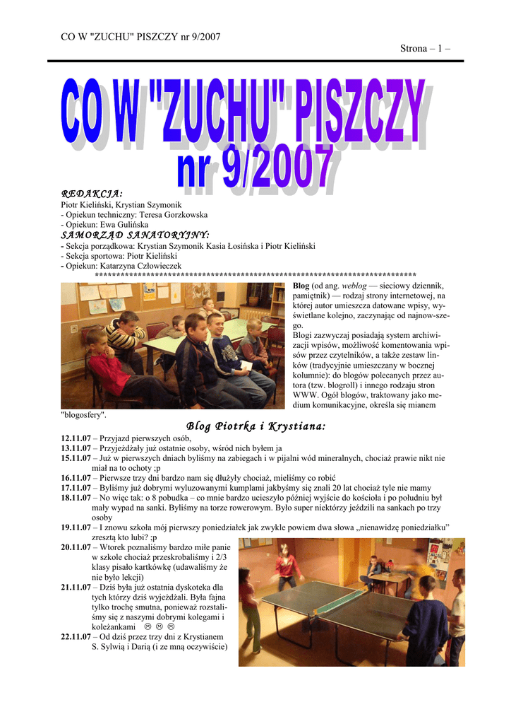 CO W "ZUCHU" PISZCZY nr 9/2007 Strona – 1 – REDAKCJA: Piotr Kieliński, Krystian Szymonik - Opiekun techniczny: Teresa Gorzkowska - Opiekun: Ewa Gulińska SAMORZĄD SANATORYJNY: - Sekcja porządkowa: Krystian Szymonik Kasia Łosińska i Piotr Kieliński - Sekcja sportowa: Piotr Kieliński - Opiekun: Katarzyna Człowieczek *************************************************************************** Blog (od ang. weblog — sieciowy dziennik, pamiętnik) — rodzaj strony internetowej, na której autor umieszcza datowane wpisy, wyświetlane kolejno, zaczynając od najnow-szego. Blogi zazwyczaj posiadają system archiwizacji wpisów, możliwość komentowania wpisów przez czytelników, a także zestaw linków (tradycyjnie umieszczany w bocznej kolumnie): do blogów polecanych przez autora (tzw. blogroll) i innego rodzaju stron WWW. Ogół blogów, traktowany jako medium komunikacyjne, określa się mianem "blogosfery". Blog Piotrka i Krystiana: 12.11.07 – Przyjazd pierwszych osób, 13.11.07 – Przyjeżdżały już ostatnie osoby, wśród nich byłem ja 15.11.07 – Już w pierwszych dniach byliśmy na zabiegach i w pijalni wód mineralnych, chociaż prawie nikt nie miał na to ochoty ;p 16.11.07 – Pierwsze trzy dni bardzo nam się dłużyły chociaż, mieliśmy co robić 17.11.07 – Byliśmy już dobrymi wyluzowanymi kumplami jakbyśmy się znali 20 lat chociaż tyle nie mamy 18.11.07 – No więc tak: o 8 pobudka – co mnie bardzo ucieszyło później wyjście do kościoła i po południu był mały wypad na sanki. Byliśmy na torze rowerowym. Było super niektórzy jeździli na sankach po trzy osoby 19.11.07 – I znowu szkoła mój pierwszy poniedziałek jak zwykle powiem dwa słowa „nienawidzę poniedziałku” zresztą kto lubi? ;p 20.11.07 – Wtorek poznaliśmy bardzo miłe panie w szkole chociaż przeskrobaliśmy i 2/3 klasy pisało kartkówkę (udawaliśmy że nie było lekcji) 21.11.07 – Dziś była już ostatnia dyskoteka dla tych którzy dziś wyjeżdżali. Była fajna tylko trochę smutna, ponieważ rozstaliśmy się z naszymi dobrymi kolegami i koleżankami 22.11.07 – Od dziś przez trzy dni z Krystianem S. Sylwią i Darią (i ze mną oczywiście) CO W "ZUCHU" PISZCZY nr 9/2007 Strona – 2 – nudziliśmy się całymi dniami i wspominaliśmy stare czasy, a kolejnego dnia pojawiły się konflikty z dziewczynami 24.11.07 – Powoli zaczął zjeżdżać się kolejny turnus, nowe dziewczyny, nowi chłopacy, ale wszyscy byli młodsi. Już myślałem, że zostaniemy sami, ale przyjechał jeszcze jeden chłopak do naszego pokoju Mateusz Z. Wcześniej przyjechały jeszcze dwie dziewczyny Kaśka i Angelika. Dziewczynom najbardziej podoba się że mamy tylko cztery lekcje dziennie. Byliśmy na długim spacerze po parku zdrojowym, zobaczyliśmy najstarsze drzewo w Szczawnie Zdroju, amfiteatr, wieżę Anny, pomnik Henryka Wieniawskiego (ur. 10 lipca 1835 w Lublinie, zm. 31 marca 1880 w Moskwie). Najbardziej podobały nam się… wiewiórki 25.11.07 – Poszliśmy do kościoła. Nasza grupa się poszerzyła. Nowi też nie mieli problemów z zapoznaniem się. Zostaliśmy zaproszeni do Domu Zdrojowego na spotkanie z aktorami Jarosławem Boberkiem i Tomaszem Karolakiem. Aktorzy są znani z serialu „Kryminalni” i „Rodzina Zastępcza”. Było bardzo fajnie, rozmawialiśmy o pracy aktorów i poznaliśmy ich opinię o aktorstwie. 26.11.07 – Było super, za to że wytrwaliśmy tyle dni mogliśmy sprawdzać czystość w pokojach, albo oprowadzać grupę po mieście oczywiście pod opieką pani. 28.11.07 – Zrobiło nam się już coraz ciężej i smutniej ponieważ niektórzy musieli wyjechać już wcześniej np. Ja… NI EDŁUGO M IKOŁA J . REDA KCJ A W I N TERN ECI E ZN A L A ZŁA NA STĘPUJ Ą CĄ I N FORMA CJ Ę: Ale my i tak wierzymy, że otrzymamy prezenty. I tego życzy REDAKCJA!