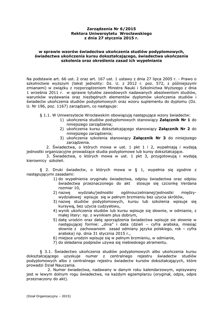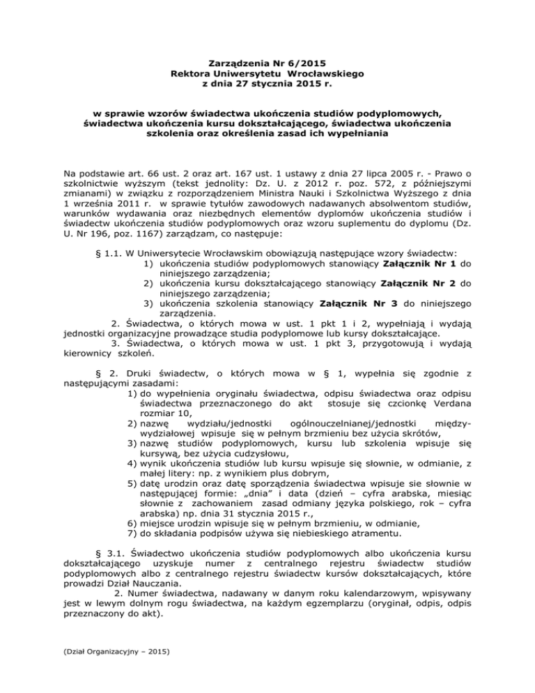 Zarządzenia Nr 6/2015 Rektora Uniwersytetu Wrocławskiego z dnia 27 stycznia 2015 r. w sprawie wzorów świadectwa ukończenia studiów podyplomowych, świadectwa ukończenia kursu dokształcającego, świadectwa ukończenia szkolenia oraz określenia zasad ich wypełniania Na podstawie art. 66 ust. 2 oraz art. 167 ust. 1 ustawy z dnia 27 lipca 2005 r. - Prawo o szkolnictwie wyższym (tekst jednolity: Dz. U. z 2012 r. poz. 572, z późniejszymi zmianami) w związku z rozporządzeniem Ministra Nauki i Szkolnictwa Wyższego z dnia 1 września 2011 r. w sprawie tytułów zawodowych nadawanych absolwentom studiów, warunków wydawania oraz niezbędnych elementów dyplomów ukończenia studiów i świadectw ukończenia studiów podyplomowych oraz wzoru suplementu do dyplomu (Dz. U. Nr 196, poz. 1167) zarządzam, co następuje: § 1.1. W Uniwersytecie Wrocławskim obowiązują następujące wzory świadectw: 1) ukończenia studiów podyplomowych stanowiący Załącznik Nr 1 do niniejszego zarządzenia; 2) ukończenia kursu dokształcającego stanowiący Załącznik Nr 2 do niniejszego zarządzenia; 3) ukończenia szkolenia stanowiący Załącznik Nr 3 do niniejszego zarządzenia. 2. Świadectwa, o których mowa w ust. 1 pkt 1 i 2, wypełniają i wydają jednostki organizacyjne prowadzące studia podyplomowe lub kursy dokształcające. 3. Świadectwa, o których mowa w ust. 1 pkt 3, przygotowują i wydają kierownicy szkoleń. § 2. Druki świadectw, o których mowa w § 1, wypełnia się zgodnie z następującymi zasadami: 1) do wypełnienia oryginału świadectwa, odpisu świadectwa oraz odpisu świadectwa przeznaczonego do akt stosuje się czcionkę Verdana rozmiar 10, 2) nazwę wydziału/jednostki ogólnouczelnianej/jednostki międzywydziałowej wpisuje się w pełnym brzmieniu bez użycia skrótów, 3) nazwę studiów podyplomowych, kursu lub szkolenia wpisuje się kursywą, bez użycia cudzysłowu, 4) wynik ukończenia studiów lub kursu wpisuje się słownie, w odmianie, z małej litery: np. z wynikiem plus dobrym, 5) datę urodzin oraz datę sporządzenia świadectwa wpisuje sie słownie w następującej formie: „dnia” i data (dzień – cyfra arabska, miesiąc słownie z zachowaniem zasad odmiany języka polskiego, rok – cyfra arabska) np. dnia 31 stycznia 2015 r., 6) miejsce urodzin wpisuje się w pełnym brzmieniu, w odmianie, 7) do składania podpisów używa się niebieskiego atramentu. § 3.1. Świadectwo ukończenia studiów podyplomowych albo ukończenia kursu dokształcającego uzyskuje numer z centralnego rejestru świadectw studiów podyplomowych albo z centralnego rejestru świadectw kursów dokształcających, które prowadzi Dział Nauczania. 2. Numer świadectwa, nadawany w danym roku kalendarzowym, wpisywany jest w lewym dolnym rogu świadectwa, na każdym egzemplarzu (oryginał, odpis, odpis przeznaczony do akt). (Dział Organizacyjny – 2015) 3. Numer świadectwa składa się z liczby porządkowej z centralnego rejestru łamanej przez rok kalendarzowy wpisany w pełnym brzmieniu (np.: 1/2015). § 4. 1. Świadectwo ukończenia szkolenia uzyskuje numer z rejestru wydanych świadectw ukończenia danego szkolenia prowadzonego przez kierownika szkolenia. 2. Numer świadectwa składa się z liczby porządkowej z rejestru łamanej przez rok kalendarzowy wpisany w pełnym brzmieniu (np.:1/2015). W przypadku przeprowadzenia kilku edycji tego samego szkolenia w jednym roku kalendarzowym do numeru dodaje się wielką literę alfabetu łacińskiego, która odpowiada kolejnym edycjom szkolenia (np.: 1A/2015, 2B/2015). 3. Numer świadectwa, nadawany w danym roku kalendarzowym, wpisywany jest w lewym dolnym rogu świadectwa, na każdym egzemplarzu (oryginał, odpis przeznaczony do akt). § 5. Na świadectwie przystawia się pieczęć urzędową do tuszu o średnicy 20 mm. § 6.1. Osobie, która ukończyła studia podyplomowe, wydaje się oryginał świadectwa oraz jeden odpis. 2. Osobie, która ukończyła kurs dokształcający lub szkolenie, wydaje się oryginał świadectwa. 3. Odpis przeznaczony do akt pozostaje w dokumentacji przebiegu studiów podyplomowych, kursu lub szkolenia. § 7.1. Ewidencję wydanych świadectw ukończenia studiów podyplomowych lub kursu dokształcającego prowadzi jednostka organizacyjna prowadząca studia lub kurs. 2. Ewidencję wydanych świadectw ukończenia szkolenia prowadzi kierownik szkolenia. § 8. Nadzór nad wykonaniem niniejszego zarządzenia powierza się Prorektorowi ds. Nauczania. § 9. Traci moc zarządzenie Nr 41/2012 Rektora Uniwersytetu Wrocławskiego z dnia 9 maja 2012 r. w sprawie wprowadzenia wzorów świadectw ukończenia studiów podyplomowych i świadectwa ukończenia kursu dokształcającego oraz określenia zasad ich wypełniania. § 10. Zarządzenie wchodzi w życie z dniem podpisania. prof. dr hab. Marek Bojarski REKTOR (Dział Organizacyjny – 2015) Załącznik Nr 1 do zarządzenia Nr 6/2015 z dnia 27 stycznia 2015 r. (Dział Organizacyjny – 2015) (Dział Organizacyjny – 2015) WZÓR ŚWIADECTWA UKOŃCZENIA STUDIÓW PODYPLOMOWYCH Opis: 1. 2. 3. 4. 5. 6. 7. 8. Format świadectwa A4 ( 210 mm x 297 mm ); Papier FABRIANO PALLATINO 190 gr. 70x100; Druk dwustronny w kolorze czarnym; Godło Uczelni – wysokość 42 mm; napis „Uniwersytet Wrocławski” – czcionka Bodoni 23 pkt; „Wydane w Rzeczypospolitej Polskiej” – czcionka Bodoni 14 pkt; „ŚWIADECTWO” – wersaliki, czcionka Bodoni 28 pkt; napis „UKOŃCZENIA STUDIÓW PODYPLOMOWYCH” – wersaliki, czcionka Bodoni 20 pkt; 9. napisy: a/ „Pan(i)”, b/ „urodzon…..”, c/ „ukończył…..”, d/ „z wynikiem…”, e/ „DZIEKAN/DYREKTOR”, „REKTOR” wersaliki, f/ „Wrocław, dnia……….r.” g/ „ Nr…/…. r.”, czcionka Bodoni 12 pkt; 10. objaśnienia (tekst w nawiasach) – czcionka Bodoni 7 pkt; 11. Godło Uczelni w odległości 19,5 mm od górnej krawędzi świadectwa; 12. Godło Uczelni, napisy oraz tekst powinny być umieszczon