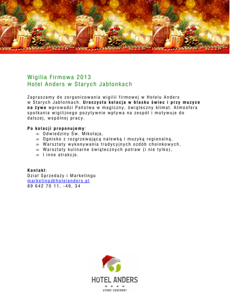 Wigilia Firmowa 2013 Hotel Anders w Starych Jabłonkach Zapraszamy do zorganizowania wigilii firmowej w Hotelu Anders w Starych Jabłonkach. Uroczysta kolacja w blasku świec i przy muzyce na żywo wprowadzi Państwa w magiczny, świąteczny klimat. Atmosfera spotkania wigilijnego pozytywnie wpływa na zespół i motywuje do dalszej, wspólnej pracy. Po kolacji proponujemy: • Odwiedziny Św. Mikołaja, • Ognisko z rozgrzewającą nalewką i muzyką regionalną, • Warsztaty wykonywania tradycyjnych ozdób choinkowych, • Warsztaty kulinarne świątecznych potraw (i nie tylko), • I inne atrakcje. Kontakt: Dział Sprzedaży i Marketingu [email protected] 89 642 70 11, -49, 34 Menu Kolacji Wigilijnej: Do każdego menu proponujemy opłatek, w miarę życzenia Gości. Menu I Cena: 90 zł Menu II Cena: 90 zł Pstrąg wędzony domowym sposobem na zimno z sałatką z marynowanej dyni i musem jabłkowym Pieczywo regionalne, masło pietruszkowe Sałatka z wędzonym pstrągiem, marynowymi patisonami i emulsją pietruszkową Pieczywo, masło smakowe Zupa z borowików z orzechami i kozim serem Pierożki z kapustą i grzybami pieczone podane na emulsji maślanej Barszcz czerwony z uszkami z duszonych kurek z kaszą jęczmienną Antonówka z sous vide Kaczka pieczona w sianie z sosem z pigwy i cynamonu na czerwonej kapuście duszonej w soku z brzozy Sorbet z pieczonego jabłka Sandacz na kapuście duszonej ze śliwkami z sosem podpiwkowym Strudel makowy z sosem waniliowym Placek śliwkowy na zimnym brulle z lodami gryczanymi Menu III Cena: 90 zł Menu IV Cena: 90 zł Sałatka z marynowanym łososiem i ogórkiem z sosem jogurtowo miodowym Pieczywo, masło Śledź na sałatce ziemniaczanej Pieczywo, masło Barszcz wigilijny z pierożkiem grzybowym Zupa grzybowa z borowików na zakwasie z kiszonej kapusty Karp smażony confi z konfiturą z czerwonej cebuli i malin, podany z kluseczkami szpinakowymi z puree z marchwi i jabłek z sosem szalotkowym Jabłecznik z szarej renety z domowymi lodami z sosem wiśniowym Okoń jeziorny smażony podany na ciepłej sałatce z selera i kiszonej kapusty Makowiec z sosem waniliowym Menu V Cena: 130 zł Mus z wędzonego pstrąga z duszonymi kurkami, sałatka ze świeżego ogórka Pieczywo koktajlowe, masło smakowe Bufet zimny: Półmisek ryb wędzonych (sieja, pstrąg, sielawa, łosoś) Półmisek wędzonek tradycyjnych z Warmińskiej Wędzarni (karczek wędzony, schab wędzony, boczek wędzony, kaszanka) Półmisek serów zagrodowych (Praślicki, Z Wiżajn, Koryciński, z Kieźlin) Sałatki Półmisek mięs pieczystych Śledzie na kilka sposobów Warzywa z domowej spiżarni Bufet ciepły: Karp w szarym sosie Polskie warzywa w emulsji Pieczone ziemniaki Pstrąg z warzywami z sosem cebulowym Pierś z kurczaka sosem Barszcz wigilijny z pasztecikiem grzybowym Bufet pierogowy: Pierogi z kapustą i grzybami Pierogi ze szpinakiem i twarogiem Pierogi ze szczupakiem Pierogi z ziemniakami i serem twarogowym Pierogi z kaszą i twarogiem Pierogi z grzybami i kaszą Bufet słodki: Owoce Kompot z suszonych owoców Wybór ciast i deserów