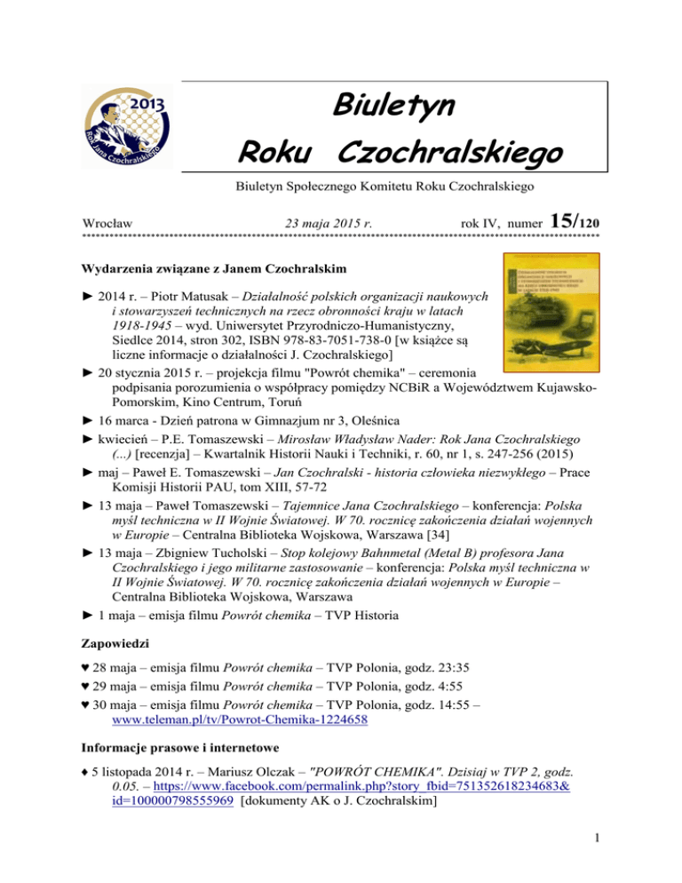 Biuletyn Roku Czochralskiego Biuletyn Społecznego Komitetu Roku Czochralskiego Wrocław 23 maja 2015 r. rok IV, numer 15/120 ***************************************************************************************************************** Wydarzenia związane z Janem Czochralskim ► 2014 r. – Piotr Matusak – Działalność polskich organizacji naukowych i stowarzyszeń technicznych na rzecz obronności kraju w latach 1918-1945 – wyd. Uniwersytet Przyrodniczo-Humanistyczny, Siedlce 2014, stron 302, ISBN 978-83-7051-738-0 [w książce są liczne informacje o działalności J. Czochralskiego] ► 20 stycznia 2015 r. – projekcja filmu "Powrót chemika" – ceremonia podpisania porozumienia o współpracy pomiędzy NCBiR a Województwem KujawskoPomorskim, Kino Centrum, Toruń ► 16 marca - Dzień patrona w Gimnazjum nr 3, Oleśnica ► kwiecień – P.E. Tomaszewski – Mirosław Władysław Nader: Rok Jana Czochralskiego (...) [recenzja] – Kwartalnik Historii Nauki i Techniki, r. 60, nr 1, s. 247-256 (2015) ► maj – Paweł E. Tomaszewski – Jan Czochralski - historia człowieka niezwykłego – Prace Komisji Historii PAU, tom XIII, 57-72 ► 13 maja – Paweł Tomaszewski – Tajemnice Jana Czochralskiego – konferencja: Polska myśl techniczna w II Wojnie Światowej. W 70. rocznicę zakończenia działań wojennych w Europie – Centralna Biblioteka Wojskowa, Warszawa [34] ► 13 maja – Zbigniew Tucholski – Stop kolejowy Bahnmetal (Metal B) profesora Jana Czochralskiego i jego militarne zastosowanie – konferencja: Polska myśl techniczna w II Wojnie Światowej. W 70. rocznicę zakończenia działań wojennych w Europie – Centralna Biblioteka Wojskowa, Warszawa ► 1 maja – emisja filmu Powrót chemika – TVP Historia Zapowiedzi ♥ 28 maja – emisja filmu Powrót chemika – TVP Polonia, godz. 23:35 ♥ 29 maja – emisja filmu Powrót chemika – TVP Polonia, godz. 4:55 ♥ 30 maja – emisja filmu Powrót chemika – TVP Polonia, godz. 14:55 – www.teleman.pl/tv/Powrot-Chemika-1224658 Informacje prasowe i internetowe ♦ 5 listopada 2014 r. – Mariusz Olczak – "POWRÓT CHEMIKA". Dzisiaj w TVP 2, godz. 0.05. – https://www.facebook.com/permalink.php?story_fbid=751352618234683& id=100000798555969 [dokumenty AK o J. Czochralskim] 1 ♦ Powrót chemika – www.filmpolski.pl/fp/index.php?film=1236260 [opis filmu i lista twórców] ♦ 13 stycznia 2015 r. – Zaproszenie na ceremonię podpisania porozumienia o współpracy pomiędzy NCBR a Województwem Kujawsko-Pomorskim – www.chem.umk.pl/ ♦ 30 kwietnia [?] 2015 r. – Warto wiedzieć o Janie Czochralskim – www.atut.ig.pl/?aktualnosci,51 [o filmie i o książkach] ♦ 30 kwietnia – Jan Czochralski bliżej – www.naukaonline.pl/news/item/1628-na-biezacowzor [o filmie] ******* Jan Czochralski w podręcznikach szkolnych Rok Jana Czochralskiego przeszedł już do historii. Nie oznacza to, że Czochralski powinien również "zniknąć". Poszukajmy go w podręcznikach do fizyki lub chemii - czy znalazło się tam dla niego trwałe miejsce? Czy młodzież dowie się czegoś o tym wielkim polskim uczonym? W czerwcu 2012 r. ukazał się podręcznik Grzegorza Karwasza i Magdaleny Więcek pt. Fizyka współczesna wydany przez Zakład Dydaktyki Fizyki Instytutu Fizyki Uniwersytetu Mikołaja Kopernika w Toruniu. Jest to tzw. "Toruński podręcznik do fizyki", w którego części IV. Fizyka współczesna i Astrofizyka jest rozdział o Janie Czochralskim jako ojcu epoki krzemowej (strony 124-125). Dziękujemy! Tekst podręcznika jest dostępny w internecie pod adresem: www.researchgate.net/publication/259558333_Fizyka_wspczesna_%28Modern_Physics%29 Apelujemy więc do nauczycieli fizyki - w którym z używanych przez Państwa podręczniku jest coś o Janie Czochralskim? *********** Sidolówka przestaje straszyć Przez dziesięć lat w angielskiej wersji Wikipedii można było znaleźć informacje o tym, że prof. Jan Czochralski był (współ)autorem ręcznego granatu zaczepnego wz. R-4 zwanego potocznie "sidolówką" (polska wersja podaje nazwisko Władysława Pankowskiego jako twórcę granatu). W podziemnych zbrojowniach AK wyprodukowano podobno około 350 tysięcy tych granatów. Niestety, autor notatki, red. Krzysztof Machocki (ps. Halibutt), rzecznik prasowy Stowarzyszenia Wikimedia Polska, nie był w stanie przypomnieć sobie źródła tej zaskakującej wiadomości. Przypuszcza, że nie było zbyt poważne i dlatego informacja ta została usunięta z Wikipedii. Dziękujemy! Szkoda tylko, że będzie nadal funkcjonować w obiegu, bo można ją znaleźć i w innych rejonach Internetu i w różnych językach. Co raz trafiło do Internetu, to pozostanie tam na zawsze! *********** Paweł Tomaszewski INTiBS PAN 2