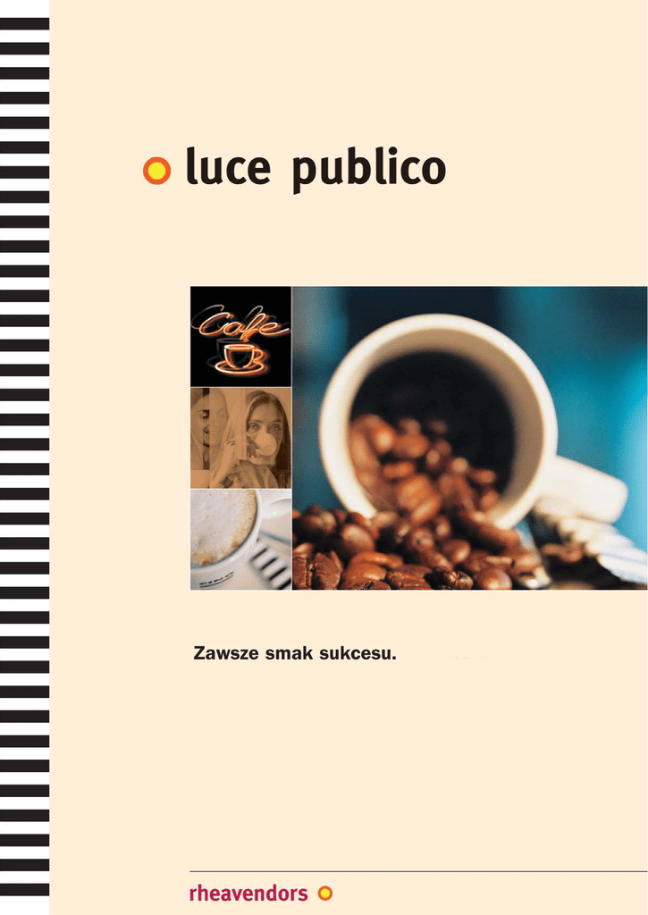 Zawsze smak sukcesu. Ewolucja konceptu Luce Bogate menu System p∏atnoÊci LUCE PUBLICO, wolno stojàcy automat. Elegancki, wzmocniony i oÊwietlony. Stworzony, aby oferowaç kompletne us∏ugi nawet tam, gdzie istniejà obawy o bezpieczeƒstwo automatu. Bogaty wybór goràcych napojów odpowiadajàcy wszystkim gustom. WyÊmienite, goràce, smaczne i kremowe napoje. Wysokiej jakoÊci espresso, czekolady, puszyste cappuccino. Wszystko w „bezpiecznym opakowaniu”. Dost´pne systemy p∏atnoÊci zgodne z protoko∏em seryjnym, Executive i MDB oraz Master/Slave. Monety, ˝etony Wzornictwo i si∏a Wzornictwo i kolory LUCE PUBLICO, pomys∏ oparty na wzornictwie i sile. Automat jest pokryty warstwà stali nierdzewnej, aby zapobiec uszkodzeniom w wyniku wandalizmu. Bezpieczna oaza na dworcach, parkingach, stacjach benzynowych i niestrze˝onych obszarach. Udoskonalona estetyka, typowa dla stylu Rheavendors i szczególna uwaga poÊwi´cona wszystkim dodatkowym Êrodkom bezpieczeƒstwa, aby zapobiec uszkodzeniom maszyny oraz kradzie˝y pieni´dzy. Zaprojektowany przez znanego architekta Angelo Micheli ze Studia De Lucchi. Dost´pny w kolorze czarnym dla wersji rozpuszczalnej i espresso. Karty, systemy kluczy Du˝a ró˝norodnoÊç oprogramowania. Innowacyjnie oprogramowanie elektroniczne, które gwarantuje du˝à ró˝norodnoÊç i szerokà dowolnoÊç w wyborze ka˝dego pojedynczego programu. Technologia przyjazna u˝ytkownikowi LUCE PUBLICO jest programowany poprzez klawiatur´ lub system Flash. Wszystkie cz´Êci mogà byç ∏atwo i szybko od∏àczone bez u˝ycia narz´dzi. Wyposa˝ony w zintegrowany system automatycznego czyszczenia. Napoje serwowane perfekcyjnie Wydawanie napojów odbywa si´ zgodnie z wyborem do kubków plastykowych lub porcelanowych oraz fili˝anek. Speed-Mix Presso-Bean Wybór 12 12 Menu Programowane za pomocà “Rheaction” Ma∏a kawa + cukier Ma∏a kawa rozpuszczalna + cukier Ma∏a bia∏a kawa rozpuszczalna + cukier Ma∏a bia∏a kawa + cukier Du˝a kawa + cukier Du˝a bia∏a kawa + cukier Du˝a bia∏a kawa rozpuszczalna + cukier Ma∏a kawa bezkofeinowa + cukier Du˝a kawa bezkofeinowa + cukier Ma∏a bia∏a kawa bezkofeinowa + cukier Moccacino Bezkofeinowe Moccacino + cukier Herbata Czekolada Mocna czekolada Mleko Kasa zbo˝owa + cukier ● ● ● ● ● ● ● ● ● ● ● ● ● ● ● ● ● ● ● ● ● ● ● ● PojemnoÊç (kg): Kawa rozpuszczalna 1,20 1,20 Kasa ziarnista 3,40 Cukier 4,50 4,50 Mleko 1,35 1,35 Czekolada 3,50 3,50 Herbata rozpuszczalna 4,40 4,40 *pojemnoÊci w odniesieniu do standardowych konfiguracji Czas wydawania Dane techniczne Wymiary (mm) WysokoÊç 1835 SzerokoÊç 625 G∏´bokoÊç 685 Waga (kg) Fili˝anki Pojemniki Moc (Watt) Napi´cie (V) ¸àcze wodne CiÊnienie Diagnostyka 20/25 sec. 20/25 sec. 162 194 600 600 7 6+1 1500/2800 1500/2800 230 230 3/8” gniazdo ˝eƒskie od 1 do 8 barów 6 na wyÊwietlaczu LCD 16x2 wyÊwietlacz 16x2