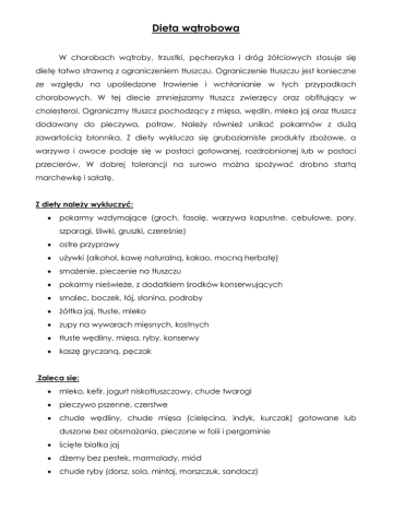 Dieta wątrobowa W chorobach wątroby, trzustki, pęcherzyka i dróg żółciowych stosuje się dietę łatwo strawną z ograniczeniem tłuszczu. Ograniczenie tłuszczu jest konieczne ze względu na upośledzone trawienie i wchłanianie w tych przypadkach chorobowych. W tej diecie zmniejszamy tłuszcz zwierzęcy oraz obfitujący w cholesterol. Ograniczmy tłuszcz pochodzący z mięsa, wędlin, mleka jaj oraz tłuszcz dodawany do pieczywa, potraw. Należy również unikać pokarmów z dużą zawartością błonnika. Z diety wyklucza się gruboziarniste produkty zbożowe, a warzywa i owoce podaje się w postaci gotowanej, rozdrobnionej lub w postaci przecierów. W dobrej tolerancji na surowo można spożywać drobno startą marchewkę i sałatę. Z diety należy wykluczyć: pokarmy wzdymające (groch, fasolę, warzywa kapustne, cebulowe, pory, szparagi, śliwki, gruszki, czereśnie) ostre przyprawy używki (alkohol, kawę naturalną, kakao, mocną herbatę) smażenie, pieczenie na tłuszczu pokarmy nieświeże, z dodatkiem środków konserwujących smalec, boczek, łój, słonina, podroby żółtka jaj, tłuste, mleko zupy na wywarach mięsnych, kostnych tłuste wędliny, mięsa, ryby, konserwy kaszę gryczaną, pęczak Zaleca się: mleko, kefir, jogurt niskotłuszczowy, chude twarogi pieczywo pszenne, czerstwe chude wędliny, chude mięsa (cielęcina, indyk, kurczak) gotowane lub duszone bez obsmażania, pieczone w folii i pergaminie ścięte białka jaj dżemy bez pestek, marmolady, miód chude ryby (dorsz, sola, mintaj, morszczuk, sandacz) oleje: słonecznikowy, sojowy, rzepakowy, bezerukowy, masło, miękkie margaryny, oliwa z oliwek dodawana na surowo warzywa gotowane(marchew, seler, pietruszka, pomidory bez skórki, kabaczki) kisiele, galaretki owoce jagodowe, truskawki, winogrona bez pestek, owoce cytrusowe, banany, brzoskwinie, morele gotowane, jabłka pieczone, gotowane makarony niskojajeczne, ryz, kasza manna, kasza jęczmienna przyprawy: sól, sok z cytryny, zielona pietruszka, koper, rzeżucha, melisa, cynamon, majeranek, wanilia