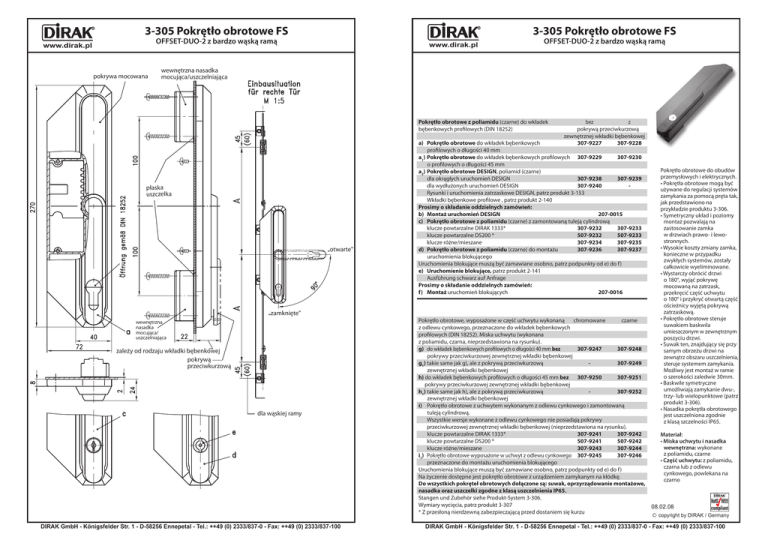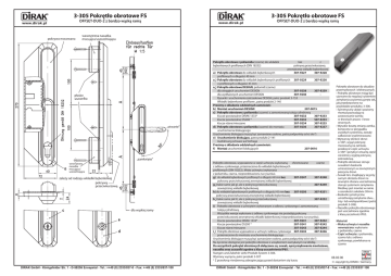 3-305 Pokrętło obrotowe FS 3-305 Pokrętło obrotowe FS OFFSET-DUO-2 z bardzo wąską ramą www.dirak.pl pokrywa mocowana www.dirak.pl OFFSET-DUO-2 z bardzo wąską ramą wewnętrzna nasadka mocująca/uszczelniająca Pokrętło obrotowe z poliamidu (czarne) do wkładek bębenkowych profilowych (DIN 18252) płaska uszczelka "otwarte" wewnętrzna nasadka mocująca/ uszczelniająca "zamknięte" zależy od rodzaju wkładki bębenkowej pokrywą przeciwkurzową dla wąskiej ramy DIRAK GmbH - Königsfelder Str. 1 - D-58256 Ennepetal - Tel.: ++49 (0) 2333/837-0 - Fax: ++49 (0) 2333/837-100 bez z pokrywą przeciwkurzową zewnętrznej wkładki bębenkowej 307-9227 307-9228 a) Pokrętło obrotowe do wkładek bębenkowych profilowych o długości 40 mm a1) Pokrętło obrotowe do wkładek bębenkowych profilowych 307-9229 307-9230 o profilowych o długości 45 mm a2) Pokrętło obrotowe DESIGN, poliamid (czarne) dla okrągłych uruchomień DESIGN 307-9238 307-9239 dla wydłużonych uruchomień DESIGN 307-9240 Rysunki i uruchomienia zatrzaskowe DESIGN, patrz produkt 3-153 Wkładki bębenkowe profilowe , patrz produkt 2-140 Prosimy o składanie oddzielnych zamówień: b) Montaż uruchomień DESIGN 207-0015 c) Pokrętło obrotowe z poliamidu (czarne) z zamontowaną tuleją cylindrową klucze powtarzalne DIRAK 1333* 307-9232 307-9233 klucze powtarzalne DS200 * 507-9232 507-9233 klucze różne/mieszane 307-9234 307-9235 d) Pokrętło obrotowe z poliamidu (czarne) do montażu 307-9236 307-9237 uruchomienia blokującego Uruchomienia blokujące muszą być zamawiane osobno, patrz podpunkty od e) do f ) e) Uruchomienie blokujące, patrz produkt 2-141 Ausführung schwarz auf Anfrage Prosimy o składanie oddzielnych zamówień: f) Montaż uruchomień blokujących 207-0016 Pokrętło obrotowe, wyposażone w część uchwytu wykonaną chromowane czarne z odlewu cynkowego, przeznaczone do wkładek bębenkowych profilowych (DIN 18252). Miska uchwytu (wykonana z poliamidu, czarna, nieprzedstawiona na rysunku). g) do wkładek bębenkowych profilowych o długości 40 mm bez 307-9247 307-9248 pokrywy przeciwkurzowej zewnętrznej wkładki bębenkowej g1) takie same jak g), ale z pokrywą przeciwkurzową 307-9249 zewnętrznej wkładki bębenkowej h) do wkładek bębenkowych profilowych o długości 45 mm bez 307-9250 307-9251 pokrywy przeciwkurzowej zewnętrznej wkładki bębenkowej h1) takie same jak h), ale z pokrywą przeciwkurzową 307-9252 zewnętrznej wkładki bębenkowej i) Pokrętło obrotowe z uchwytem wykonanym z odlewu cynkowego i zamontowaną tuleją cylindrową. Wszystkie wersje wykonane z odlewu cynkowego nie posiadają pokrywy przeciwkurzowej zewnętrznej wkładki bębenkowej (nieprzedstawiona na rysunku). klucze powtarzalne DIRAK 1333* 307-9241 307-9242 klucze powtarzalne DS200 * 507-9241 507-9242 klucze różne/mieszane 307-9243 307-9244 i1) Pokrętło obrotowe wyposażone w uchwyt z odlewu cynkowego 307-9245 307-9246 przeznaczone do montażu uruchomienia blokującego Uruchomienia blokujące muszą być zamawiane osobno, patrz podpunkty od e) do f ) Na życzenie dostępne jest pokrętło obrotowe z urządzeniem zamykanym na kłódkę. Do wszystkich pokręteł obrotowych dołączone są: suwak, oprzyrządowanie montażowe, nasadka oraz uszczelki zgodne z klasą uszczelnienia IP65. Stangen und Zubehör siehe Produkt-System 3-306. Wymiary wycięcia, patrz produkt 3-307 * Z przesłoną nierdzewną zabezpieczającą przed dostaniem się kurzu Pokrętło obrotowe do obudów przemysłowych i elektrycznych. • Pokrętła obrotowe mogą być używane do regulacji systemów zamykania za pomocą pręta tak, jak przedstawiono na przykładzie produktu 3-306. • Symetryczny układ i poziomy montaż pozwalają na zastosowanie zamka w drzwiach prawo- i lewostronnych. • Wysokie koszty zmiany zamka, konieczne w przypadku zwykłych systemów, zostały całkowicie wyeliminowane. • Wystarczy obrócić drzwi o 180°, wyjąć pokrywę mocowaną na zatrzask, przekręcić część uchwytu o 180° i przykryć otwartą część ościeżnicy wyjętą pokrywą zatrzaskową. • Pokrętło obrotowe steruje suwakiem baskwila umieszczonym w zewnętrznym poszyciu drzwi. • Suwak ten, znajdujący się przy samym obrzeżu drzwi na zewnątrz obszaru uszczelnienia, steruje systemem zamykania. Możliwy jest montaż w ramie o szerokości zaledwie 30mm. • Baskwile symetryczne umożliwiają zamykanie dwu-, trzy- lub wielopunktowe (patrz produkt 3-306). • Nasadka pokrętła obrotowego jest uszczelniona zgodnie z klasą szczelności IP65. Materiał: • Miska uchwytu i nasadka wewnętrzna: wykonane z poliamidu, czarne • Część uchwytu: z poliamidu, czarna lub z odlewu cynkowego, powlekana na czarno 08.02.08 © copyright by DIRAK / Germany DIRAK GmbH - Königsfelder Str. 1 - D-58256 Ennepetal - Tel.: ++49 (0) 2333/837-0 - Fax: ++49 (0) 2333/837-100