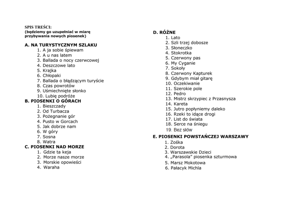 SPIS TREŚCI: (będziemy go uzupełniać w miarę przybywania nowych piosenek) A. NA TURYSTYCZNYM SZLAKU 1. A ja sobie śpiewam 2. A u nas latem 3. Ballada o nocy czerwcowej 4. Deszczowe lato 5. Krajka 6. Chłopaki 7. Ballada o błądzącym turyście 8. Czas powrotów 9. Uśmiechnięte słonko 10. Lubię podróże B. PIOSENKI O GÓRACH 1. Bieszczady 2. Od Turbacza 3. Pożegnanie gór 4. Pusto w Gorcach 5. Jak dobrze nam 6. W góry 7. Sosna 8. Watra C. PIOSENKI NAD MORZE 1. Gdzie ta keja 2. Morze nasze morze 3. Morskie opowieści 4. Waraha D. RÓŻNE 1. Lato 2. Szli trzej dobosze 3. Słoneczko 4. Stokrotka 5. Czerwony pas 6. My Cyganie 7. Sokoły 8. Czerwony Kapturek 9. Gdybym miał gitarę 10. Oczekiwanie 11. Szerokie pole 12. Pedro 13. Mistrz skrzypiec z Przasnysza 14. Kareta 15. Jutro popłyniemy daleko 16. Rzeki to idące drogi 17. List do świata 18. Serce na śniegu E. PIOSENKI POWSTAŃCZEJ WARSZAWY 1. Zośka 2. Dorota 3. Warszawskie Dzieci 4. „Parasola” piosenka szturmowa 5. Marsz Mokotowa 6. Pałacyk Michla F. WAŻNE – ŚPIEWANE OD ŚWIĘTA 1. Iskiereczka 2. Na niebie jasny księżyc 3. Słoneczko już 4. Ogień 5. Na jeden szlak 6. Ogniska już dogasa blask G. NASZA KOLONIJNA TWÓRCZOŚĆ 1. Ochotnica 2008 2. Zawoja 2011