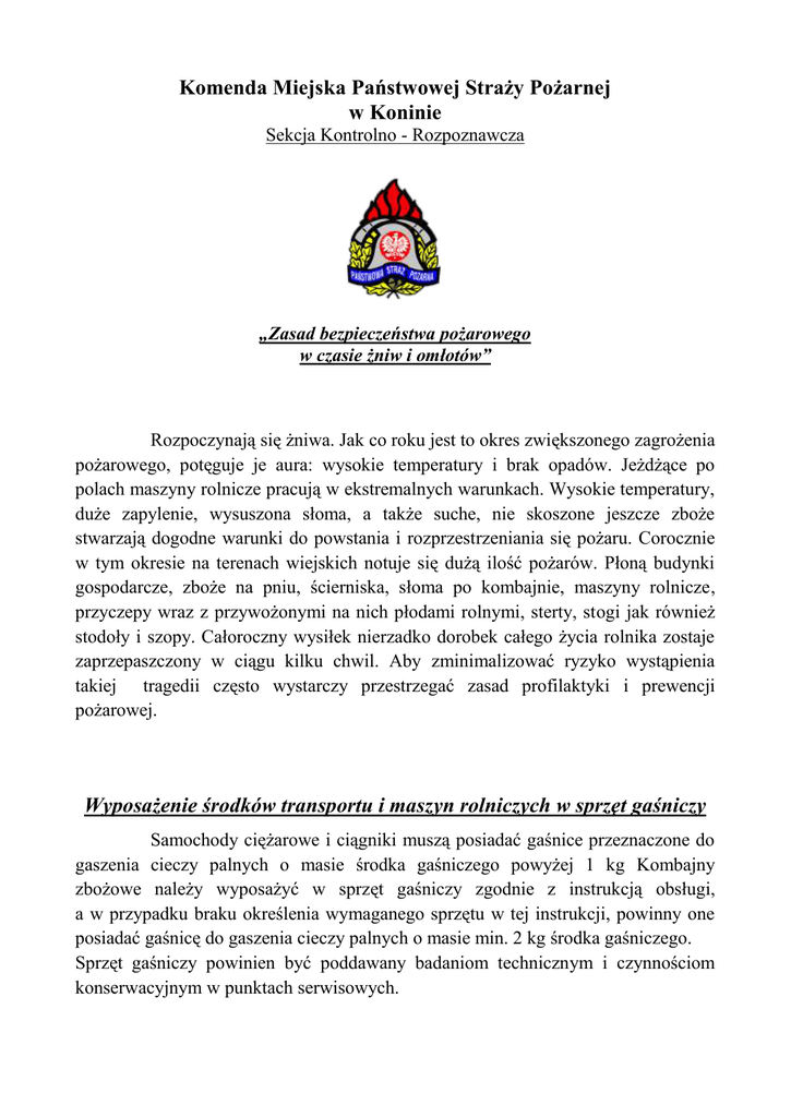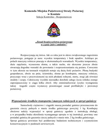 Komenda Miejska Państwowej Straży Pożarnej w Koninie Sekcja Kontrolno - Rozpoznawcza „Zasad bezpieczeństwa pożarowego w czasie żniw i omłotów” Rozpoczynają się żniwa. Jak co roku jest to okres zwiększonego zagrożenia pożarowego, potęguje je aura: wysokie temperatury i brak opadów. Jeżdżące po polach maszyny rolnicze pracują w ekstremalnych warunkach. Wysokie temperatury, duże zapylenie, wysuszona słoma, a także suche, nie skoszone jeszcze zboże stwarzają dogodne warunki do powstania i rozprzestrzeniania się pożaru. Corocznie w tym okresie na terenach wiejskich notuje się dużą ilość pożarów. Płoną budynki gospodarcze, zboże na pniu, ścierniska, słoma po kombajnie, maszyny rolnicze, przyczepy wraz z przywożonymi na nich płodami rolnymi, sterty, stogi jak również stodoły i szopy. Całoroczny wysiłek nierzadko dorobek całego życia rolnika zostaje zaprzepaszczony w ciągu kilku chwil. Aby zminimalizować ryzyko wystąpienia takiej tragedii często wystarczy przestrzegać zasad profilaktyki i prewencji pożarowej. Wyposażenie środków transportu i maszyn rolniczych w sprzęt gaśniczy Samochody ciężarowe i ciągniki muszą posiadać gaśnice przeznaczone do gaszenia cieczy palnych o masie środka gaśniczego powyżej 1 kg Kombajny zbożowe należy wyposażyć w sprzęt gaśniczy zgodnie z instrukcją obsługi, a w przypadku braku określenia wymaganego sprzętu w tej instrukcji, powinny one posiadać gaśnicę do gaszenia cieczy palnych o masie min. 2 kg środka gaśniczego. Sprzęt gaśniczy powinien być poddawany badaniom technicznym i czynnościom konserwacyjnym w punktach serwisowych. Ustawianie stert i stogów Ustawiając stertę lub stóg musimy sobie zdawać sprawę, ze składowane w ten sposób płody rolne stwarzają zagrożenie pożarowe przez cały rok. Musimy pamiętać, aby przy ustawianiu stert i stogów zachować minimalne odległości, które wynoszą: - 100 m od lasów i terenów zadrzewionych, - 30 m od budynków wykonanych z materiałów palnych, od torów kolejowych i dróg publicznych, od urządzeń i przewodów linii elektrycznych wysokiego napięcia, - 20 m od budynków wykonanych z materiałów niepalnych i dachach o pokryciu, co najmniej trudno zapalnym, - 30 m między stertami, stogami stanowiącymi różne strefy pożarowe Ponadto należy pamiętać, że wokół stert i stogów należy wykonać i utrzymywać powierzchnię o szerokości, co najmniej 2 m w odległości 3 m od ich obrysu, pozbawioną materiałów palnych. Strefa pożarowa sterty lub stogu z palnymi produktami roślinnymi nie może przekraczać powierzchni 1000 m 2 lub kubatury 5000 m 3. Produkty rolne należy składować w sposób uniemożliwiający ich samozapalenie. W przypadku konieczności składowania produktów niedosuszonych np. siana, należy, co pewien czas sprawdzać ich temperaturę. Stwierdzenie wzrostu temperatury to znak rozpoczęcia procesów gnilnych prowadzących do samozapłonu. Takie siano należy rozrzucić, przewietrzyć i dosuszyć. Wypalanie słomy i pozostałości roślinnych na polach Obowiązujące przepisy w sprawie ochrony przeciwpożarowej budynków, innych obiektów budowlanych i terenów stanowią, że wypalanie słomy i pozostałości roślinnych na polach jest zabronione. Należy wspomnieć również, że Ustawa o Ochronie Przyrody jednoznacznie zabrania wypalania łąk, pastwisk, nieużytków, rowów, pasów przydrożnych, szlaków kolejowych oraz trzcinowisk i szuwarów. Postępowanie w przypadku powstania pożaru Jeśli dojdzie do powstania pożaru, należy: natychmiast powiadomić osoby znajdujące się w strefie zagrożenia, zaalarmować straż pożarną - telefonicznie na numer 998, 112, przystąpić do likwidacji pożaru za pomocą podręcznego sprzętu gaśniczego oraz do ewakuacji zwierząt i mienia, w przypadku pożaru zboża na pniu ograniczyć rozprzestrzenianie się ognia poprzez wykoszenie zboża i oboranie terenu zagrożonego.