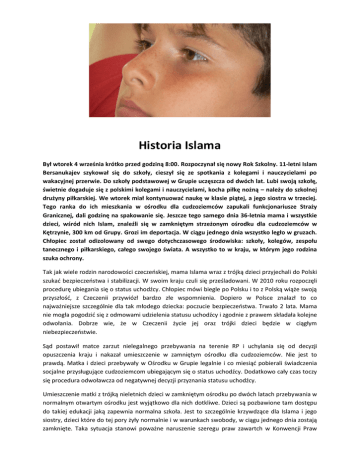 Historia Islama Był wtorek 4 września krótko przed godziną 8:00. Rozpoczynał się nowy Rok Szkolny. 11-letni Islam Bersanukajev szykował się do szkoły, cieszył się ze spotkania z kolegami i nauczycielami po wakacyjnej przerwie. Do szkoły podstawowej w Grupie uczęszcza od dwóch lat. Lubi swoją szkołę, świetnie dogaduje się z polskimi kolegami i nauczycielami, kocha piłkę nożną – należy do szkolnej drużyny piłkarskiej. We wtorek miał kontynuować naukę w klasie piątej, a jego siostra w trzeciej. Tego ranka do ich mieszkania w ośrodku dla cudzoziemców zapukali funkcjonariusze Straży Granicznej, dali godzinę na spakowanie się. Jeszcze tego samego dnia 36-letnia mama i wszystkie dzieci, wśród nich Islam, znaleźli się w zamkniętym strzeżonym ośrodku dla cudzoziemców w Kętrzynie, 300 km od Grupy. Grozi im deportacja. W ciągu jednego dnia wszystko legło w gruzach. Chłopiec został odizolowany od swego dotychczasowego środowiska: szkoły, kolegów, zespołu tanecznego i piłkarskiego, całego swojego świata. A wszystko to w kraju, w którym jego rodzina szuka ochrony. Tak jak wiele rodzin narodowości czeczeńskiej, mama Islama wraz z trójką dzieci przyjechali do Polski szukać bezpieczeństwa i stabilizacji. W swoim kraju czuli się prześladowani. W 2010 roku rozpoczęli procedurę ubiegania się o status uchodźcy. Chłopiec mówi biegle po Polsku i to z Polską wiąże swoją przyszłość, z Czeczenii przywiózł bardzo złe wspomnienia. Dopiero w Polsce znalazł to co najważniejsze szczególnie dla tak młodego dziecka: poczucie bezpieczeństwa. Trwało 2 lata. Mama nie mogła pogodzić się z odmowami udzielenia statusu uchodźcy i zgodnie z prawem składała kolejne odwołania. Dobrze wie, że w Czeczenii życie jej oraz trójki dzieci będzie w ciągłym niebezpieczeństwie. Sąd postawił matce zarzut nielegalnego przebywania na terenie RP i uchylania się od decyzji opuszczenia kraju i nakazał umieszczenie w zamniętym ośrodku dla cudzoziemców. Nie jest to prawdą. Matka i dzieci przebywały w Ośrodku w Grupie legalnie i co miesiąć pobierali świadczenia socjalne przysługujące cudzoziemcom ubiegającym się o status uchodźcy. Dodatkowo cały czas toczy się procedura odwoławcza od negatywnej decyzji przyznania statusu uchodźcy. Umieszczenie matki z trójką nieletnich dzieci w zamkniętym ośrodku po dwóch latach przebywania w normalnym otwartym ośrodku jest wyjątkowo dla nich dotkliwe. Dzieci są pozbawione tam dostępu do takiej edukacji jaką zapewnia normalna szkoła. Jest to szczególnie krzywdzące dla Islama i jego siostry, dzieci które do tej pory żyły normalnie i w warunkach swobody, w ciągu jednego dnia zostają zamknięte. Taka sytuacja stanowi poważne naruszenie szeregu praw zawartch w Konwencji Praw Dziecka jak i innych dokumentach międzynarodowych, których Polska jest stroną. Artykuł 3 nakazuje kierowanie się najlepszym interesem dziecka we wszystkich działaniach władz publicznych dotyczących małoletnich. Artykuł 37 Konwencji stanowi natomiast, iż detencja może być zastosowana wobec dzieci jedynie jako środek ostateczny i na właściwy, możliwie najkrótszy czas. W takich ośrodkach zamyka się przecież z reguły osoby, które popełniły poważne przestępstwo lub próbowały przedostawać się dalej do zachodnich krajów Unii Europejskiej. Islam, jego mama, brat i siostra nie popełnili żadnego przestępstwa zagrażającego bezpieczeństwu Polski i nigdy nie próbowali uciekać dalej za granicę. Rozpoczął się rok szkolny, Islam siedział bezczynnie zamknięty w ośrodku przez dwa tygodnie. Chłopak nie może zrozumieć dlaczego został tak potraktowany przez kraj, w którym chciałby mieszkać do końca życia. Dlatego nauczył się języka polskiego, regularnie chodził do szkoły. Działał na rzecz szkoły. Reprezentował także swoją kulturę kaukaską na licznych imprezach kulturalnych – tańczył i deklamował wiersze. Można powiedzieć, że przyczyniał się do zmniejszania postaw nietolerancji wśród Polaków. Jego opowieści o kulturze Kaukazu i występy budziły podziw ludzi, on sam jest otwarty i przyjacielski w stosunku do każdego – bez względu na pochodzenie. Szczególnym współczuciem obdarza ludzi niepełnosprawnych i chętnie niesie pomoc. Zrozpaczony Islam w liście do sądu napisał: Proszę o wypuszczenie mnie z tego ośrodka zamkniętego. Ja chcę wrócić do swojej szkoły i do kolegów i koleżanek ze szkoły, gdzie chodziłem przez 2 lata. Chcę wrócić do drużyny piłkarskiej i do Grupy. W tym ośrodku jest smutno i czuję się samotny no i czuję się jak w więzieniu. A ja nic złego przecież nie zrobiłem !!! Ja pokochałem Polskę i nie chcę stąd wyjeżdżać !!!!!!! Islam Bersanukajev. Mama Islama, Zalpa Nurgalieva, złożyła zażalenie na postanowienie o umieszczeniu w zamkniętym ośrodku. 18 września Sąd Okręgowy w Bydgoszczy uchylił decyzję o umieszczeniu w Ośrodku Zamkniętym i po dwóch tygodniach pobytu w warunkach detencji matka, Islam, siostra Rajana i dwuletni brat Imam mogli powrócić do Ośrodka w Grupie. Co dalej ? Los Islama, jego mamy, siostry i brata stoi nadal pod wielkim znakiem zapytania. Urząd ds. Cudzoziemców już kilkakrotnie wydał odmowę przyznania statusu uchodźcy i nakaz opuszczenia kraju. Urzędnicy uznają argumenty matki o prześladowaniach i niebezbieczeństwach w Czeczenii dla niej i trójki dzieci za niewystarczające. Zdają się nie brać pod uwagę wszystkich okoliczności tej sprawy,a w szczególności tego, że decydują tutaj także o losie dzieci. Rodzina ta już i tak została skrzywdzona przez niesłuszne osadzenie jej w Ośrodku Strzeżonym. Obecnie toczy się kolejne postępowanie odwoławcze.