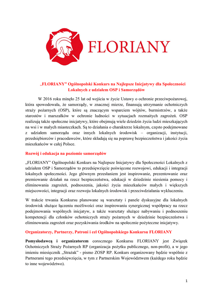 „FLORIANY” Ogólnopolski Konkurs na Najlepsze Inicjatywy dla Społeczności Lokalnych z udziałem OSP i Samorządów W 2016 roku minęło 25 lat od wejścia w życie Ustawy o ochronie przeciwpożarowej, która spowodowała, że samorządy, w znacznej mierze, finansują utrzymanie ochotniczych straży pożarnych (OSP), które są znaczącym wsparciem wójtów, burmistrzów, a także starostów i marszałków w ochronie ludności w sytuacjach rozmaitych zagrożeń. OSP realizują także społeczne inicjatywy, które obejmują wiele dziedzin życia ludzi mieszkających na wsi i w małych miasteczkach. Są to działania o charakterze lokalnym, często podejmowane z udziałem samorządu oraz innych lokalnych środowisk – organizacji, instytucji, przedsiębiorców i pracodawców, które składają się na poprawę bezpieczeństwa i jakości życia mieszkańców w całej Polsce. Rozwój i edukacja na poziomie samorządów „FLORIANY” Ogólnopolski Konkurs na Najlepsze Inicjatywy dla Społeczności Lokalnych z udziałem OSP i Samorządów to przedsięwzięcie poświęcone rozwojowi, edukacji i integracji lokalnych społeczności. Jego głównym przesłaniem jest inspirowanie, prezentowanie oraz premiowanie działań na rzecz bezpieczeństwa, edukacji w dziedzinie niesienia pomocy i eliminowania zagrożeń, podnoszenia, jakości życia mieszkańców małych i większych miejscowości, integracji oraz rozwoju lokalnych środowisk i przeciwdziałania wykluczeniu. W trakcie trwania Konkursu planowane są warsztaty i panele dyskusyjne dla lokalnych środowisk służące łączeniu możliwości oraz inspirowaniu synergicznej współpracy na rzecz podejmowania wspólnych inicjatyw, a także warsztaty służące nabywaniu i podnoszeniu kompetencji dla członków ochotniczych straży pożarnych w dziedzinie bezpieczeństwa i eliminowania zagrożeń oraz pozyskiwania środków na społecznie pożyteczne inicjatywy. Organizatorzy, Partnerzy, Patroni i cel Ogólnopolskiego Konkursu FLORIANY Pomysłodawcą i organizatorem corocznego Konkursu FLORIANY jest Związek Ochotniczych Straży Pożarnych RP (organizacja pożytku publicznego, non-profit), a w jego imieniu miesięcznik „Strażak” - pismo ZOSP RP. Konkurs organizowany będzie wspólnie z Partnerami tego przedsięwzięcia, w tym z Partnerskim Województwem (każdego roku będzie to inne województwo). 1 Partnerzy Partner strategiczny I edycji Konkursu FLORIANY: Województwo Mazowieckie Partner: Pracodawcy RP Patroni honorowi: • marszałkowie wszystkich 16 województw, • Związek Gmin Wiejskich RP, • Związek Miast Polskich, • Związek Powiatów Polskich, • Związek Województw Polskich Patroni medialni: • POLSAT News • Jedynka Polskie Radio • Kurier Lubelski • Gazeta Wrocławska • Gazeta Lubuska • portal internetowy: naszemiasto.pl • portal internetowy: strażacki.pl Konkurs ma na celu: • inspirowanie, prezentowanie oraz premiowanie działań na rzecz bezpieczeństwa, edukacji w dziedzinie niesienia pomocy i eliminowania zagrożeń oraz podnoszenia jakości życia mieszkańców wsi i małych miast • integracja i przeciwdziałanie wykluczeniu, a także wspieranie rozwoju i aktywizacja lokalnych środowisk. • promowanie dobrej współpracy samorządów i lokalnych środowisk z ochotniczymi strażami pożarnymi, • nagradzanie najlepszych projektów zrealizowanych z udziałem ochotniczych straży pożarnych i samorządów oraz innych lokalnych środowisk, organizacji i instytucji, • propagowanie działalności na rzecz społeczeństwa i innowacyjnych rozwiązań w szerokim znaczeniu (patrz: Kategorie konkursowe), 2 • promocja najaktywniejszych ochotniczych straży pożarnych, sprawnie działających samorządów i środowisk lokalnych. Kapituła oraz kategorie konkursowe Zainteresowane środowiska nadsyłają opisy i prezentacje projektów zrealizowanych przez ochotnicze straże oraz ich partnerów w kategoriach takich, jak: rozbudowa infrastruktury lokalnej, poprawa bezpieczeństwa, ochrona środowiska i ekologia, poprawa estetyki przestrzeni publicznej, edukacja, rozwój sportu i rekreacji oraz turystyki, kultura i tradycja, aktywizowanie seniorów i współpraca pokoleń, integracja społeczna, innowacje oraz integracja cyfrowa poprzez zwiększanie dostępności do Internetu i tworzenie bezpiecznego środowiska cyfrowego, współpraca zagraniczna, najbardziej zaangażowany społecznie pracodawca. Oceniać je będzie Kapituła Konkursowa składająca się z osób będących autorytetami w dziedzinach związanych z powyższymi kategoriami. Przebieg i rozstrzygnięcie Konkursu FLORIANY Konkurs ogłaszany będzie co roku. Jego pierwsza edycja (2016/2017) zostanie rozstrzygnięta wyłącznie na szczeblu centralnym w maju 2017 roku (135. rocznica powstania tytułu „Strażak”). W ogłoszonym w 2016 roku Konkursie ocenione zostaną projekty zrealizowane w latach 2015‒2016. Uroczyste uhonorowanie zwycięzców każdej edycji Konkursu odbędzie się podczas gali, na której laureatom wręczone zostaną specjalne statuetki „FLORIANY” oraz nagrody. Oryginalne statuetki zostaną zaprojektowane specjalnie na Konkurs. Każdego roku gala będzie odbywała się na terenie innego województwa, które będzie Partnerem strategicznym organizatorów Konkursu. W uroczystym podsumowaniu udział wezmą zwycięzcy i realizatorzy projektów wyróżnionych (nominowanych), uczestnicy Konkursu, Partnerzy i Patroni, przedstawiciele samorządu, współorganizatorzy i sponsorzy oraz goście. Nagłośnienie i promocja Konkursu Konkurs, jak również jego Partnerzy, Patroni oraz Sponsorzy jest promowany przez cały okres jego trwania (z podsumowaniem całego wydarzenia w czerwcu 2017 roku) na łamach miesięcznika „Strażak”, na stronie internetowej Konkursu FLORIANY – www.floriany.pl, stronach internetowych Związku OSP RP i „Strażaka” oraz w mediach społecznościowych (Facebook i Twitter). Informacja podawana jest pod