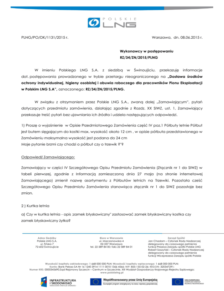PLNG/PO/DK/1131/2015 r. Warszawa, dn. 08.06.2015 r. Wykonawcy w postępowaniu RZ/34/ZN/2015/PLNG W imieniu Polskiego LNG S.A. z siedzibą w Świnoujściu, przekazuję informacje dot. postępowania prowadzonego w trybie przetargu nieograniczonego na „Dostawa środków ochrony indywidualnej, higieny osobistej i obuwia roboczego dla pracowników Pionu Eksploatacji w Polskim LNG S.A”, oznaczonego: RZ/34/ZN/2015/PLNG. W związku z otrzymaniem przez Polskie LNG S.A., zwaną dalej „Zamawiającym”, pytań dotyczących przedmiotu zamówienia, działając zgodnie z Rozdz. XX SIWZ, ust. 1, Zamawiający przekazuje treść pytań bez ujawniania ich źródła i udziela następujących odpowiedzi. 1) Proszę o wyjaśnienie w Opisie Przedmiotowego Zamówienia część IV poz.1 Półbuty letnie Półbut jest butem sięgającym do kostki max. wysokość około 12 cm , w opisie półbuta przedstawionego w Zamówieniu maksymalna wysokość jest podana do 24 cm Moje pytanie brzmi czy chodzi o półbut czy o trzewik ?"? Odpowiedź Zamawiającego: Zamawiający w części IV Szczegółowego Opisu Przedmiotu Zamówienia (Złącznik nr 1 do SIWZ) w tabeli pierwszej, zgodnie z Informacją zamieszczoną dnia 27 maja (na stronie internetowej Zamawiającego) zmienił nazwę asortymentu z Półbutów letnich na Trzewiki. Pozostała cześć Szczegółowego Opisu Przedmiotu Zamówienia stanowiąca złącznik nr 1 do SIWZ pozostaje bez zmian. 2 ) Kurtka letnia a) Czy w kurtka letnia - opis ;zamek błyskawiczny" zastosować zamek błyskawiczny kostka czy zamek błyskawiczny żyłka? Adres Siedziby Polskie LNG S.A. ul. Fińska 7 72-602 Świnoujście Biuro w Warszawie ul. Mszczonowska 4 02-337 Warszawa tel. 22 589 84 00; faks 22 589 84 01 Zarząd Spółki Jan Chadam – Członek Rady Nadzorczej delegowany do czasowego pełnienia funkcji Prezesa Zarządu spółki Polskie LNG Robert Soszyński – Członek Rady Nadzorczej delegowany do czasowego pełnienia funkcji Wiceprezesa Zarządu spółki Polskie Wysokość kapitału zakładowego: 1 668 000 000 PLN; Wysokość kapitału wpłaconego: 1 668 000 000 PLN; Konto: Bank Pekao SA Nr 16 1240 3914 1111 0010 1366 4566; NIP: 855-155-02-26; REGON: 320347291; Numer KRS: 0000345690,Sąd Rejonowy Szczecin – Centrum w Szczecinie, XIII Wydział Gospodarczy Krajowego Rejestru Sądowego; www.polskielng.pl b) Czy można użyć samych certyfikatów na tkaninę i taśmę odblaskową, które będą potwierdzać normy takie same jak w przetargu? Odpowiedź Zamawiającego: a) Zamawiający prosi o zastosowanie zamka błyskawicznego kostka. b) Zamawiający wymaga ,certyfikatu na gotowy produkt 3) Spodnie typu ogrodniczki a) Czy w spodniach opis ;zamek błyskawiczny" zastosować zamek błyskawiczny kostka czy zamek błyskawiczny żyłka? b) Czy można użyć samych certyfikatów na tkaninę i taśmę odblaskową, które będą potwierdzać normy takie same jak w przetargu? Odpowiedź Zamawiającego: a) Zamawiający prosi o zastosowanie zamka błyskawicznego kostka. b) Zamawiający wymaga ,certyfikatu na gotowy produkt 4) Spodnie zimowe a) Opis; zamek błyskawiczny" zastosować zamek błyskawiczny kostka czy zamek błyskawiczny żyłka? b) Czy można użyć samych certyfikatów na tkaninę i taśmę odblaskową, które będą potwierdzać normy takie same jak w przetargu? c) Czy można użyć cięższą tkaninę 330gram niż w specyfikacji 310gram ? Odpowiedź Zamawiającego: a) Zamawiający prosi o zastosowanie zamka błyskawicznego kostka. b) Zamawiający wymaga ,certyfikatu na gotowy produkt c) Tak, Zamawiający dopuszcza zmianę gramatury +/- 10% czyli 310g/m2 od 279g/m2 do 341 g/m2 5) Kurtka zimowa a) Opis ;zamek błyskawiczny" zastosować zamek błyskawiczny kostka czy zamek błyskawiczny żyłka? b) Czy można użyć samych certyfikatów na tkaninę i taśmę odblaskową, które będą potwierdzać normy takie same jak w przetargu? Odpowiedź Zamawiającego: a) Zamawiający prosi o zastosowanie zamka błyskawicznego kostka. b) Zamawiający wymaga ,certyfikatu na gotowy produkt 6) Normy a) czy normę EN343,EN342(B),3,2.EN ISO Strona 2 z 3 20471,EN13034+A1,EN61482-1-2,EN1149-5,EN1149-3,EN ISO11611,EN ISO11612-DOTYCZĄCE ODZIEŻY OCHRONNEJ ,czy można zastąpić certyfikatami na tkaninę, spełniającą normy EN343,EN342,EN 20471,EN 13034,EN61482-1-2,EN1149-5,EN1149-3,EN 11611,EN 11612 ? Odpowiedź Zamawiającego: a) Zamawiający nie wyraża zgody,, należy dołączyć certyfikat na gotowy produkt. Strona 3 z 3