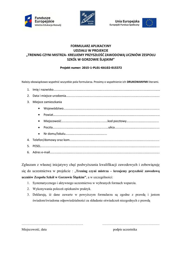 FORMULARZ APLIKACYJNY UDZIAŁU W PROJEKCIE „TRENING CZYNI MISTRZA- KREUJEMY PRZYSZŁOŚĆ ZAWODOWĄ UCZNIÓW ZESPOŁU SZKÓŁ W GORZOWIE ŚLĄSKIM” Projekt numer: 2015-1-PL01-KA102-015372 Należy obowiązkowo wypełnid wszystkie pola formularza. Prosimy o wypełnienie ich DRUKOWANYMI literami. 1. Imię i nazwisko………………………………………………………………………………………………………………………… 2. Data i miejsce urodzenia…………………………………………………………………………………………………………. 3. Miejsce zamieszkania Województwo………………………………………………………………………………………………………….... Powiat………………………………………………………………………………………………………………………… Miejscowośd……………………………………………………kod pocztowy…………………………………… Poczta………………………………………………………………ulica…………………………………………………. Nr domu/lokalu……………………………………………… 4. Telefon/domowy oraz kom…………………………………………………………………………………………………….. 5. PESEL………………………………………………………………………………………………………………………………………. 6. Adres e-mail……………………………………………………………………………………………………………………………. Zgłaszam z własnej inicjatywy chęć podwyższania kwalifikacji zawodowych i zobowiązuję się do uczestnictwa w projekcie : „Trening czyni mistrza – kreujemy przyszłość zawodową uczniów Zespołu Szkół w Gorzowie Śląskim”, a w szczególności: 1. Systematycznego i aktywnego uczestnictwa w wybranych formach wsparcia. 2. Wykonywania poleceń opiekunów praktyk. 3. Deklaruję, iż dane zawarte w powyższym formularzu są zgodne z prawdą i jestem świadom/świadoma odpowiedzialności za składanie oświadczeń niezgodnych z prawdą ………………………………………………. Miejscowość, data …………………………………………… podpis uczestnika POTWIERDZENIE OŚWIADCZENIA PRZEZ RODZICA (dotyczy tylko uczniów niepełnoletnich) Ja…………………………………………………………potwierdzam zgodę mojego syna/mojej córki …………………………………………………………………..na uczestnictwo w projekcie: „Trening czyni mistrza-kreujemy przyszłość zawodową uczniów Zespołu Szkół w Gorzowie Śląskim” zgodnie z powyższym formularzem aplikacyjnym. …………………………………… ……………………………………………………. Miejscowość, data podpis rodzica(dotyczy uczniów niepełnoletnich)