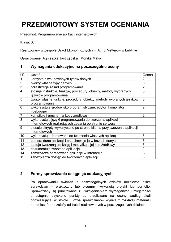 PRZEDMIOTOWY SYSTEM OCENIANIA Przedmiot: Programowanie aplikacji internetowych Klasa: 3ct Realizowany w Zespole Szkół Ekonomicznych im. A. i J. Vetterów w Lublinie Opracowanie: Agnieszka Jastrzębska i Monika Mąka 1. Wymagania edukacyjne na poszczególne oceny LP 1 2 3 4 10 11 12 13 14 15 Uczeń korzysta z wbudowanych typów danych tworzy własne typy danych przestrzega zasad programowania stosuje instrukcje, funkcje, procedury, obiekty, metody wybranych języków programowania tworzy własne funkcje, procedury, obiekty, metody wybranych języków programowania wykorzystuje środowisko programistyczne: edytor, kompilator i debugger kompiluje i uruchamia kody źródłowe wykorzystuje języki programowania do tworzenia aplikacji internetowych realizujących zadania po stronie serwera stosuje skrypty wykonywane po stronie klienta przy tworzeniu aplikacji internetowych wykorzystuje frameworki do tworzenia własnych aplikacji pobiera dane aplikacji i przechowuje je w bazach danych testuje tworzoną aplikację i modyfikuje jej kod źródłowy dokumentuje tworzoną aplikację zamieszcza opracowane aplikacje w Internecie zabezpiecza dostęp do tworzonych aplikacji 2. Formy sprawdzania osiągnięć edukacyjnych 5 6 7 8 9 Ocena 2 3 2 3 3 2 2 4 4 5 5 5 2 3 3 Po opracowaniu ćwiczeń z poszczególnych działów uczniowie piszą sprawdzian – praktyczny lub pisemny, wykonują projekt lub portfolio. Sprawdziany są punktowane z uwzględnieniem wymaganych umiejętności a następnie uzyskane punkty są przeliczane na oceny według skali obowiązującej w szkole. Liczba sprawdzianów wynika z rozkładu materiału natomiast forma zależy od treści realizowanych w poszczególnych działach. 1 3. Sposoby pozyskiwania ocen w ocenianiu bieżącym W ocenianiu bieżącym przewidziano: sprawdziany praktyczne, sprawdziany pisemne, testy, kartkówki sprawdzające wiadomości z ostatnich zajęć, oceny z aktywności, praca na lekcji, oceny z projektów. Pozytywną ocenę semestralną otrzymuje uczeń, który z wszystkich sprawdzianów w semestrze uzyskał ocenę pozytywną. Oceny z kartkówek i aktywności brane są pod uwagę przy ocenach ze sprawdzianów uniemożliwiających jednoznaczną ocenę ucznia. 4. Zasady przeprowadzania sprawdzianu umożliwiającego podwyższenie przewidywanej oceny klasyfikacyjnej Podczas sprawdzianu umożliwiającego podwyższenie przewidywanej oceny klasyfikacyjnej uczeń opracowuje wylosowany zestaw zadań, których treść jest podobna do zadań, które miał do wykonania podczas sprawdzianów i pracy na lekcji. Zadania będą badać opanowanie kilku wybranych umiejętności według tabeli z punktu 1. 2