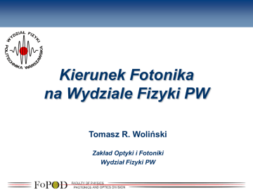 Kierunek Fotonika na Wydziale Fizyki PW Tomasz R. Woliński Zakład Optyki i Fotoniki Wydział Fizyki PW LCP-2008 Key Enabling Technologies in Europe (‘11) 1. Nano(micro)electronics 2. Nanotechnology 3. Advanced materials 4. Biotechnology 5. PHOTONICS LCP-2008 Najważniejsze odkrycia XX wieku Samolot (1903) Tranzystor i układ scalony (mikroelektronika) (1947) Komunikacja bezprzewodowa (Radio, TV, telefony komórkowe) Satelita Lasera i technologia fotoniczna (1960) Telekomunikacja światłowodowa (1970) Komputer TV, HDTV, DVD Internet (~1995) LCP-2008 Fotonika - Optoelektronika Dr Tyler Krupa (OSA): CFO LCP-2008 Fotonika Definicja fotoniki według Pierre Aigrain’sa (1967): “Fotonika jest nauką o wykorzystaniu światła” Fotonika obejmuje zjawiska: Generacji światła Kierowania światłem Detekcji światła poprzez prowadzenie sterowanie wzmacnianie a co najważniejsze… „Wykorzystanie światła z pożytkiem dla ludzkości” LCP-2008 Fotonika Technika i technologia: generowania i używania światła oraz innych form promieniowania elektromagnetycznego: Foton - jednostka kwantowa Nauka: emisja światła, transmisja, odbicie, wzmacnianie i detekcja poprzez elementy optyczne i aparaturę, lasery i inne źródła światła, elektrooptyczne instrumenty badawcze Lasery, światłowody Zastosowania: generowanie energii i jej pomiar, komunikacja, przetwarzanie informacji Czujniki fotoniczne, holografia LCP-2008 Fotonika – jak to się zaczęło? 1960 – wynalezienie laser i diody laserowej, Lata 70 – rozwój światłowodów do transmisji sygnałów za pomocą światła Lata 80 - ‘fotonika’ znajduje powszechne zastosowanie w życiu kiedy transmisja światłowodowa została zaadoptowana przez operatorów sieci telekomunikacyjnych, Dziś: lasery w przemyśle, czujniki biologiczne i chemiczne, diagnostyka medyczna i terapia, technika oświetleniowa i multimedialna, optyczne sieci komputerowe… www.photonics21.org LCP-2008 LCP-2008 Informatyka i komunikacja Fotonika w telekomunikacji: Sieci bardziej przejrzyste Sieci bardziej dynamiczne Sieci znacznie szybsze Sieci bardziej energooszczędne www.photonics21.org LCP-2008 Produkcja przemysłowa i jakość Lasery spełniają wiele zadań w przemyśle: Cięcie i łączenie Wiercenie Grawerowanie Od najmniejszych do największych, od produkcji masowej po pojedyncze egzemplarze: wiązka laserowa - jedno z najbardziej uniwersalnych narzędzi naszych czasów www.photonics21.org LCP-2008 Nauki biologiczne i zdrowie Fotonika w biologii i ochronie zdrowia: Mikroskopia – podgląd komórek i bakterii nowoczesne chirurgiczne narzędzia w neurochirurgii okulistyce i chirurgii Systemy obrazowania - tomografię komputerową i rezonans magnetyczny Endoskopia – łatwy dostęp do wnętrza ludzkiego ciała w najmniej inwazyjny sposób www.photonics21.org LCP-2008 Zielona fotonika fotowoltaika oszczędzanie energii ograniczenie emisji gazów cieplarnianych Zielona fotonika jest kluczową technologią globalnej równowagi dwutlenku węgla w atmosferze www.photonics21.org LCP-2008 Czujniki światłowodowe w materiałach kompozytowych Sieć włókien światłowodowych umieszczonych wewnątrz materiałów kompozytowych w procesie produkcji. LCP-2008 LCP-2008 endlessly single-mode (far-field) polarisation maintaining white-light hollow core extruded supercontinuum fibre (Schott SF6 glass) highly nonlinear small core hollow core – photonic bandgap Światłowody fotoniczne endlessly single-mode Ciekłe kryształy Ciekłe kryształy(1888) – Faza niebieska Termotropowe ciekłe kryształy Nagroda Nobla z Fizyki (1991) LCP-2008 Photonics at Faculty of Physics PHOTONIC CRYSTAL FIBERS • optical properties of photonic crystal fibers; • design and characterization of photonic liquid crystal fibers. 16 LCP-2008 Tunable PLCF devices LCP-2008 Photonics at Faculty of Physics OPTICAL FIBER SENSORS: for stress monitoring of composite materials; for monitoring of gas infrastructure in industry; for vibration monitoring. LCP-2008 18 Photonics at Faculty of Physics OPTICAL TOMOGRAPHY polarimetric tomography; breast cancer recognition; gel dosimetry with Optical Computed Tomography. LCP-2008 19 Photonics at Faculty of Physics EXTENDED DEPTH-OF-FIELD IMAGING • designing of diffractive and refractive imaging elements; • presbyopic human eye modeling and correction methods analysis; • development of machine vision techniques. 20 LCP-2008 Photonics at Faculty of Physics NONLINEAR OPTICS • nonlinear phenomena in nematic liquid crystals • spatial solitons for switching and routing light • nonlinear waveguides and photonic crystal fibers 21 LCP-2008 LCP-2008 Photonics has played many important roles in enabling the Broadband Global Internet and Worldwide Broadband Transformation and will continue to do so over the next 30 years Photonics will also have significant future impact in the 21st century in many areas beyond broadband information technologies LCP-2008 XXI Photonics Century Photonics 21 LCP-2008