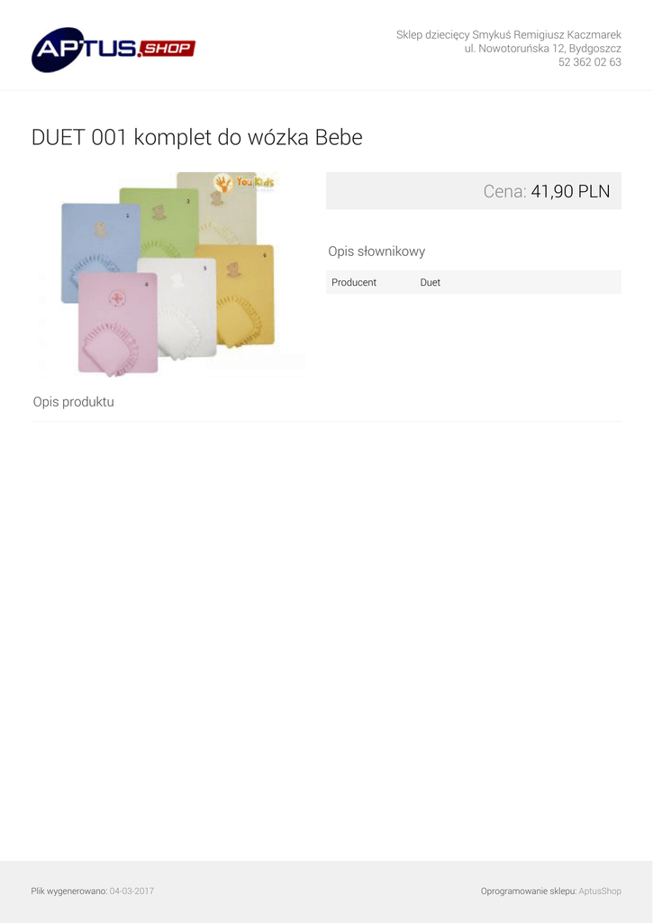 Sklep dziecięcy Smykuś Remigiusz Kaczmarek ul. Nowotoruńska 12, Bydgoszcz 52 362 02 63 DUET 001 komplet do wózka Bebe Cena: 41,90 PLN Opis słownikowy Producent Duet Opis produktu Plik wygenerowano: 04-03-2017 Powered by TCPDF (www.tcpdf.org) Oprogramowanie sklepu: AptusShop