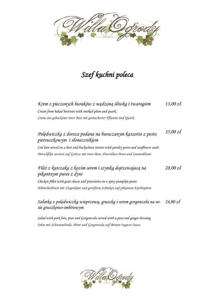 Szef kuchni poleca Krem z pieczonych buraków z wędzoną śliwką i twarogiem 13,00 zł Cream from baked beetroot with smoked plum and quark Creme aus gebackener roter Bete mit geräucherter Pflaume und Quark Polędwiczka z dorsza podana na buraczanym kaszotto z pesto pietruszkowym i słonecznikiem 35,00 zł Cod loin served on a beet and buckwheat risotto with parsley pesto and sunflower seeds Dorschfilet serviert auf Grütze mit roter Bete, Petersilien-Pesto und Sonnenblume Filet z kurczaka z kozim serem i szynką dojrzewajacą na pikantnym puree z dyni 28,00 zł Chicken fillet with goat cheese and prosciutto on a spicy pumpkin puree Hähnchenbrust mit Ziegenkäse und gereiftem Schinken auf pikantem Kürbispüree Sałatka z polędwiczką wieprzową, gruszką i serem gorgonzola na so- 24,00 zł sie gruszkowo-imbirowym Salad with pork loin, pear and Gorgonzola served with a pear and ginger dressing Salat mit Schweinelende, Birne und Gorgonzola auf Birnen-Ingwer-Sauce