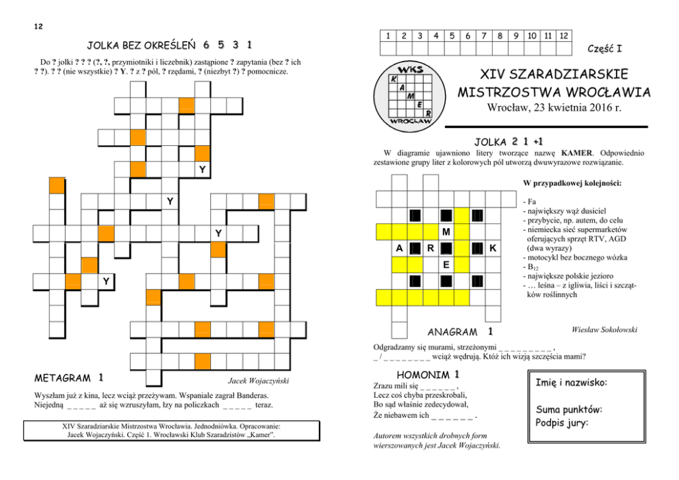 12 JOLKA BEZ OKREŚLEŃ 66 55 33 11 1 2 3 4 5 6 7 8 9 10 11 12 Część I Do ? jolki ? ? ? (?, ?, przymiotniki i liczebnik) zastąpione ? zapytania (bez ? ich ? ?). ? ? (nie wszystkie) ? Y. ? z ? pól, ? rzędami, ? (niezbyt ?) ? pomocnicze. XIV SZARADZIARSKIE MISTRZOSTWA WROCŁAWIA Wrocław, 23 kwietnia 2016 r. JOLKA 22 11 ++11 W diagramie ujawniono litery tworzące nazwę KAMER. Odpowiednio zestawione grupy liter z kolorowych pól utworzą dwuwyrazowe rozwiązanie. Y W przypadkowej kolejności: Y M Y A R K E Y ANAGRAM 11 - Fa - największy wąż dusiciel - przybycie, np. autem, do celu - niemiecka sieć supermarketów oferujących sprzęt RTV, AGD (dwa wyrazy) - motocykl bez bocznego wózka - B12 - największe polskie jezioro - … leśna – z igliwia, liści i szczątków roślinnych Wiesław Sokołowski Odgradzamy się murami, strzeżonymi _ _ _ _ _ _ _ _ _ , _ / _ _ _ _ _ _ _ _ wciąż wędrują. Któż ich wizją szczęścia mami? METAGRAM 11 Jacek Wojaczyński Wyszłam już z kina, lecz wciąż przeżywam. Wspaniale zagrał Banderas. Niejedną _ _ _ _ _ aż się wzruszyłam, łzy na policzkach _ _ _ _ _ teraz. XIV Szaradziarskie Mistrzostwa Wrocławia. Jednodniówka. Opracowanie: Jacek Wojaczyński. Część 1. Wrocławski Klub Szaradzistów „Kamer”. HOMONIM 11 Zrazu mili się _ _ _ _ _ _ , Lecz coś chyba przeskrobali, Bo sąd właśnie zedecydował, Że niebawem ich _ _ _ _ _ _ . Autorem wszystkich drobnych form wierszowanych jest Jacek Wojaczyński. Imię i nazwisko: Suma punktów: Podpis jury: 2 11 LOGOKOMBINATKA 33 22 11 WIRÓWKA ANAGRAMOWA OD A DO Z 55 44 33 22 11 ++ 11 Do diagramu należy wpisać wyrazy związane tematycznie. Taka sama liczba odpowiada takiej samej literze. W kolorowych polach znajdują się samogłoski, przy czym w diagramie nie występują litery A, Ą, Ę i Ó. 1 2 4 8 13 15 12 20 14 17 13 10 6 10 2 10 19 5 21 9 16 9 5 3 11 8 11 6 8 2 3 19 12 18 6 14 7 15 22 7 6 2 11 P 5 6 18 19 J 7 5 5 8 4 7 6 3 2 7 4 2 2 6 5 1 3 4 4 7 5 6 7 2 5 6 3 6 4 2 7 1 5 6 6 8 8 4 7 1 5 1 1) A, Ą, B, C. 2) Ć, D, E, Ę. 3) F, G, H, I. 4) J, K. L, Ł. 5) M, N, Ń, O. 6) Ó, P, R, S. 7) Ś, T, U, W. 8) Y, Z, Ź, Ż. 6 3 W 3 4 4 7 5 1 8 1 1 1 1 1 4 L M 1 C Ł 7 U A 6 G 2 Litery polskiego alfabetu (wszystkie występują w diagramie) podzielono na osiem zestawów czteroliterowych. Liczby w kratkach wskazują, w którym zestawie znajduje się szukana litera, np. RYNEK = 6-8-5-2-4. Litery z kolorowych pól, czytane kolumnami, utworzą niepunktowane rozwiązanie dodatkowe. 5 Z Ż Ś UŁÓŻ SAM 44 33 22 11 4 R 11 Adam Dengler 4 5 4 3 19 3 W „określeniach” (podanych w kolejności alfabetycznej) należy dodać do niektórych liter znak diakrytyczny, a następnie z nowego już zestawu ułożyć słowo 7-literowe i wpisać je do diagramu, np. zdrapka → prządka, stolarz → ostrzał, dzielna → lądzień. Wszystkie wyrazy wirówki są rzeczownikami pospolitymi, 5 występuje w liczbie mnogiej (w tym tantum pluralis). W kolorowych polach znajdują się litery diakrytyzowane (Ą, Ę, Ó, Ć, Ł, Ś, Ź, Ż). Do liter słowa utworzonego z liter z pól ponumerowanych od 1 do 7 należy dodać 2 znaki diakrytyczne i ułożyć nowe słowo – dodatkowe rozwiązanie zadania. 3 Ź K Ć D N S T Prawoskrętnie (druga litera w polu z kreską): - aleksja - bengali - bratowa - kilowat - kotlina - krasula - Lizbona - lunacja - MacLean - moletka - Niemiec - nietakt - okleina - paluchy - rdzenie - staliwo - Stewart - szperka - szpinet - wazonik Adam Dengler - zbierak Wiesław Sokołowski METAGRAMY 11 ++ 11 Pechowiec w lesie Znaleźć kwiat _ _ _ _ _ _ _ - to sprawa nieprosta. Jeszcze jakiś _ _ _ _ _ _ _ do oka się dostał… Lenistwo Choć na piętro _ _ _ _ _ schody Wjeżdżam _ _ _ _ _ - dla wygody 10 JOLKA JOLECZKA SYLABOWA 22 11 ++11 3 33 22 11 ZY W diagramie ujawniono dwie sylaby ZY. Z sylab z pól kolorowych należy ułożyć 3wyrazowy tytuł książki dla wszystkich i dla nikogo. Poziomo (kolejność przypadkowa): ZY - NaOH - SO2 i SO3 - H2SO4 W przypadkowej kolejności: - piękna i dzielna Atenka, tytułowa bohaterka "pacyfistycznej" sztuki Arystofanesa - polscy klienci banków gorliwi zwolennicy transakcji w walucie Szwajcarów - ... lilioczuby, barwny ptak leśny występujący w Kenii, Ugandzie i Tanzanii - potocznie: karaluchy, prusaki - miasto w pd.-zach. Francji, nad Garonną, siedziba koncernu lotniczego Airbus - " ... starszej pani", tragikomedia F. Dürrenmatta - dawniej obszar leżący po drugiej stronie naturalnego cieku wodnego Wiesław Sokołowski REBUS 22 Pionowo (kolejność przypadkowa): - pociecha dziadziusia - urzędniczy mebel - wśród nauk ścisłych - forma muzyczna pośrednia między recytatywem a arią - naczynie w laboratorium - imię tytułowej bohaterki filmu Luca Bessona lub pewnego radzieckiego przywódcy Adam Dengler Z CCCP do Afryki… LITEROWA FLOTA 22 ++ 22 W diagramie należy rozmieścić 10 statków w taki sposób, żeby zajęte przez nie pola nie stykały się, nawet narożnikami. Liczby obok diagramu informują, ile pól w danym wierszu lub kolumnie zajmują okręty. Ujawniono zawartość 2 pól. Należy nie tylko ustalić położenie całej floty, ale także rozmieścić ją w taki sposób, aby wszystkie litery, czytane rzędami, utworzyły tytuł powieści. 5 3 Ławrientij ... . Rozwiązanie 3-wyrazowe, o początkowych literach: B. F., L. LOGOGRYF 11 Rozwiązanie powstanie w kolorowych rzędach. 1 1) jak urośnie i ją pocałują, będzie księżniczką. 2) pokrywka. 3) wieje na Podhalu (z wiatrem znad Gardy). 2 Jacek Wojaczyński 3 Wiesław Sokołowski 1 3 1 5 0 5 2 Ą K C N 3 I Z J 2 4 M C I E M I R O Ś Y Ę E I 1 5 Jacek Wojaczyński 4 SZKODKA 22 1 KRZYŻÓWKA 22 2 3 Do diagramu należy wpisać nazwy osób (w tym jedno imię), zawierające słowo „kod” odmienione w jednym z przypadków liczby pojedynczej (kolorowe pola). 4 11 7 Do diagramu należy wpisać odgadnięte wyrazy pionowe, a w kolorowe pola - imiona trzech biblijnych braci. Pozost