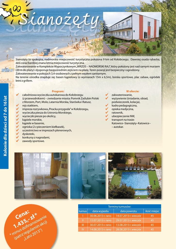 Sianożęty Sianożęty Kolonie dla dzieci od 7 do 16 lat Sianożęty to spokojna, nadmorska miejscowość turystyczna położona 9 km od Kołobrzegu. Dawniej osada rybacka, dziś coraz bardziej znana letnia miejscowość turystyczna. Zakwaterowanie w Kompleksie Wypoczynkowym „WRZOS – NADMORSKI RAJ”, który położony jest nad samym morzem (20 m do plaży) i dysponuje bezpośrednim zejściem na plażę. Teren posesji jest bezpieczny i ogrodzony. Zakwaterowanie w pokojach 3,4-osobowych z pełnym węzłem sanitarnym. Na terenie ośrodka znajduje się: basen kąpielowy (o wymiarach 15m x 6,5m), boiska sportowe, plac zabaw, ogródek letni z grillem. Program: całodniowa wycieczka autokarowa do Kołobrzegu (z przewodnikiem) – zwiedzanie miasta: Pomnik Zaślubin Polski z Morzem, Port, Molo, Latarnia Morska, Starówka i Ratusz, rejs statkiem, impreza rozrywkowa „Piracka przygoda” w Kołobrzegu, wycieczka piesza do Ustronia Morskiego, wycieczki piesze po okolicy, kąpiele morskie, kąpiele w basenie, ogniska (2 z pieczeniem kiełbasek), uczestnictwo w imprezach plenerowych, dyskoteki, konkursy z nagrodami, zawody sportowe. a: * n Ce ,- zł wanie 5 anso akcji 3 4 1. s dofin lamin ) inu egu 13” * m atrz r to 20 (p „La W ofercie: zakwaterowanie, wyżywienie (śniadanie, obiad, podwieczorek, kolacja), kadra pedagogiczna, opieka medyczna, ratownik, ubezpieczenie NW, transport na trasie: Katowice–Sianożęty–Katowice– – autokar. Terminy turnusów: turnus data wyjazdu data powrotu ilość miejsc I 30.06.2013 r. rano 14.07.2013 r. wieczór 45 II 15.07.2013 r. rano 29.07.2013 r. wieczór 45 III 30.07.2013 r. rano 13.08.2013 r. wieczór 45 IV 14.08.2013 r. rano 28.08.2013 r. wieczór 45