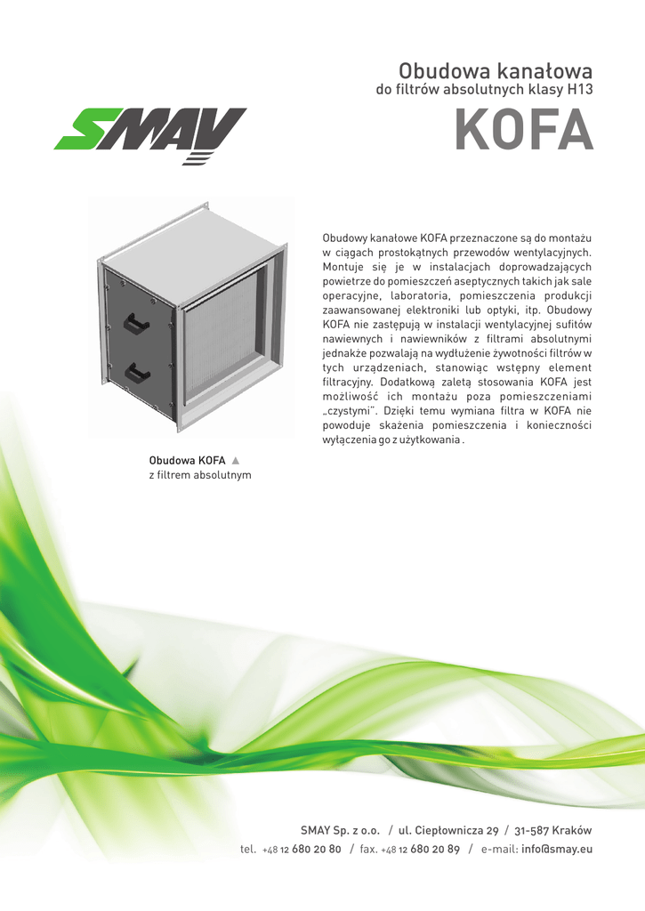 Obudowa kana³owa do filtrów absolutnych klasy H13 KOFA Obudowy kana³owe KOFA przeznaczone s¹ do monta¿u w ci¹gach prostok¹tnych przewodów wentylacyjnych. Montuje siê je w instalacjach doprowadzaj¹cych powietrze do pomieszczeñ aseptycznych takich jak sale operacyjne, laboratoria, pomieszczenia produkcji zaawansowanej elektroniki lub optyki, itp. Obudowy KOFA nie zastêpuj¹ w instalacji wentylacyjnej sufitów nawiewnych i nawiewników z filtrami absolutnymi jednak¿e pozwalaj¹ na wyd³u¿enie ¿ywotnoœci filtrów w tych urz¹dzeniach, stanowi¹c wstêpny element filtracyjny. Dodatkow¹ zalet¹ stosowania KOFA jest mo¿liwoœæ ich monta¿u poza pomieszczeniami „czystymi”. Dziêki temu wymiana filtra w KOFA nie powoduje ska¿enia pomieszczenia i koniecznoœci wy³¹czenia go z u¿ytkowania . Obudowa KOFA z filtrem absolutnym SMAY Sp. z o.o. / ul. Ciep³ownicza 29 / 31-587 Kraków tel. +48 12 680 20 80 / fax. +48 12 680 20 89 / e-mail: [email protected] Obudowa kana³owa KOFA Wykonanie Obudowa KOFA posiada korpus ze stali ocynkowanej lakierowanej na kolor bia³y RAL9010. Korpus jest obustronnie zakoñczony ko³nierzami do pod³¹czenia prostok¹tnych przewodów wentylacyjnych. Na jednym z jego boków umieszczona jest szczelna pokrywa rewizyjna mocowana za pomoc¹ 4 nakrêtek motylkowych. We wnêtrzu KOFA znajduje siê filtr powietrza klasy H13 wg normy PN EN 1822. Filtr jest mocowany w ³atwy sposób za pomoc¹ 4 docisków z nakrêtkami motylkowymi. W obudowie KOFA s¹ zamontowane króæce pomiarowe, pozwalaj¹ce na monitorowanie stanu zabrudzenia filtra, z u¿yciem presostatu ró¿nicowego. Monta¿ Obudowy KOFA powinny byæ montowane w sposób pozwalaj¹cy na bezproblemowe otwarcie pokrywy rewizyjnej i monta¿/ demonta¿ filtra powietrza. Zalecenia projektowe W celu prawid³owej pracy urz¹dzenia zalecana prêdkoœæ przep³ywu powietrza przez filtr klasy H13 powinna byæ nie wiêksza ni¿ 0,7 m/s. Zalecenia eksploatacyjne Zaleca siê stosowanie obudów KOFA wyposa¿onych w presostaty ró¿nicowe ciœnienia. Dziêki temu mo¿liwe jest zweryfikowanie stanu technicznego filtra powietrza bez koniecznoœci jego demonta¿u. Zaleca siê wymianê filtrów powietrza w momencie gdy spadek ciœnienia mierzonego na eksploatowanym filtrze dwukrotnie przekroczy wartoœæ spadku ciœnienia deklarowan¹ dla nowego egzemplarza. W przypadku gdy obudowa KOFA nie jest wyposa¿ona w presostat ró¿nicowy nale¿y dokonaæ pierwszej kontroli po 4 miesi¹cach od momentu monta¿u nowego filtra w celu sprawdzenia jego czystoœci. Je¿eli filtr nadaje siê jeszcze do eksploatacji kolejne kontrole nale¿y przeprowadzaæ w odstêpie miesiêcznym. W przypadku stwierdzenia zu¿ycia wymieniæ filtr na nowy. W trakcie monta¿u filtra powietrza nale¿y zwróciæ szczególn¹ uwagê na to by nie uszkodziæ uszczelek. Po monta¿u nale¿y dok³adnie sprawdziæ dokrêcenie nakrêtek motylkowych mocuj¹cych filtr w dociskach i pokrywê rewizyjn¹. Czynnoœci maj¹ na celu unikniêcie niepo¿¹danych nieszczelnoœci. Wymiary 720 wersja 5.2.5 Wymiary, masa i dobór KOFA Wielkoœæ obrze¿a P 20 30 30 30 30 30 30 12,2 13,8 19,0 16,1 20,2 28,3 18,7 24,1 37,4 14,8 19,0 27,1 17,0 22,0 31,8 19,3 25,2 37,0 23,9 31,9 47,6 Gdzie: Masa – waga urz¹dzenia w kg L 400 450 550 400 450 550 400 450 550 400 450 550 400 450 550 400 450 550 400 450 550 Dobór wersja 5.2.5 721 Wymiary, masa i dobór KOFA Akcesoria i sposób zamówienia KOFA Przy zamówieniu nale¿y podaæ informacje wed³ug poni¿szego sposobu: KOFA - <A>x<B>x<W> / <ADD> Gdzie: <A> <B> <W> <ADD> - szerokoœæ filtra powietrza w mm - d³ugoœæ filtra powietrza w mm - gruboœæ filtra powietrza w mm - akcesoria: brak = bez presostatu ró¿nicowego PR = z presostatem ró¿nicowym Przyk³ad zamówienia: KOFA – 305x305x150 / PR 722 wersja 5.2.5