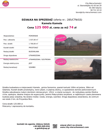 City Nieruchomości ul. Starowiejska 41-43 lok 20 81-363 Gdynia 58 711 10 10 [email protected] DZIAŁKA NA SPRZEDAŻ (oferta nr.: 285/CTN/GS) Kamela Kamela Cena 125 000 zł, cena za m2 74 zł Województwo POMORSKIE Pow. całkowita 1 037,00 m2 Pow. działki 1 700,00 m2 Kształt działki PROSTOKĄT Rodzaj działki BUDOWLANA Droga dojazdowa UTWARDZONA Rodzaj nawierzchni UTWARDZONA / SZUTROWA Energia elektryczna JEST Rodzaj kanalizacji SZAMBO Działka budowlana w miejscowości Kamela , gmina Somonino, powiat kartuski 100m od jeziora, 30km od Gdańska. Kształt działki prostokątny, teren płaski, w pięknej okolicy, w sąsiedztwie domów jednorodzinnych. Działka zabudowana małym domkiem rekreacyjnym (25m) w stanie surowym, do rozbudowy.zambo Okolica cicha, spokojna, idealne miejsce do wypoczynku. Jezioro Połęczyńskie zarybione, w najbliższym czasie planowana budowa plaży wiejskiej. Na działce media ( woda, energia, szambo). Droga dojazdowa utwardzona, do centrum wsi około 2 km, do Przywidza 9km. Cena działki 125.000 zł. Polecamy i zapraszamy do kontaktu. kontakt do agenta: Aldona Gólnik +48 665-049-034 [email protected] więcej ofert na stronie www.city-nieruchomosci.com