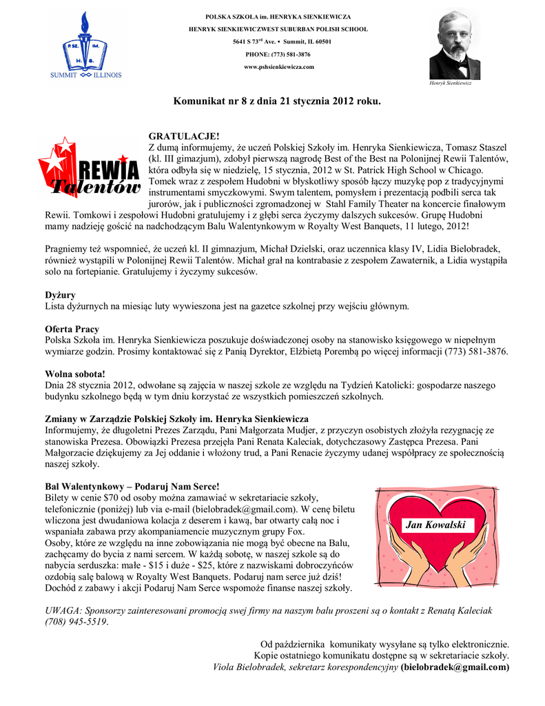 POLSKA SZKOŁA im. HENRYKA SIENKIEWICZA HENRYK SIENKIEWICZWEST SUBURBAN POLISH SCHOOL 5641 S 73rd Ave. Summit, IL 60501 PHONE: (773) 581-3876 www.pshsienkiewicza.com Henryk Sienkiewicz Komunikat nr 8 z dnia 21 stycznia 2012 roku. GRATULACJE! Z dumą informujemy, że uczeń Polskiej Szkoły im. Henryka Sienkiewicza, Tomasz Staszel (kl. III gimazjum), zdobył pierwszą nagrodę Best of the Best na Polonijnej Rewii Talentów, która odbyła się w niedzielę, 15 stycznia, 2012 w St. Patrick High School w Chicago. Tomek wraz z zespołem Hudobni w błyskotliwy sposób łączy muzykę pop z tradycyjnymi instrumentami smyczkowymi. Swym talentem, pomysłem i prezentacją podbili serca tak jurorów, jak i publiczności zgromadzonej w Stahl Family Theater na koncercie finałowym Rewii. Tomkowi i zespołowi Hudobni gratulujemy i z głębi serca życzymy dalszych sukcesów. Grupę Hudobni mamy nadzieję gościć na nadchodzącym Balu Walentynkowym w Royalty West Banquets, 11 lutego, 2012! Pragniemy też wspomnieć, że uczeń kl. II gimnazjum, Michał Dzielski, oraz uczennica klasy IV, Lidia Bielobradek, również wystąpili w Polonijnej Rewii Talentów. Michał grał na kontrabasie z zespołem Zawaternik, a Lidia wystąpiła solo na fortepianie. Gratulujemy i życzymy sukcesów. Dyżury Lista dyżurnych na miesiąc luty wywieszona jest na gazetce szkolnej przy wejściu głównym. Oferta Pracy Polska Szkoła im. Henryka Sienkiewicza poszukuje doświadczonej osoby na stanowisko księgowego w niepełnym wymiarze godzin. Prosimy kontaktować się z Panią Dyrektor, Elżbietą Porembą po więcej informacji (773) 581-3876. Wolna sobota! Dnia 28 stycznia 2012, odwołane są zajęcia w naszej szkole ze względu na Tydzień Katolicki: gospodarze naszego budynku szkolnego będą w tym dniu korzystać ze wszystkich pomieszczeń szkolnych. Zmiany w Zarządzie Polskiej Szkoły im. Henryka Sienkiewicza Informujemy, że długoletni Prezes Zarządu, Pani Małgorzata Mudjer, z przyczyn osobistych złożyła rezygnację ze stanowiska Prezesa. Obowiązki Prezesa przejęła Pani Renata Kaleciak, dotychczasowy Zastępca Prezesa. Pani Małgorzacie dziękujemy za Jej oddanie i włożony trud, a Pani Renacie życzymy udanej współpracy ze społecznością naszej szkoły. Bal Walentynkowy – Podaruj Nam Serce! Bilety w cenie $70 od osoby można zamawiać w sekretariacie szkoły, telefonicznie (poniżej) lub via e-mail ([email protected]). W cenę biletu wliczona jest dwudaniowa kolacja z deserem i kawą, bar otwarty całą noc i wspaniała zabawa przy akompaniamencie muzycznym grupy Fox. Osoby, które ze względu na inne zobowiązania nie mogą być obecne na Balu, zachęcamy do bycia z nami sercem. W każdą sobotę, w naszej szkole są do nabycia serduszka: małe - $15 i duże - $25, które z nazwiskami dobroczyńców ozdobią salę balową w Royalty West Banquets. Podaruj nam serce już dziś! Dochód z zabawy i akcji Podaruj Nam Serce wspomoże finanse naszej szkoły. Jan Kowalski UWAGA: Sponsorzy zainteresowani promocją swej firmy na naszym balu proszeni są o kontakt z Renatą Kaleciak (708) 945-5519. Od października komunikaty wysyłane są tylko elektronicznie. Kopie ostatniego komunikatu dostępne są w sekretariacie szkoły. Viola Bielobradek, sekretarz korespondencyjny ([email protected])