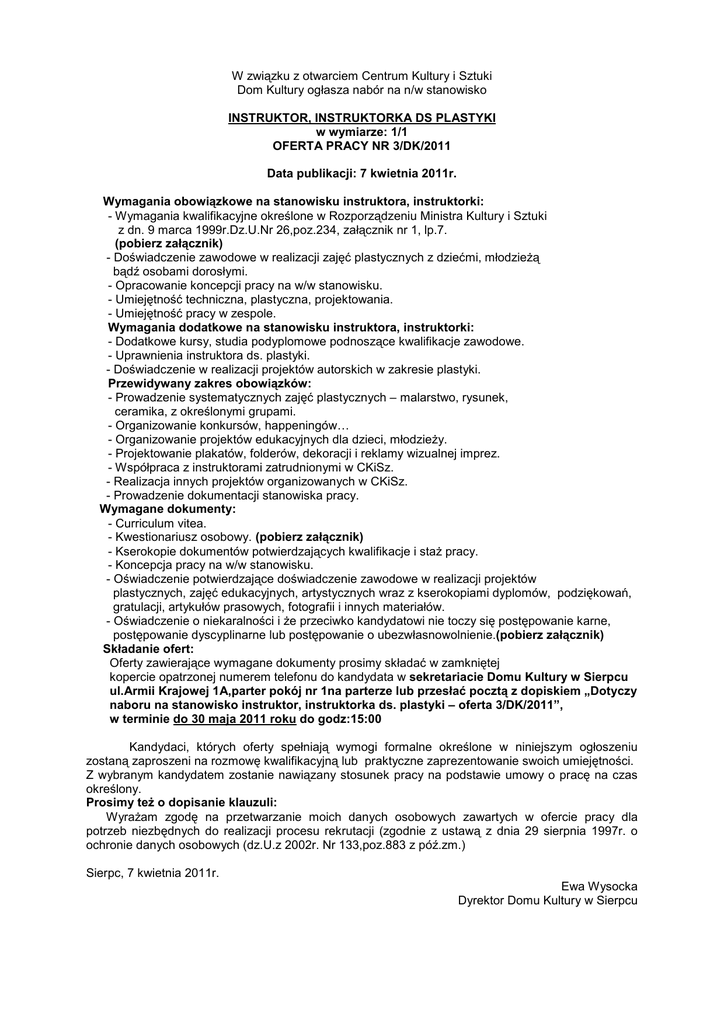 W związku z otwarciem Centrum Kultury i Sztuki Dom Kultury ogłasza nabór na n/w stanowisko INSTRUKTOR, INSTRUKTORKA DS PLASTYKI w wymiarze: 1/1 OFERTA PRACY NR 3/DK/2011 Data publikacji: 7 kwietnia 2011r. Wymagania obowiązkowe na stanowisku instruktora, instruktorki: - Wymagania kwalifikacyjne określone w Rozporządzeniu Ministra Kultury i Sztuki z dn. 9 marca 1999r.Dz.U.Nr 26,poz.234, załącznik nr 1, lp.7. (pobierz załącznik) - Doświadczenie zawodowe w realizacji zajęć plastycznych z dziećmi, młodzieŜą bądź osobami dorosłymi. - Opracowanie koncepcji pracy na w/w stanowisku. - Umiejętność techniczna, plastyczna, projektowania. - Umiejętność pracy w zespole. Wymagania dodatkowe na stanowisku instruktora, instruktorki: - Dodatkowe kursy, studia podyplomowe podnoszące kwalifikacje zawodowe. - Uprawnienia instruktora ds. plastyki. - Doświadczenie w realizacji projektów autorskich w zakresie plastyki. Przewidywany zakres obowiązków: - Prowadzenie systematycznych zajęć plastycznych – malarstwo, rysunek, ceramika, z określonymi grupami. - Organizowanie konkursów, happeningów… - Organizowanie projektów edukacyjnych dla dzieci, młodzieŜy. - Projektowanie plakatów, folderów, dekoracji i reklamy wizualnej imprez. - Współpraca z instruktorami zatrudnionymi w CKiSz. - Realizacja innych projektów organizowanych w CKiSz. - Prowadzenie dokumentacji stanowiska pracy. Wymagane dokumenty: - Curriculum vitea. - Kwestionariusz osobowy. (pobierz załącznik) - Kserokopie dokumentów potwierdzających kwalifikacje i staŜ pracy. - Koncepcja pracy na w/w stanowisku. - Oświadczenie potwierdzające doświadczenie zawodowe w realizacji projektów plastycznych, zajęć edukacyjnych, artystycznych wraz z kserokopiami dyplomów, podziękowań, gratulacji, artykułów prasowych, fotografii i innych materiałów. - Oświadczenie o niekaralności i Ŝe przeciwko kandydatowi nie toczy się postępowanie karne, postępowanie dyscyplinarne lub postępowanie o ubezwłasnowolnienie.(pobierz załącznik) Składanie ofert: Oferty zawierające wymagane dokumenty prosimy składać w zamkniętej kopercie opatrzonej numerem telefonu do kandydata w sekretariacie Domu Kultury w Sierpcu ul.Armii Krajowej 1A,parter pokój nr 1na parterze lub przesłać pocztą z dopiskiem „Dotyczy naboru na stanowisko instruktor, instruktorka ds. plastyki – oferta 3/DK/2011”, w terminie do 30 maja 2011 roku do godz:15:00 Kandydaci, których oferty spełniają wymogi formalne określone w niniejszym ogłoszeniu zostaną zaproszeni na rozmowę kwalifikacyjną lub praktyczne zaprezentowanie swoich umiejętności. Z wybranym kandydatem zostanie nawiązany stosunek pracy na podstawie umowy o pracę na czas określony. Prosimy teŜ o dopisanie klauzuli: WyraŜam zgodę na przetwarzanie moich danych osobowych zawartych w ofercie pracy dla potrzeb niezbędnych do realizacji procesu rekrutacji (zgodnie z ustawą z dnia 29 sierpnia 1997r. o ochronie danych osobowych (dz.U.z 2002r. Nr 133,poz.883 z póź.zm.) Sierpc, 7 kwietnia 2011r. Ewa Wysocka Dyrektor Domu Kultury w Sierpcu