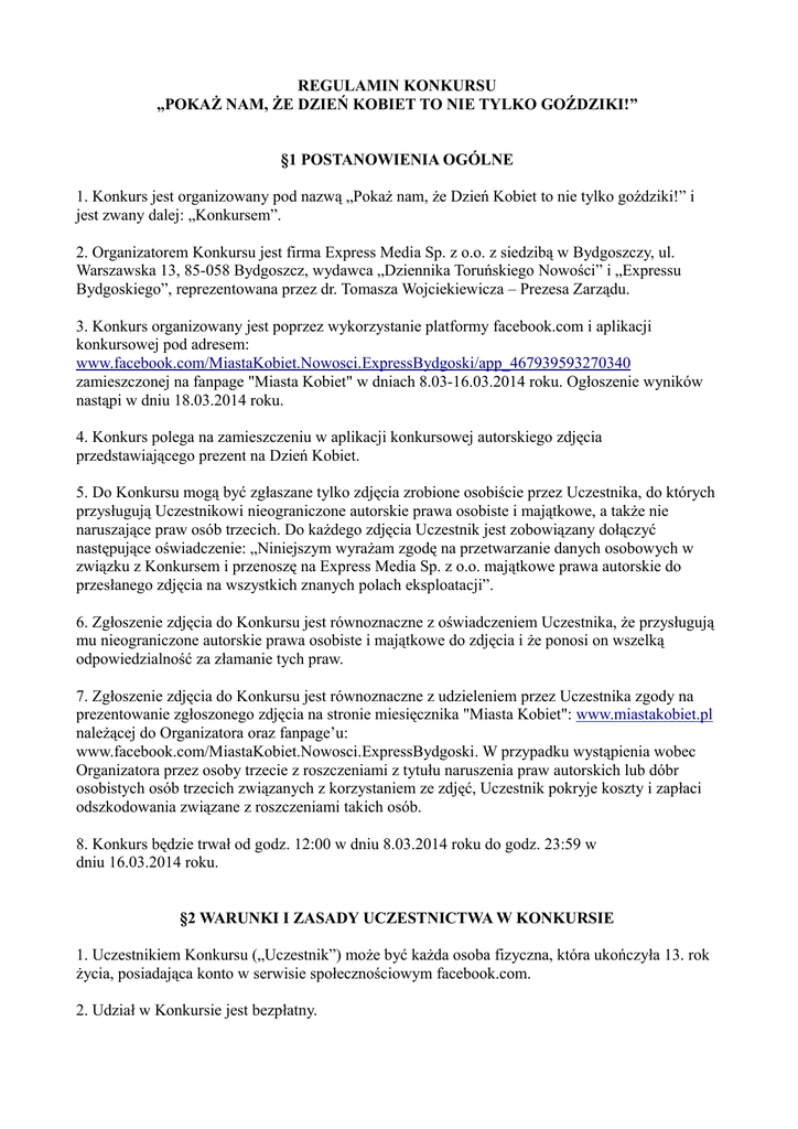 REGULAMIN KONKURSU „POKAŻ NAM, ŻE DZIEŃ KOBIET TO NIE TYLKO GOŹDZIKI!” §1 POSTANOWIENIA OGÓLNE 1. Konkurs jest organizowany pod nazwą „Pokaż nam, że Dzień Kobiet to nie tylko goździki!” i jest zwany dalej: „Konkursem”. 2. Organizatorem Konkursu jest firma Express Media Sp. z o.o. z siedzibą w Bydgoszczy, ul. Warszawska 13, 85-058 Bydgoszcz, wydawca „Dziennika Toruńskiego Nowości” i „Expressu Bydgoskiego”, reprezentowana przez dr. Tomasza Wojciekiewicza – Prezesa Zarządu. 3. Konkurs organizowany jest poprzez wykorzystanie platformy facebook.com i aplikacji konkursowej pod adresem: www.facebook.com/MiastaKobiet.Nowosci.ExpressBydgoski/app_467939593270340 zamieszczonej na fanpage "Miasta Kobiet" w dniach 8.03-16.03.2014 roku. Ogłoszenie wyników nastąpi w dniu 18.03.2014 roku. 4. Konkurs polega na zamieszczeniu w aplikacji konkursowej autorskiego zdjęcia przedstawiającego prezent na Dzień Kobiet. 5. Do Konkursu mogą być zgłaszane tylko zdjęcia zrobione osobiście przez Uczestnika, do których przysługują Uczestnikowi nieograniczone autorskie prawa osobiste i majątkowe, a także nie naruszające praw osób trzecich. Do każdego zdjęcia Uczestnik jest zobowiązany dołączyć następujące oświadczenie: „Niniejszym wyrażam zgodę na przetwarzanie danych osobowych w związku z Konkursem i przenoszę na Express Media Sp. z o.o. majątkowe prawa autorskie do przesłanego zdjęcia na wszystkich znanych polach eksploatacji”. 6. Zgłoszenie zdjęcia do Konkursu jest równoznaczne z oświadczeniem Uczestnika, że przysługują mu nieograniczone autorskie prawa osobiste i majątkowe do zdjęcia i że ponosi on wszelką odpowiedzialność za złamanie tych praw. 7. Zgłoszenie zdjęcia do Konkursu jest równoznaczne z udzieleniem przez Uczestnika zgody na prezentowanie zgłoszonego zdjęcia na stronie miesięcznika "Miasta Kobiet": www.miastakobiet.pl należącej do Organizatora oraz fanpage’u: www.facebook.com/MiastaKobiet.Nowosci.ExpressBydgoski. W przypadku wystąpienia wobec Organizatora przez osoby trzecie z roszczeniami z tytułu naruszenia praw autorskich lub dóbr osobistych osób trzecich związanych z korzystaniem ze zdjęć, Uczestnik pokryje koszty i zapłaci odszkodowania związane z roszczeniami takich osób. 8. Konkurs będzie trwał od godz. 12:00 w dniu 8.03.2014 roku do godz. 23:59 w dniu 16.03.2014 roku. §2 WARUNKI I ZASADY UCZESTNICTWA W KONKURSIE 1. Uczestnikiem Konkursu („Uczestnik”) może być każda osoba fizyczna, która ukończyła 13. rok życia, posiadająca konto w serwisie społecznościowym facebook.com. 2. Udział w Konkursie jest bezpłatny. 3. Uczestnictwo w Konkursie polega na wypełnieniu wskazanych w niniejszym Regulaminie zadań. Uczestnicy mają obowiązek przestrzegania wszystkich obowiązujących przepisów prawa, niniejszego Regulaminu oraz powszechnie przyjętych zasad fair play. 4. Aby wzi ąć udział w konkursie należy: a) polubić fanpage „Miast Kobiet”: https://www.facebook.com/MiastaKobiet.Nowosci.ExpressBydgoski; b) w dniach 8.03-16.03.2014 roku zamieścić w aplikacji konkursowej autorskie zdjęcie przedstawiające prezent na Dzień Kobiet. Każdy Uczestnik Konkursu może dodać maksymalnie 3 fotografie. Każde zdjęcie powinno zawierać opis prezentu jaki przedstawia. §3 ETAPY KONKURSU 1. Konkurs podzielony jest na dwa etapy. I) Etap 1: Zgłoszenia konkursowe i głosowanie publiczności a) zgłoszenie autorskiego zdjęcia przedstawiającego prezent na Dzień Kobiet wraz z opisem prezentu, przy użyciu aplikacji: www.facebook.com/MiastaKobiet.Nowosci.ExpressBydgoski/app_467939593270340, w dniach 8.03-16.03.2014 roku. b) Uczestnik podaje swoje imię, nazwisko, adres e-mail; dane będą wykorzystane jedynie w celu poinformowania Uczestnika o zwycięstwie oraz podania informacji prasowych odnośnie konkursu. c) Każdy Uczestnik może zgłosić do Konkursu maksymalnie trzy propozycje. d) Głosowanie użytkowników portalu facebook.com na najlepsze zdjęcie. Termin zgłoszeń jest jednocześnie czasem głosowania. e) Głosowanie odbędzie się poprzez fanpage miesięcznika „Miasta Kobiet” na portalu facebook.com, przy użyciu załączonej aplikacji konkursowej: www.facebook.com/MiastaKobiet.Nowosci.ExpressBydgoski/app_467939593270340. Każdy, kto zostanie fanem „Miast Kobiet” będzie mógł w trakcie trwania konkursu raz oddać głos na jedno zdjęcie. f) Głosowanie zostanie zakończone 16.03.2014 roku, o godz. 23:59. II) Etap 2: Wybór zwycięzców a) Wytypowanie zwycięzcy nagrody publiczności. Osobie, której zdjęcie zbierze największą liczbę głosów-polubień zostanie przyznana nagroda - voucher do jubilera "Karkosik". b) Wyłonienie dwóch zwycięzców nagród jury. Wyboru dokona jury spośród zgłoszeń, które w 1 etapie zebrały minimum 8 głosów-polubień. Autorzy dwóch najlepszych zdjęć otrzymają bony do Kliniki "SKIN-MED". 2. Ogłoszenie wyników na portalu facebook.com, na fanpage'u miesięcznika "Miasta Kobiet" nastąpi 18.03.2014 r. o godz. 13:00. Lista zwycięzców pojawi się w zakładce „WYNIKI KONKURSU”, która będzie wyświetlana do 30.04.2014 roku. §4 NAGRODY 1. Nagrodą jury jest bon do Kliniki "SKIN-MED" . 2. Nagrodę jury otrzymają dwie osoby, którą wskaże jury. Jury weźmie pod ocenę zgłoszenia, które w 1 etapie zebrały minimum 8 głosów-polubień. Jury obraduje w składzie: Emilia Iwanciw – przedstawiciel „Express Media Sp. z o.o.” Lucyna Tataruch – przedstawiciel „Express Media Sp. z o.o.” Karolina Żakowicz – przedstawiciel „Express Media Sp. z o.o.” Urszula Sęczyk-Bonczkowska – nadzór techniczny konkursów na fanpage'u „Miast Kobiet” 3. Nagrodą publiczności jest bon do jubilera "Karkosik" 4. Nagrodę publiczności otrzyma osoba, której zdjęcie zebrało w 1 etapie największą liczbę głosówpolubień. 5. W przypadku takiej samej liczby głosów na więcej propozycji, zwycięzcę wyłoni komisja 